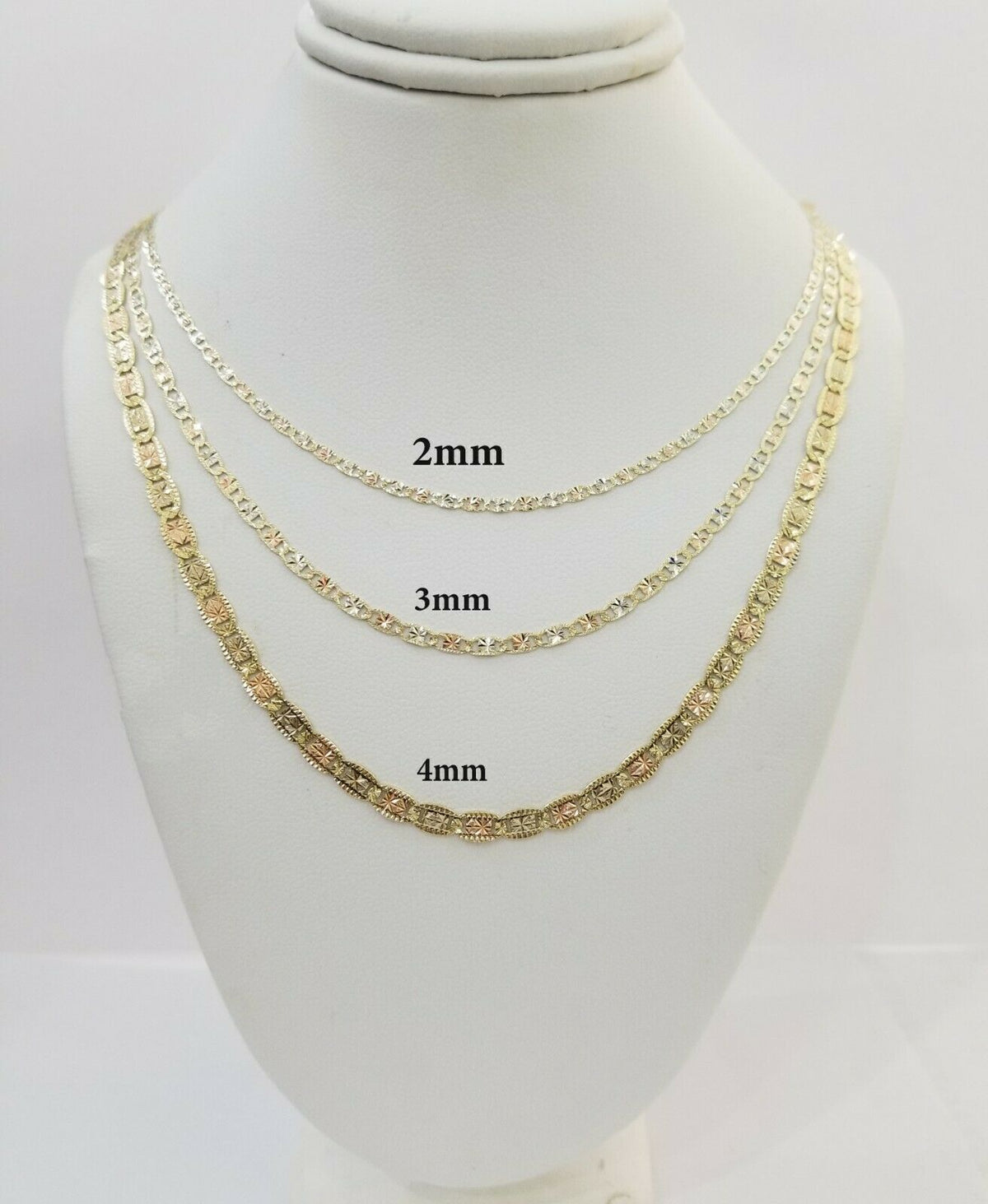 14 k Trio-color Gold Ladies necklace/ chain. It is not plated, or filled or overlaid . It is 100% Genuine 14 k Gold. The Width of the necklace is 4 MM and Various Length stating From 18 Inches - 26 Inches. The Clasp is lobster. The chain is considered durable. If you are not happy with the way it looks or feels, we do offer 30 - Days FREE Return shipping. Contact us for more information.
