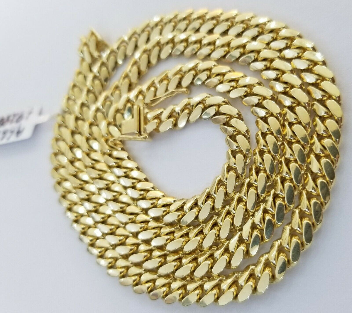 Solid 14 KT Yellow Gold ( Real , Not plated , Not filled ) Miami Cuban Cuban Link chain. The Width of the necklace is 6 MM in Length 22 Inches. The Clasp is Box Lock. The chain is considered durable because is is Heavy Solid with approximately 58-60 grams . If you are not happy with the way it looks or feels, we do offer