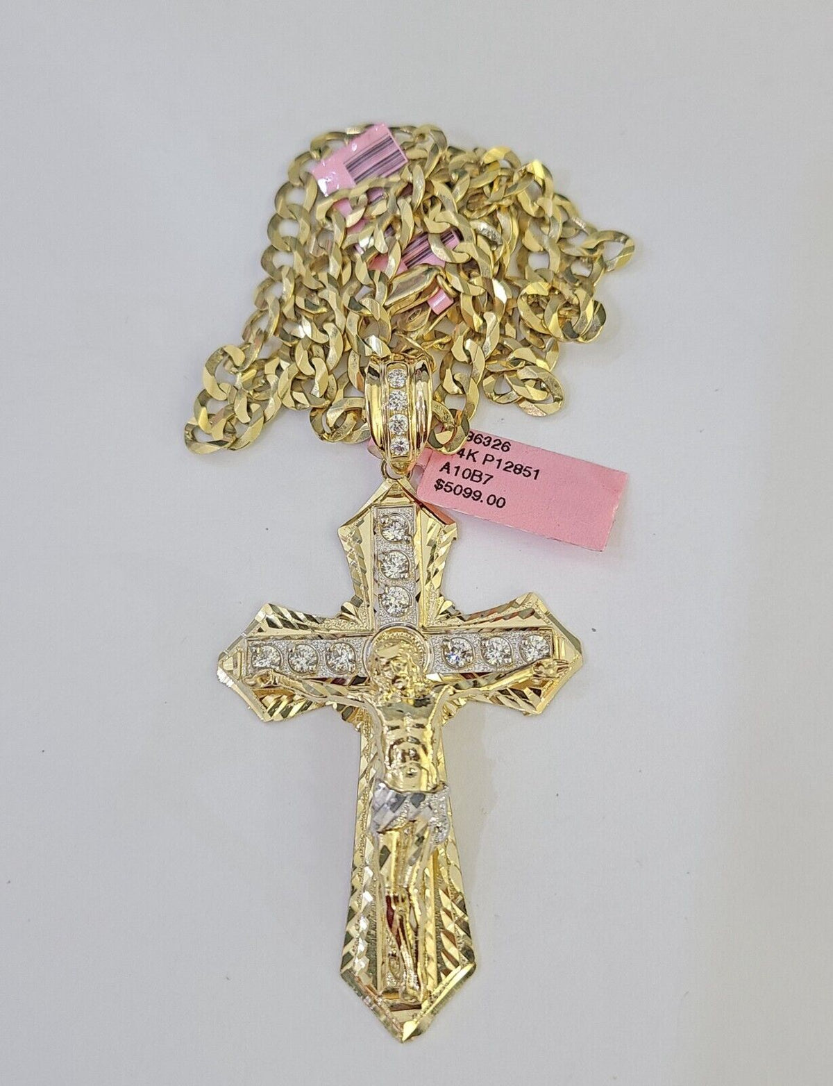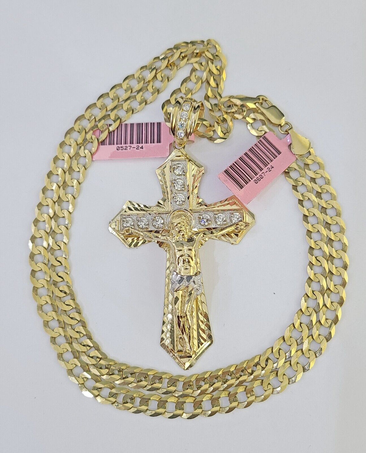 We present You with This Absolutely Stunning Real 14k Yellow Gold SOLID Cuban Curb link Chain Diamond cuts with Jesus Cross Charm. It has a detailed cut with a very good finish. These Beautiful Chains will not tarnish, discolor, or fade because they are Pure 14K Gold. Please feel free to contact us if you have any queries regarding the item. 24"-A19B9 A10B7