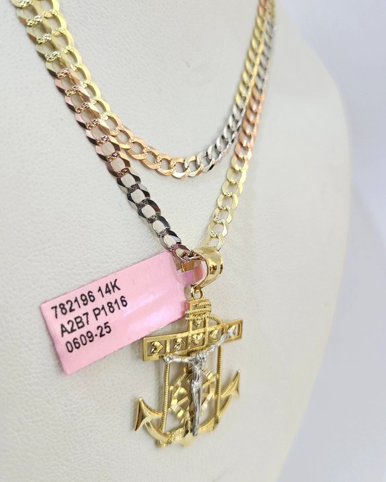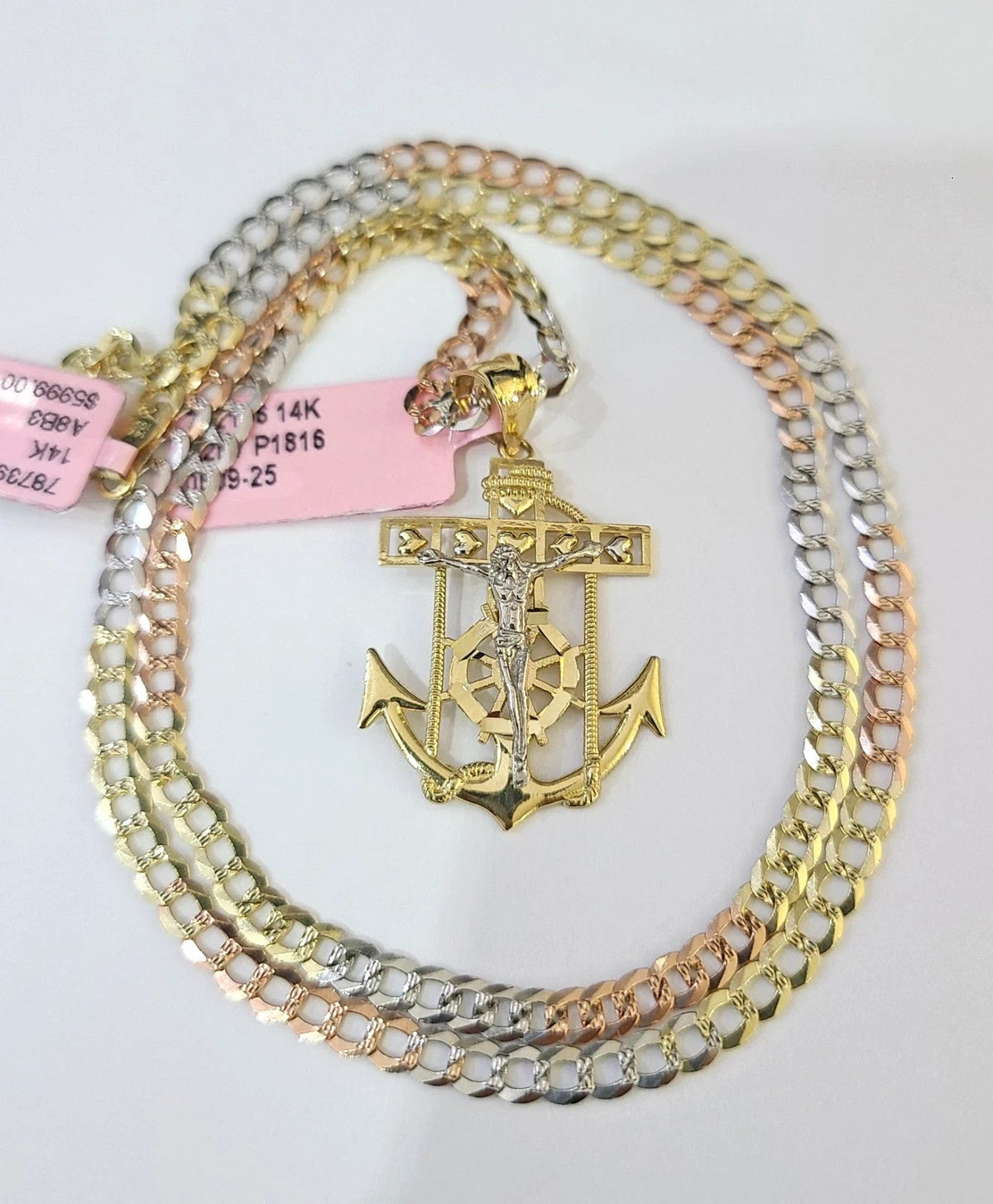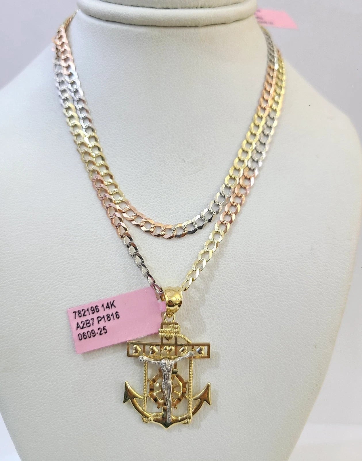 14k Chain Jesus Anchor Pendant Solid TriColor Cuban Curb Link 4mm 18"-28" Inch