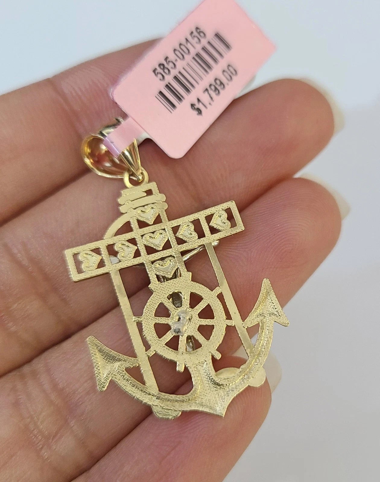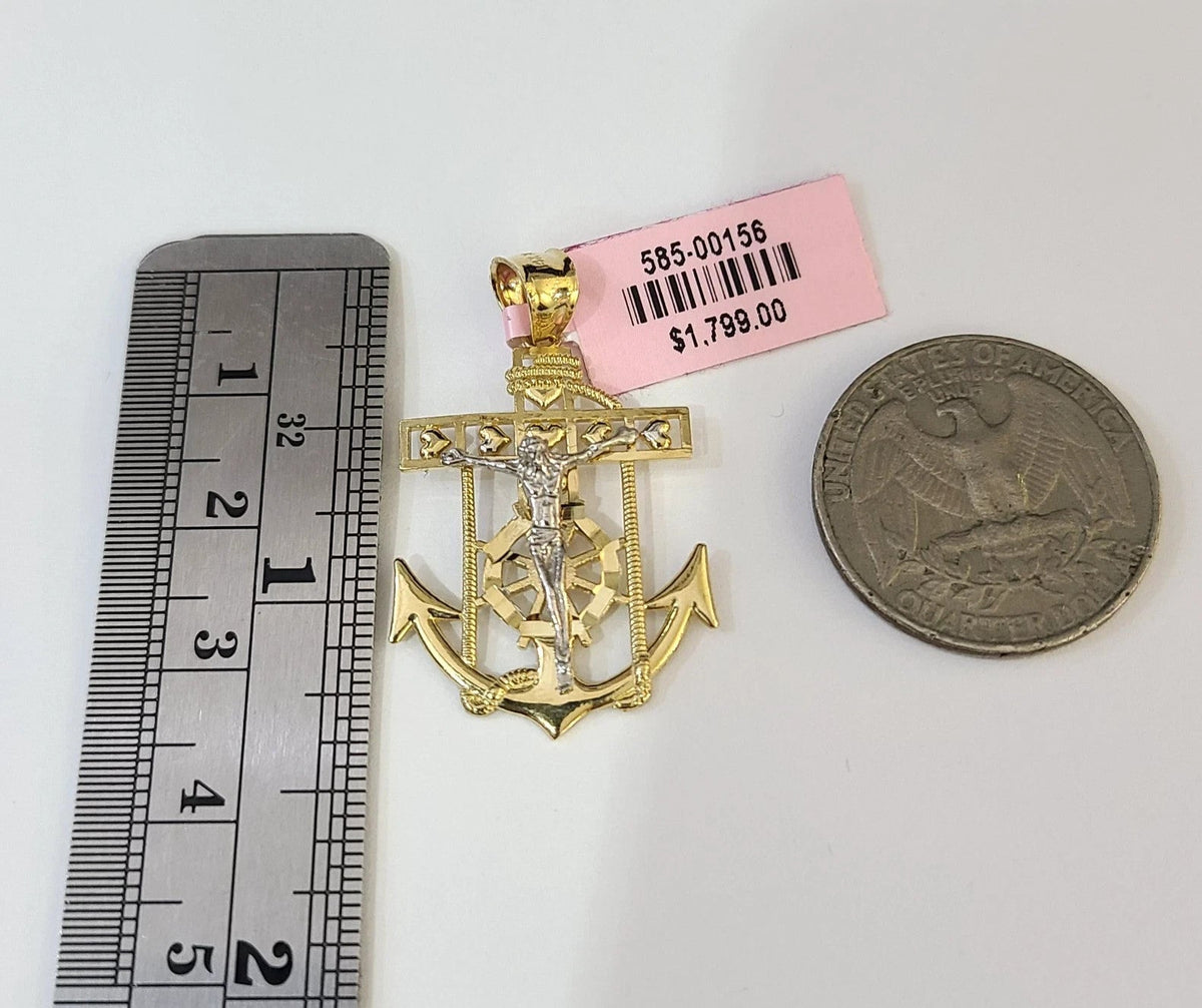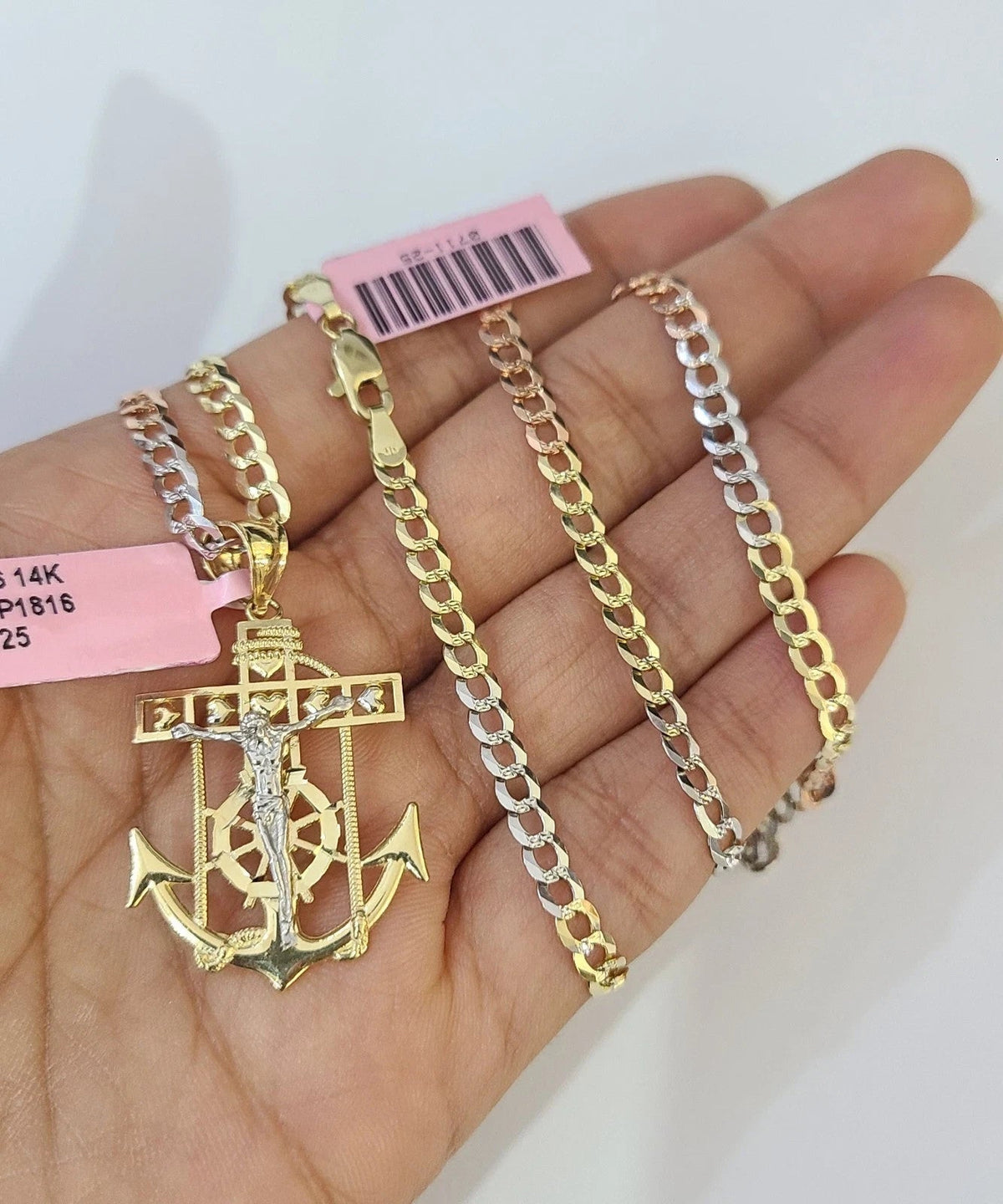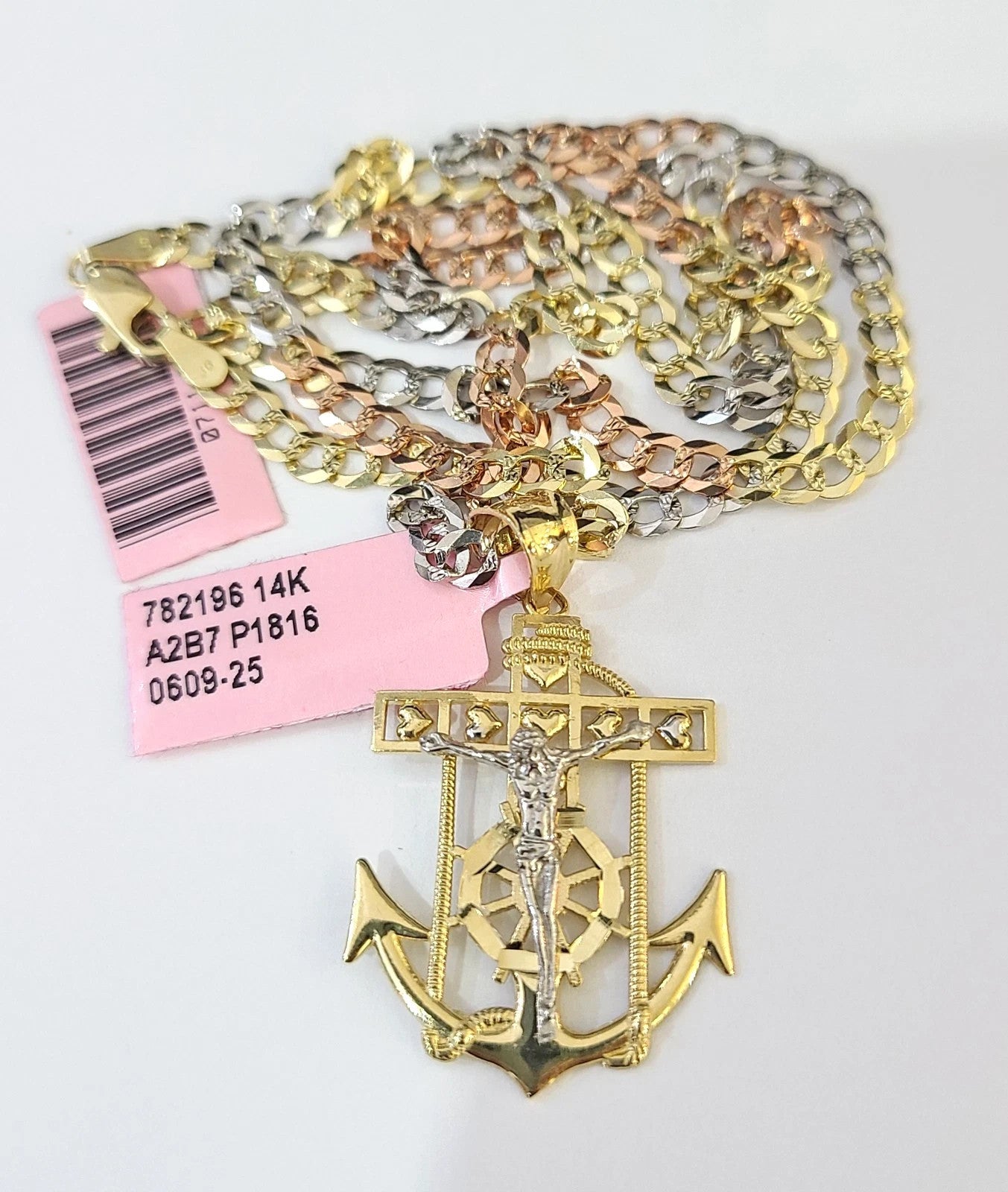 14k Chain Jesus Anchor Pendant Solid TriColor Cuban Curb Link 4mm 18"-28" Inch