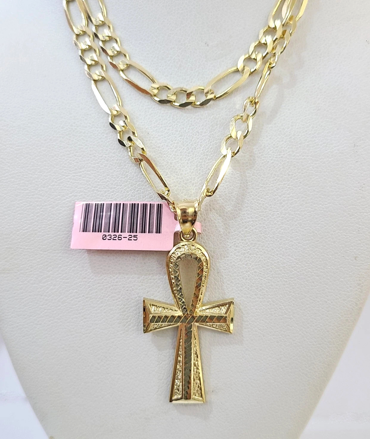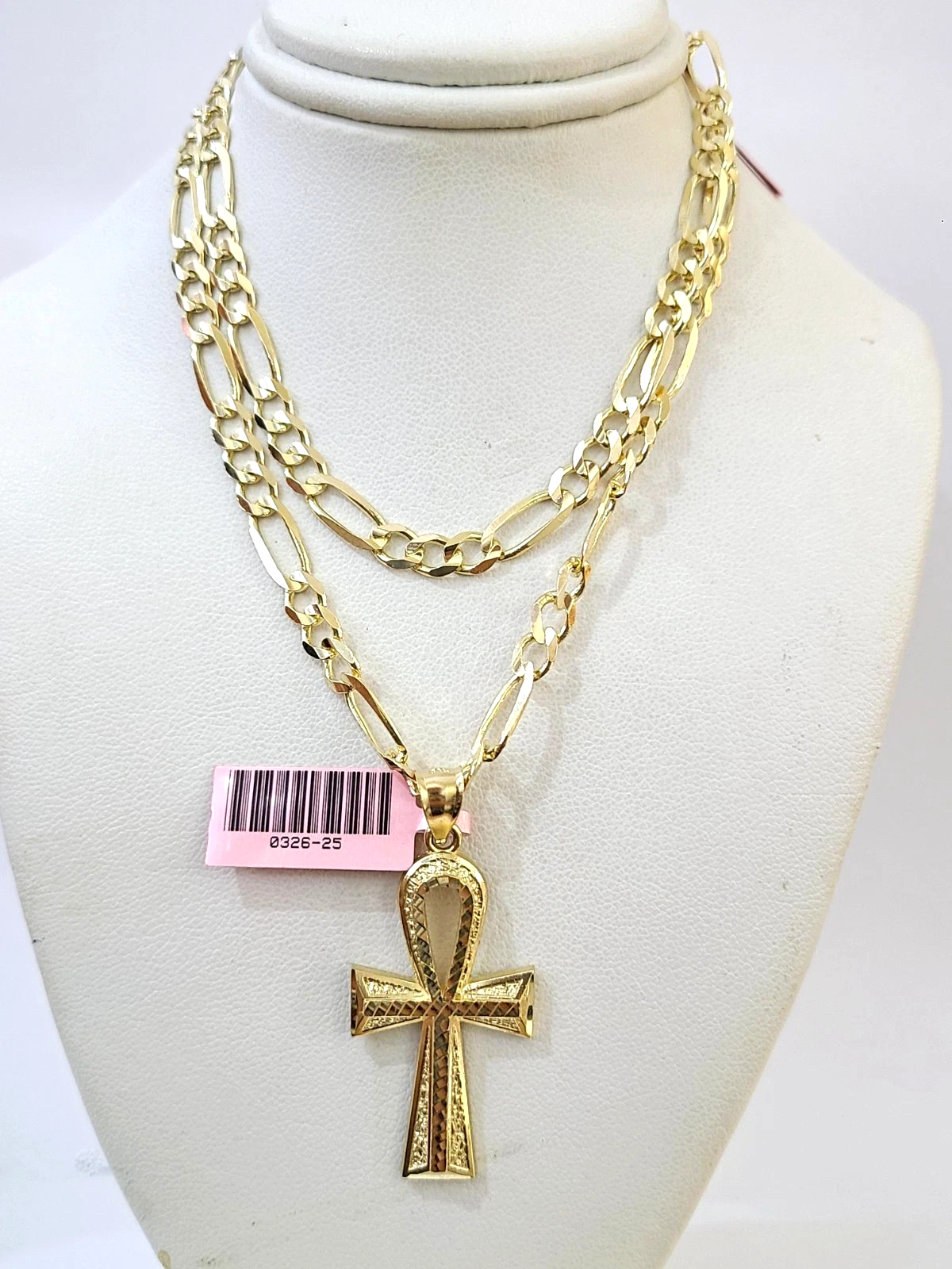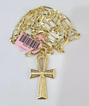 Real 14k Solid Figaro Chain Ankh Jesus Cross Pendant Gold 5mm 18-28 inch SET Necklace