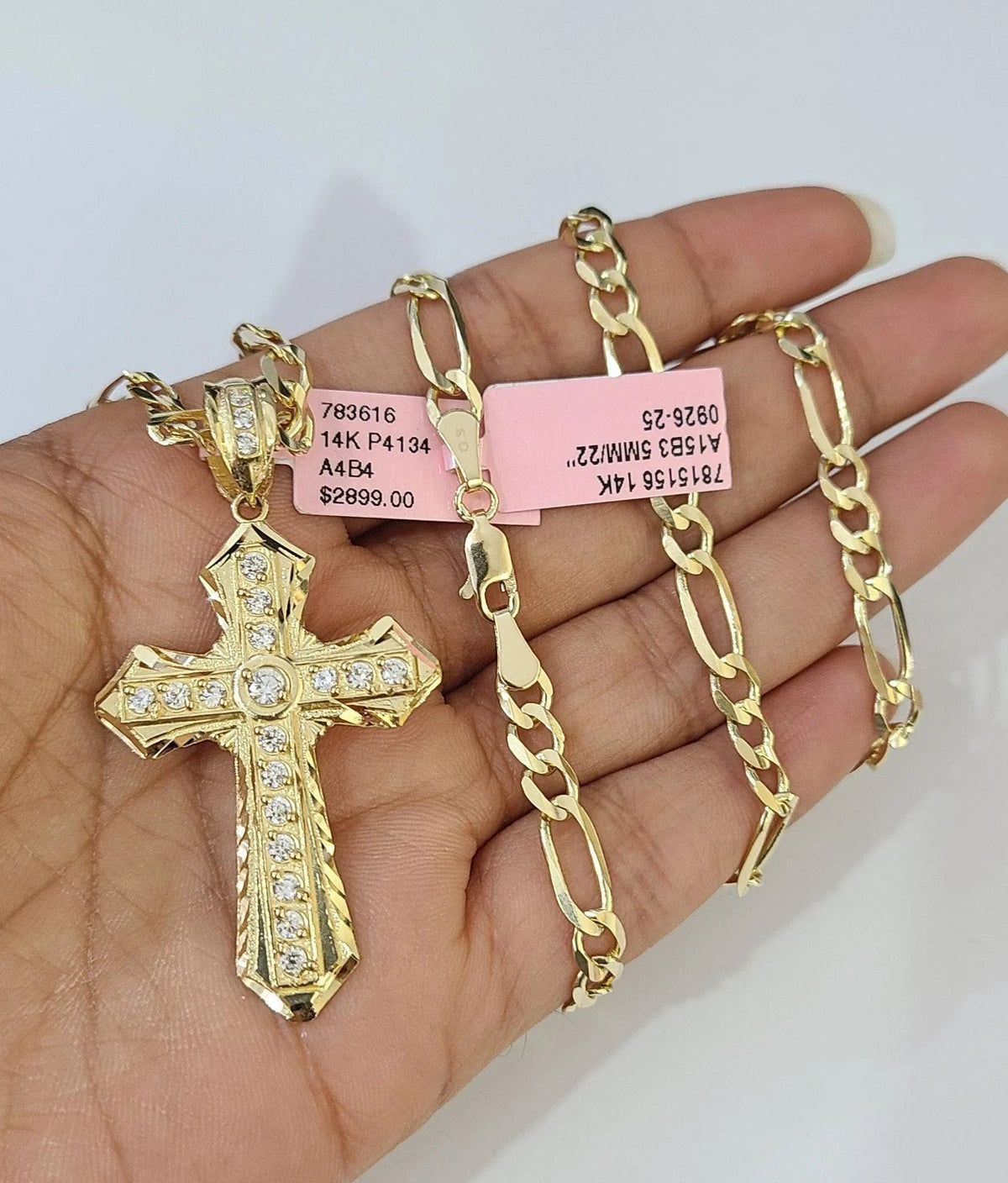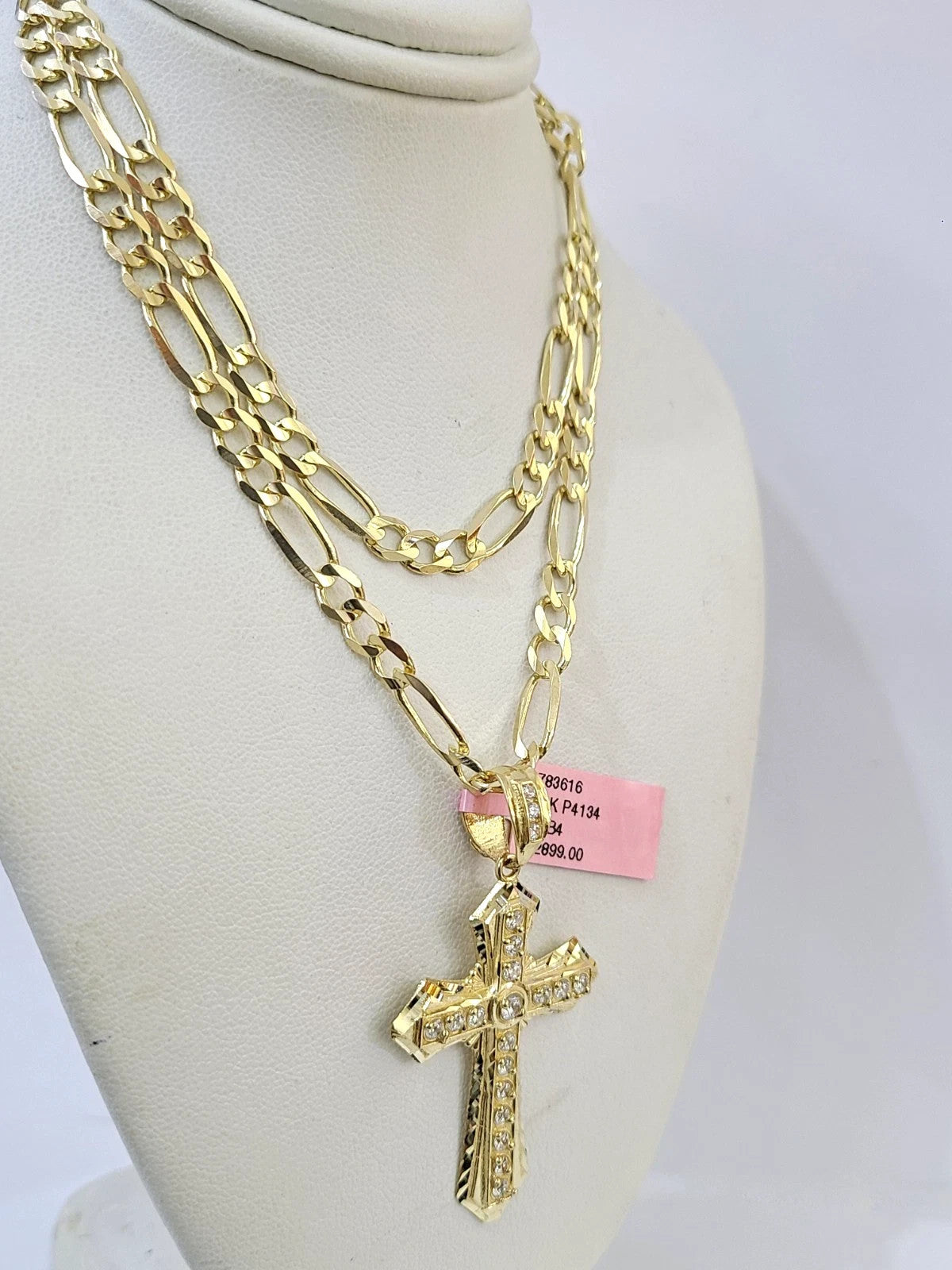 Is Presenting You with This Beautifully Designed Real 14k Yellow Gold Jesus Cross Charm Pendant with 14k 5mm Figaro Chain in various lengths. Please feel free to contact us if you have any queries regarding the item. These Beautiful chains and pendants will not tarnish, discolor, or fade because they are Pure 14K Gold. 22"-A15B3, A4B4 P4134