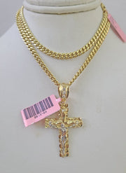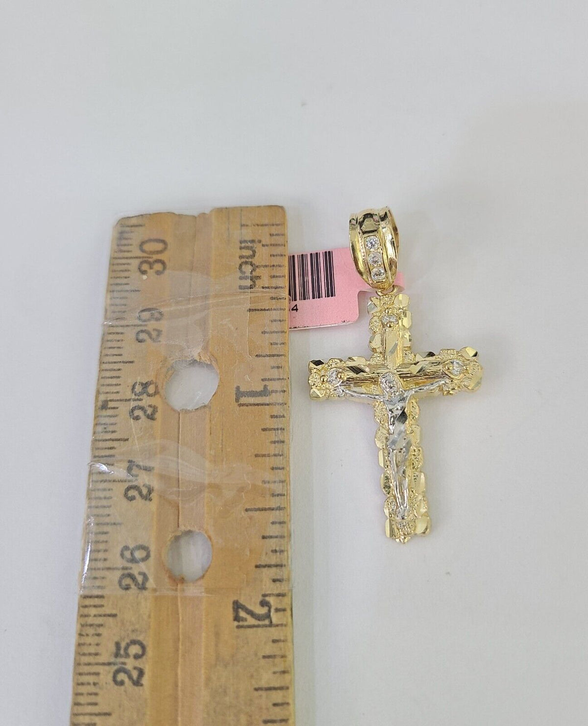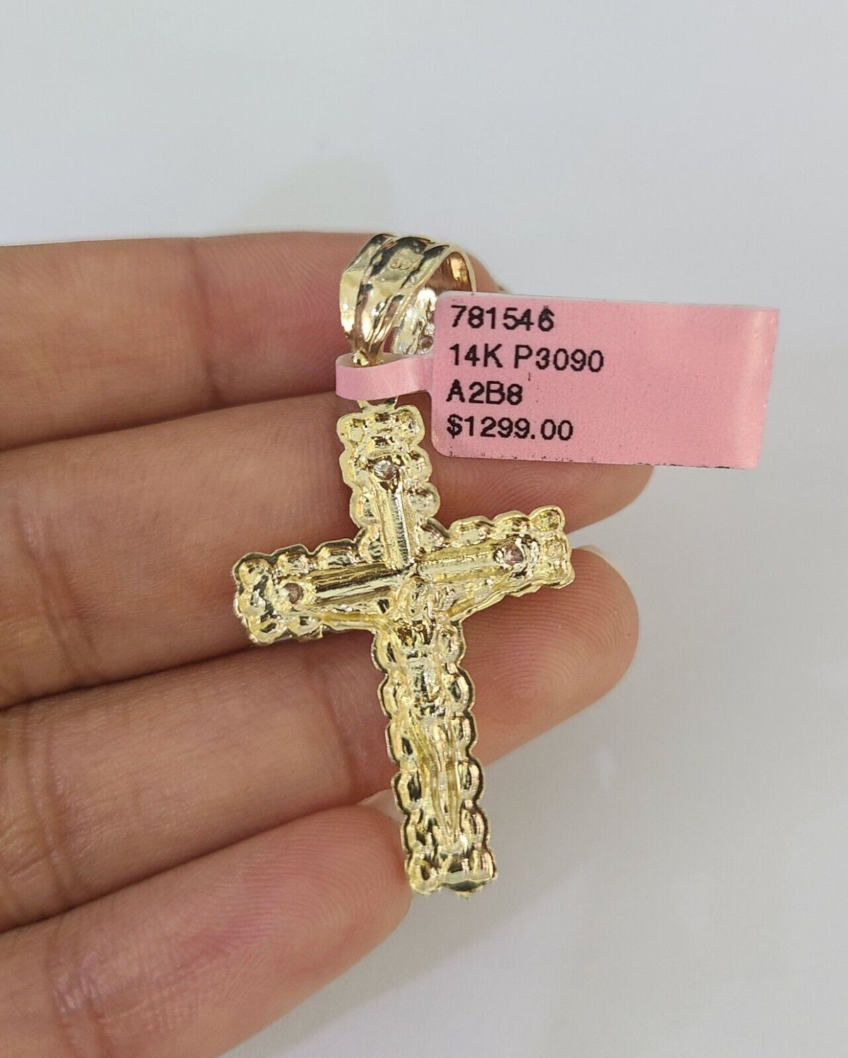 Is Presenting You with This Absolutely Stunning Real 14k Yellow Gold Miami Cuban Link Chain 4mm, 18 inch- 28 inches, Lobster Lock with a 14k Jesus Cross Charm Pendant.. These Beautiful chains and Pendant will not tarnish, discolor, or fade because they are Pure 14K Gold. We also have them in various another length and sizes. 18"-A7B5 A2B8