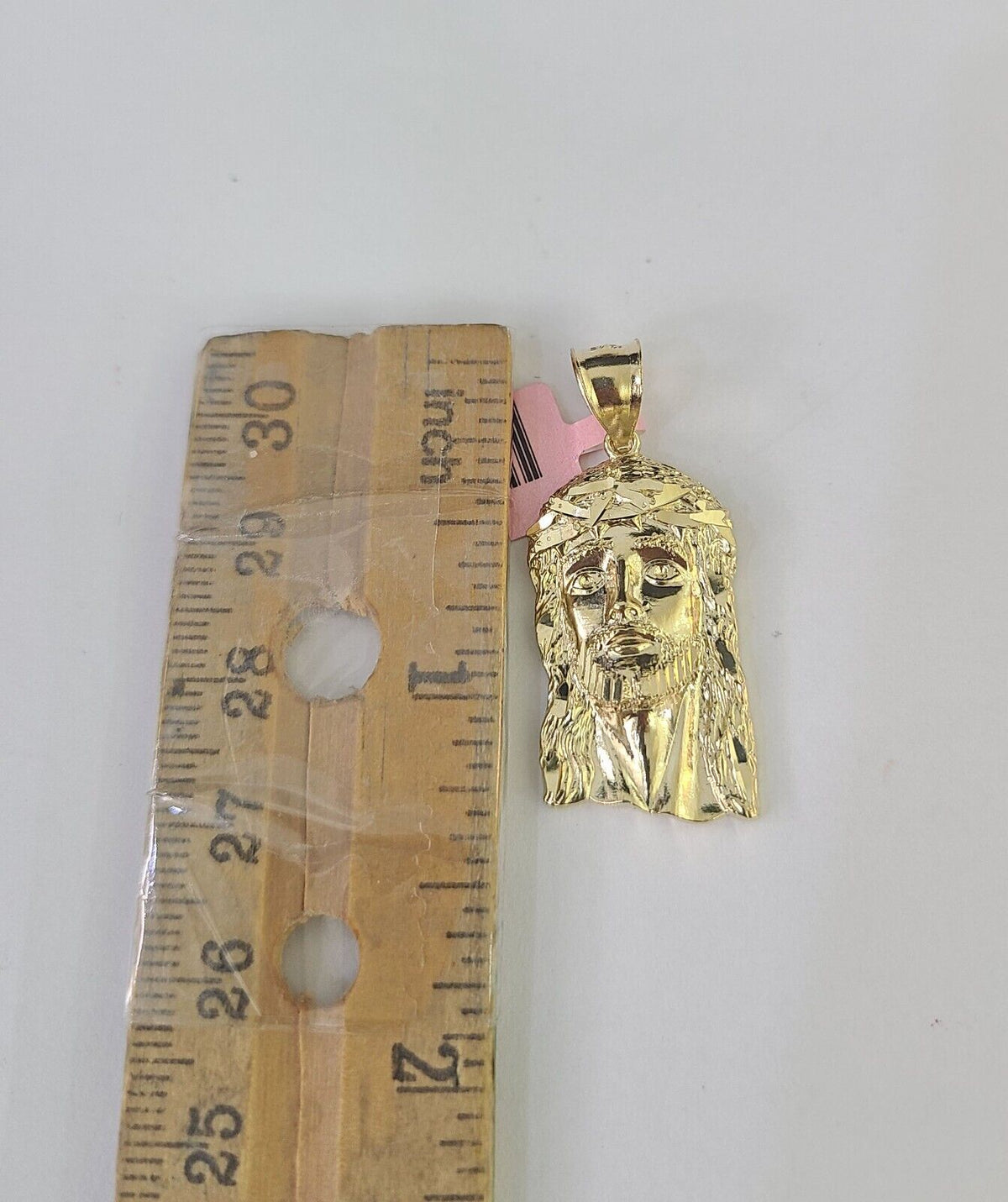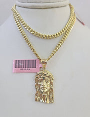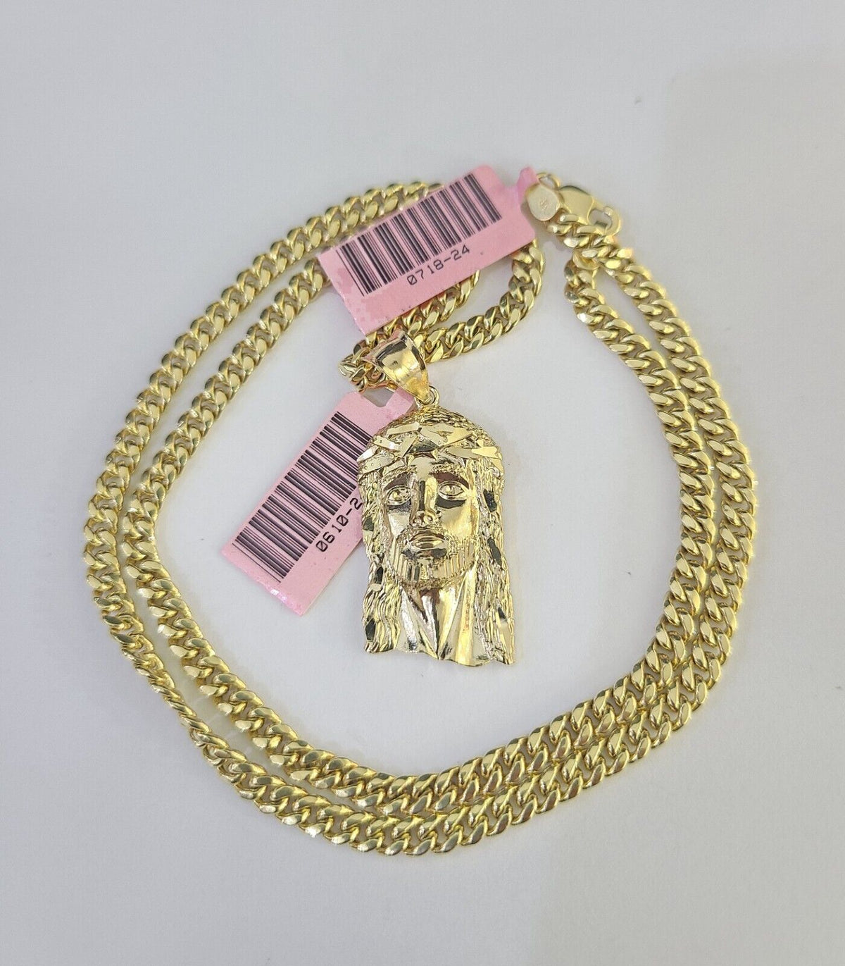 Is Presenting You with This Absolutely Stunning Real 14k Yellow Gold Miami Cuban Link Chain 4mm, 18 inch- 28 inches, Lobster Lock with a 14k Jesus Head Charm Pendant.These Beautiful chains and Pendant will not tarnish, discolor, or fade because they are Pure 14K Gold. We also have them in various another length and sizes. 18"-A7B5 A3B0