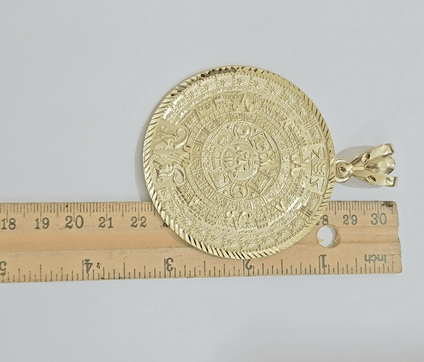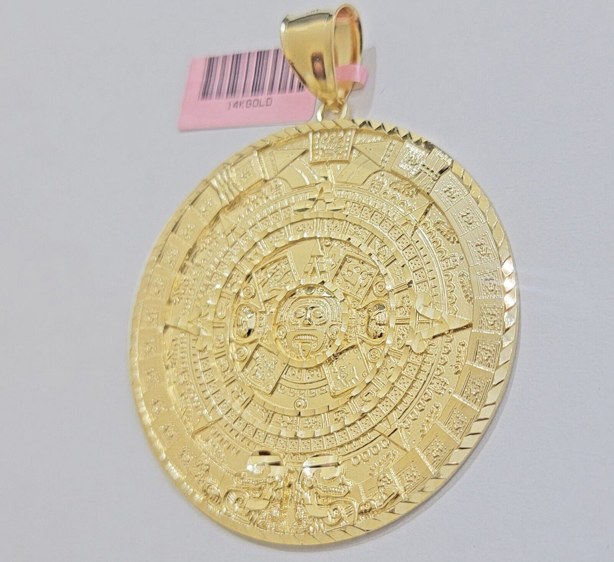 SOLID Real 14kt Yellow Gold Pendant Aztec Mayan Calendar Men's Charm Medallion, 3.25" Men's Round Charm