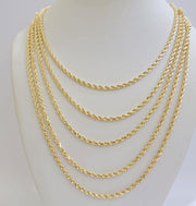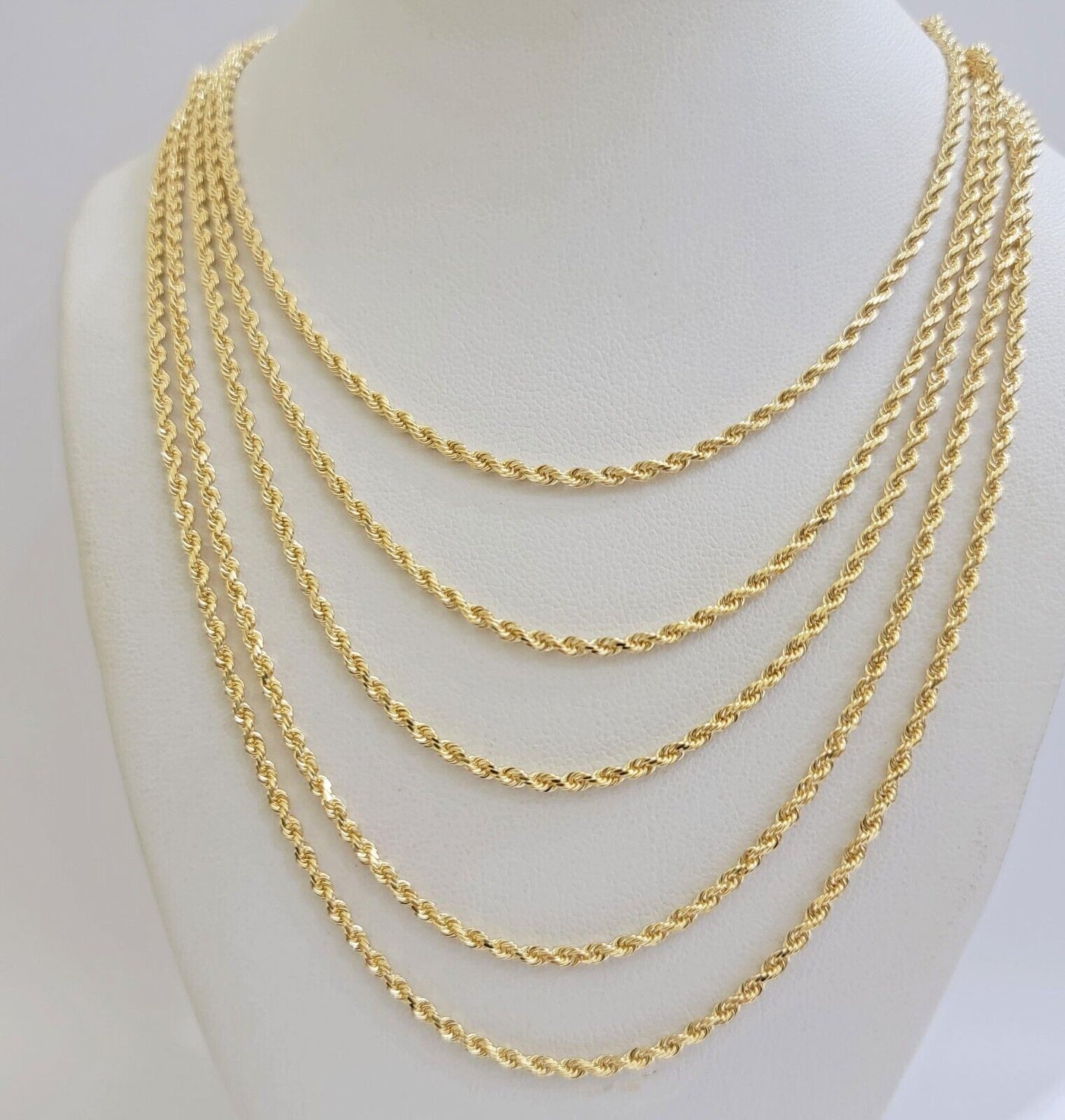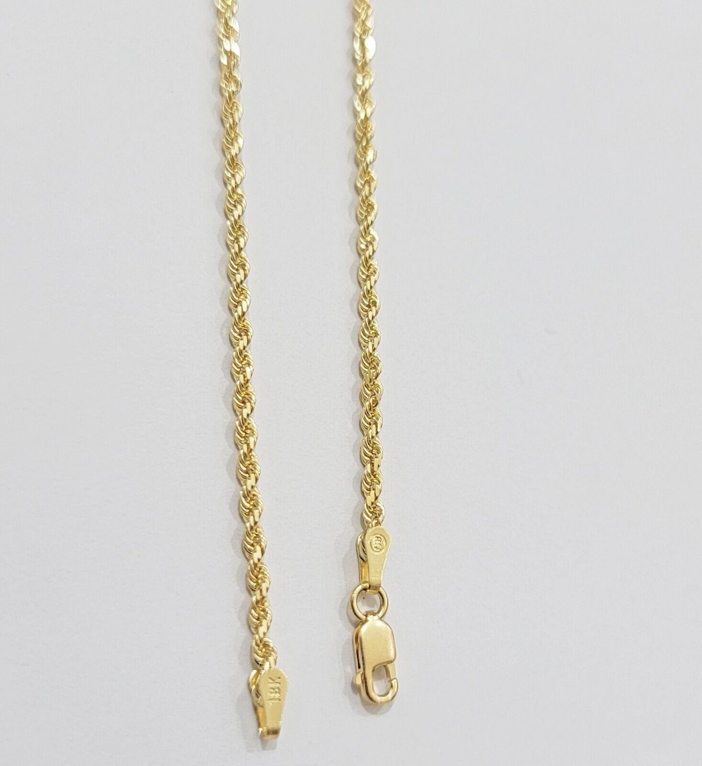 Real 18 k Yellow Gold Rope Necklace chain. The Width of the necklace is 2mm and Various Length starting From 16 Inches - 24 Inches. The Clasp is lobster. The chain can be worn with the pendants. If you are not happy with the way it looks or feels, we do offer 30 - Days FREE Return shipping. Contact us for more information.