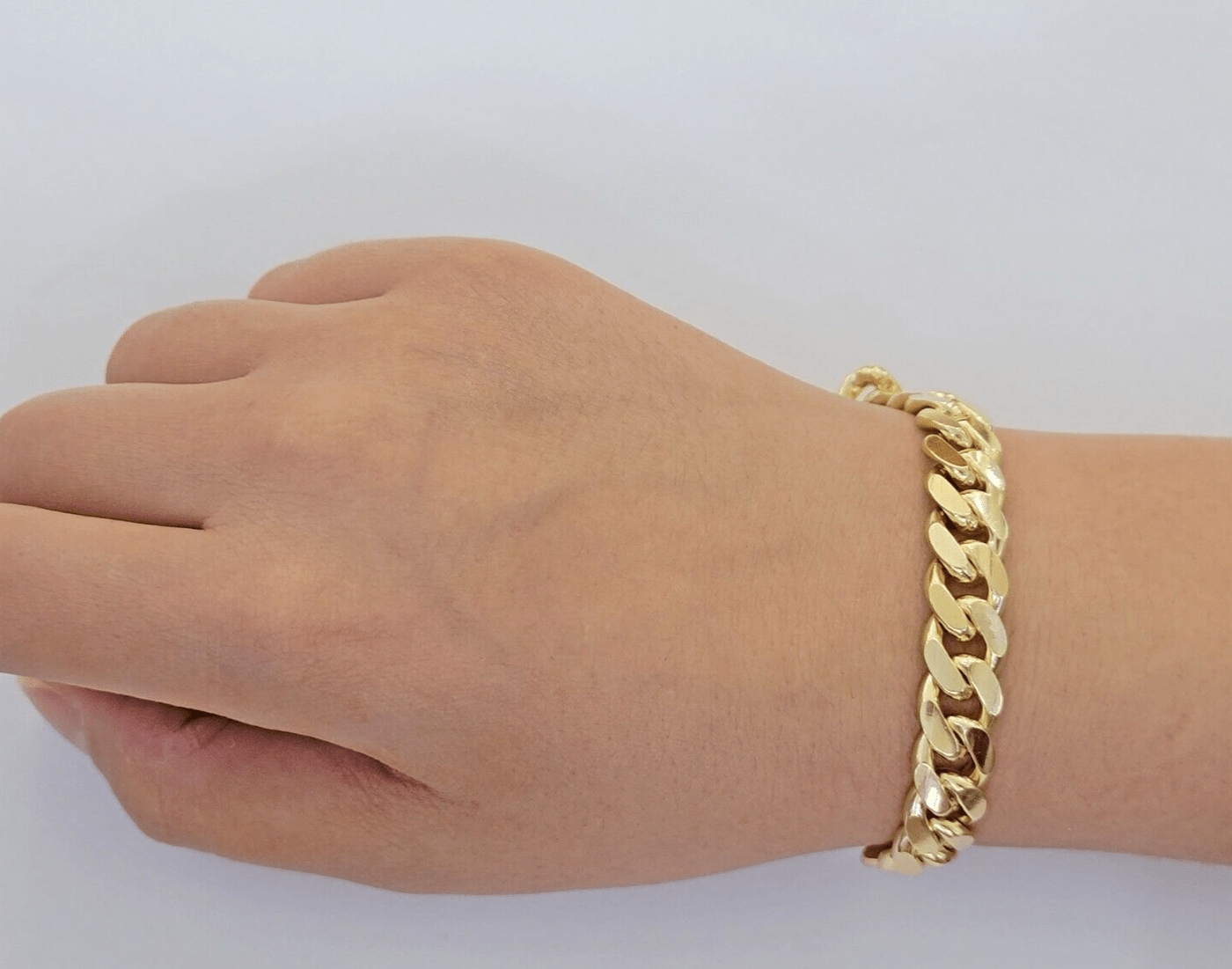 SOLID 10 K Yellow Gold ( Real , Not plated , Not filled ) Miami Cuban-Link Bracelet For Men's. The Width of the Bracelet is 11 mm (approx.) and 8 Inch Long . The Clasp is Box Lock which is strong and safe lock for the bracelet. The bracelet is beautiful designed with Cuban-Link style. If you are not happy with the way it looks or feels, we do offer free return. Buyers need to make sure that the return item has to be in its original sent/ brand new condition with original tag attached. Violation in return policy might result in negative consequence.