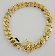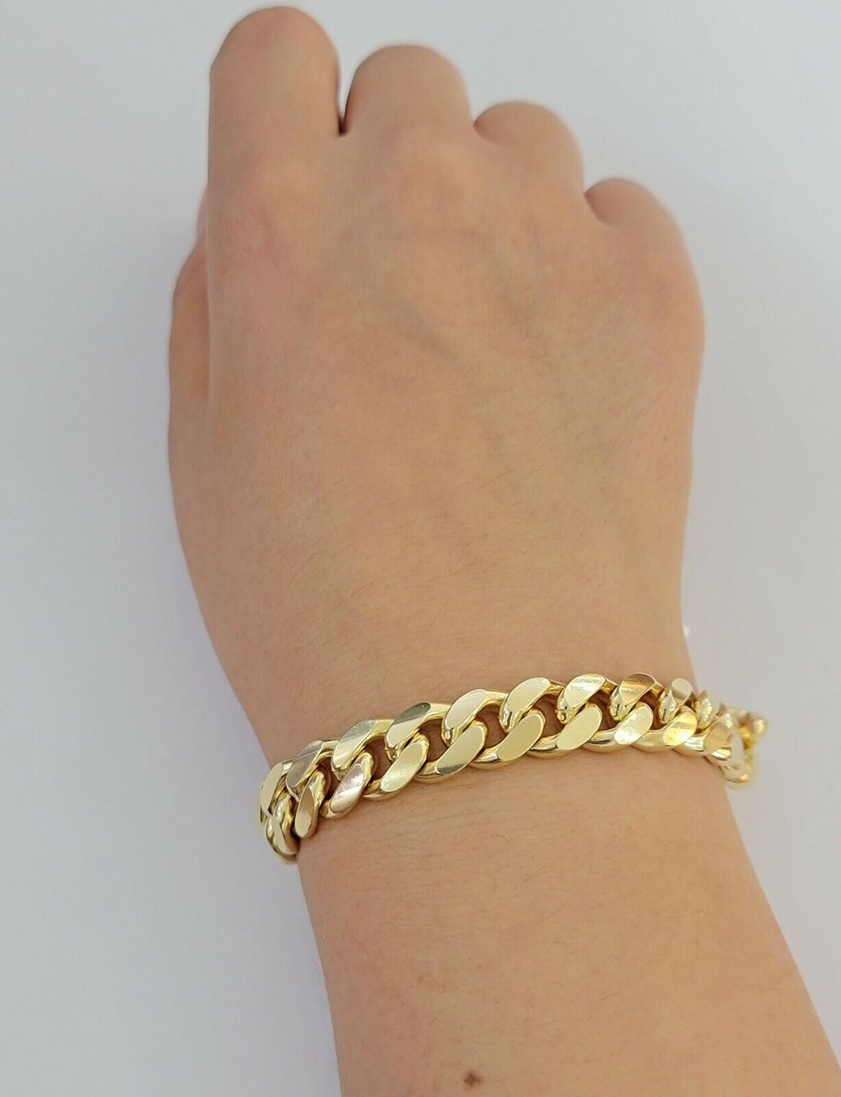 SOLID 10 K Yellow Gold ( Real , Not plated , Not filled ) Miami Cuban-Link Bracelet For Men's. The Width of the Bracelet is 11 mm (approx.) and 9 Inch Long . The Clasp is Box Lock which is strong and safe lock for the bracelet. The bracelet is beautiful designed with Cuban-Link style. If you are not happy with the way it looks or feels, we do offer free return. Buyers need to make sure that the return item has to be in its original sent/ brand new condition with original tag attached. Violation in return policy might result in negative consequence.