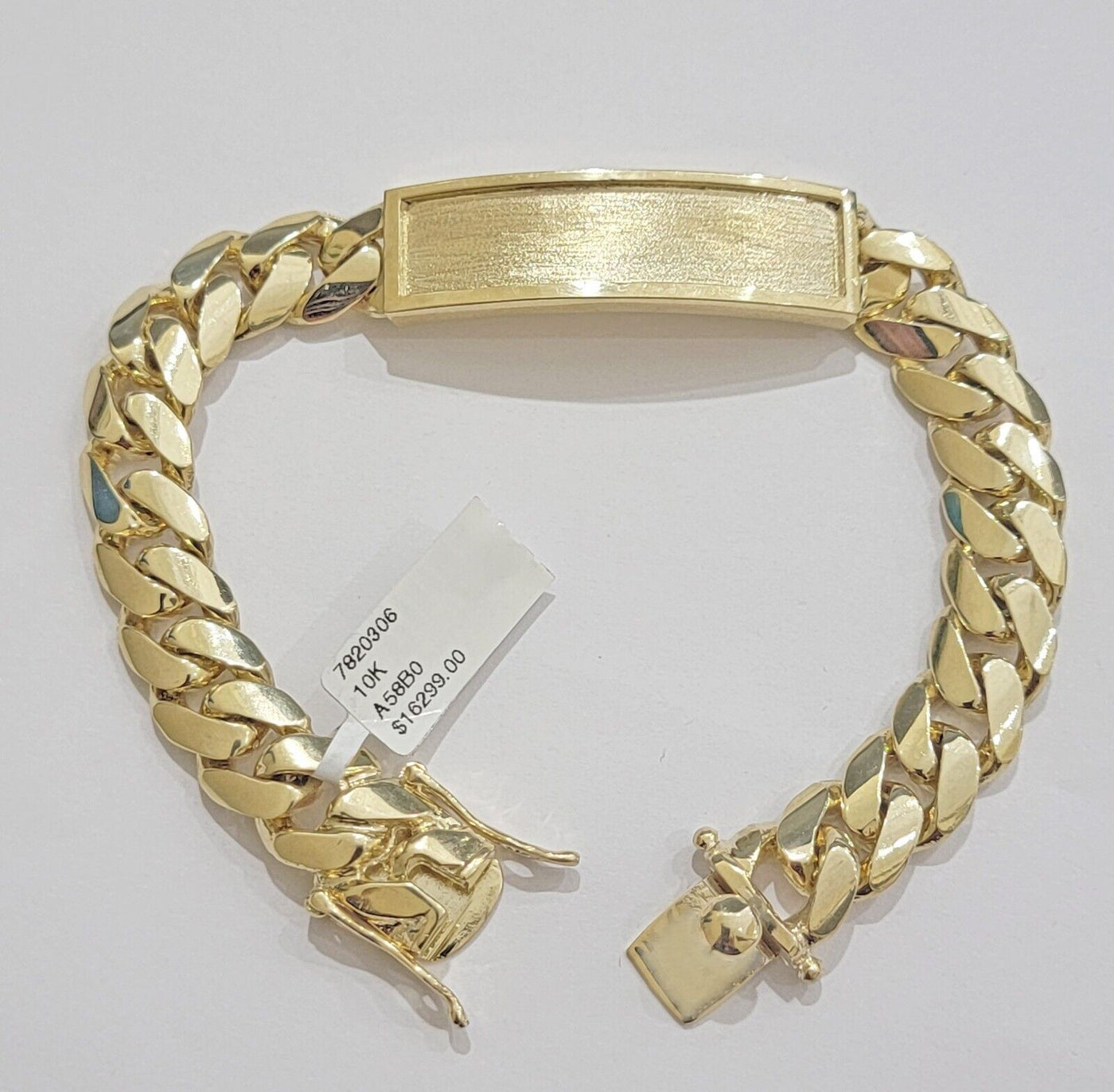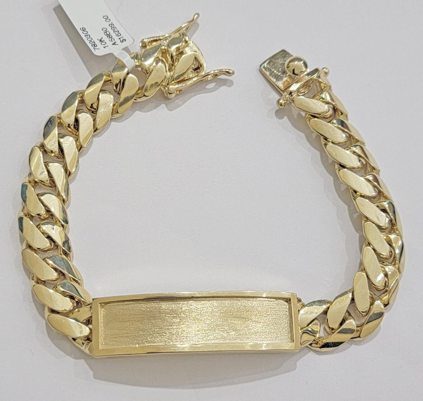 Solid 10 K Yellow Gold ( Real , Not plated , Not filled ) Miami Cuban-Link ID Bracelet For Men's. The Width of the Bracelet is 12 mm ( approx.)and 13mm ID plate 8.5 Inch Long. The Clasp is Box Lock which is strong. The bracelet is beautiful designed with Cuban-Link style. If you are not happy with the way it looks or feels, we do offer 30 - Days FREE Return shipping.