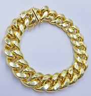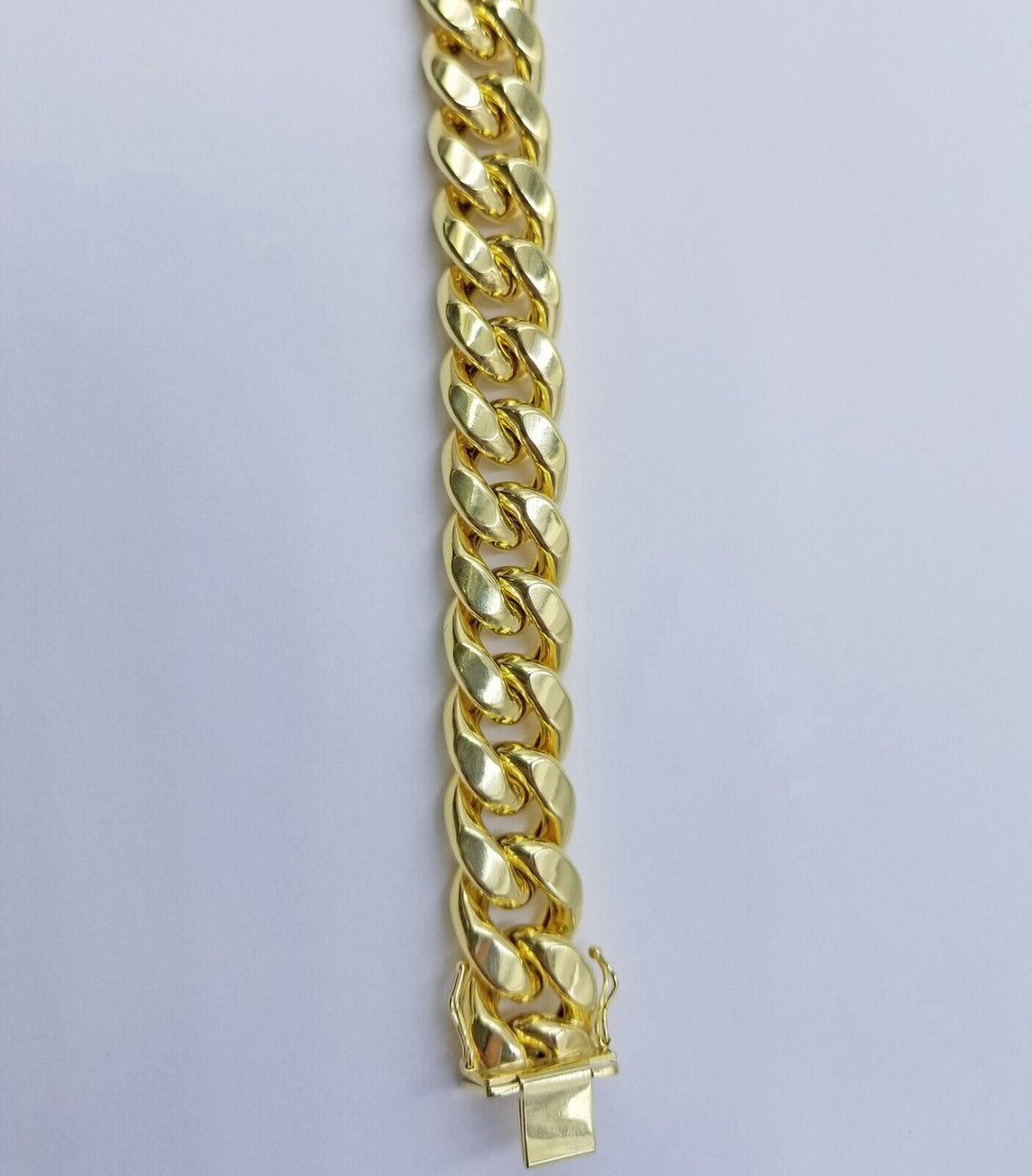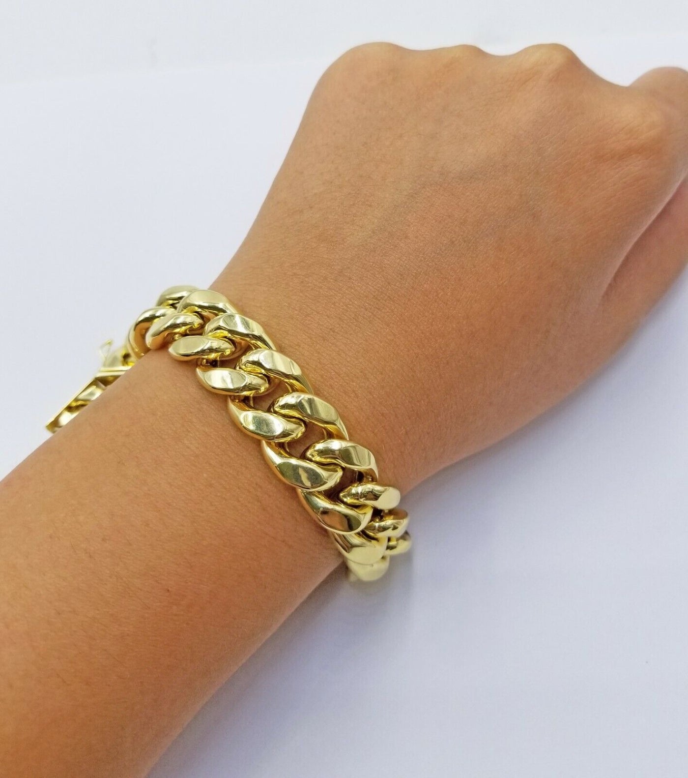 10 K Yellow Gold ( Real , Not plated , Not filled ) Miami Cuban-Link Bracelet For men's. The Width of the Bracelet is 15 mm ( approx.) and 8.5 Inch Long . The Clasp is Box Lock which is strong. The bracelet is beautiful designed with Cuban-Link style. If you are not happy with the way it looks or feels, we do offer 30 - Days FREE Return shipping.
