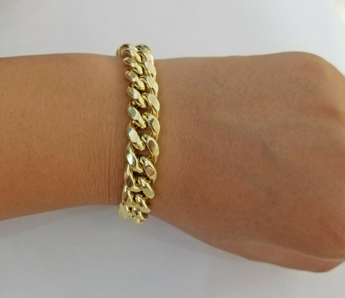 10 K Yellow Gold ( Real , Not plated , Not filled ) Miami Cuban-Link Bracelet For men's. The Width of the Bracelet is 11 mm ( approx.) and 9Inch Long . The Clasp is Box Lock which is strong. The bracelet is beautiful designed with Cuban-Link style. If you are not happy with the way it looks or feels, we do offer 30 - Days FREE Return shipping.