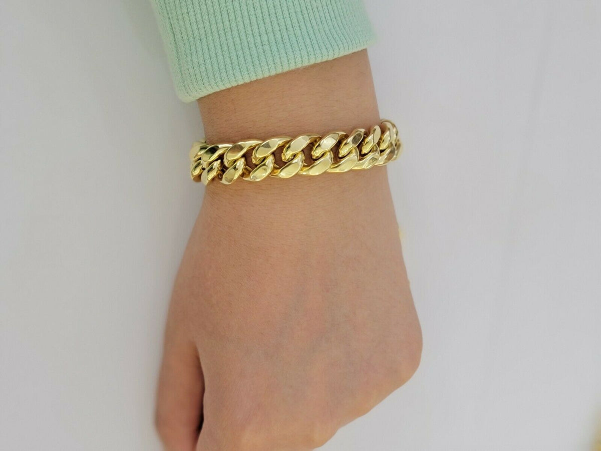 10 KT Yellow Gold ( Real , Not plated , Not filled ) Miami Cuban Link bracelets. The Width of the item is 6mm-13mm MM and in Length 9 Inches . The Clasp is Box Clasp Lock. The bracelet is considered durable. The necklace is 100% guaranteed 10k yellow gold and have been professionally tested and stamped 10k for purity authenticity. The chain is Strong and steady because of its thickness and weight. We guarantee the purity of the gold to be 10k, and the chains are NOT GOLD PLATED, NOT FILLED. If you are not happy with the way it looks or feels, we do offer