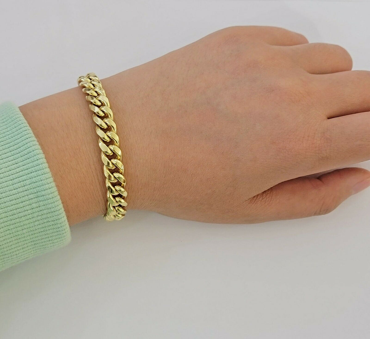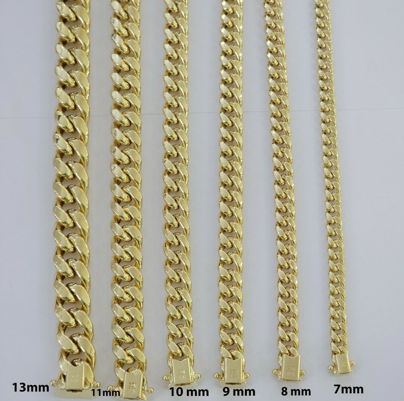 10 KT Yellow Gold ( Real , Not plated , Not filled ) Miami Cuban Link bracelets. The Width of the item is 6mm-13mm MM and in Length 8 Inches . The Clasp is Box Clasp Lock. The bracelet is considered durable. The necklace is 100% guaranteed 10k yellow gold and have been professionally tested and stamped 10k for purity authenticity. The bracelet is Strong and steady because of its thickness and weight. We guarantee the purity of the gold to be 10k, and the chains are NOT GOLD PLATED, NOT FILLED. If you are not happy with the way it looks or feels, we do offer