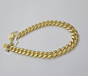 SOLID 10 K Yellow Gold ( Real , Not plated , Not filled ) Miami Cuban-Link Bracelet. The length is 7.5 Inch Long and Width of the Bracelet is 8 mm ( approx.) . The Clasp is box Lock with two other safety clasp in sides which is strong. The bracelet is beautiful designed with Cuban-Link style. If you are not happy with the way it looks or feels, we do offer 30 - Days FREE Return shipping.