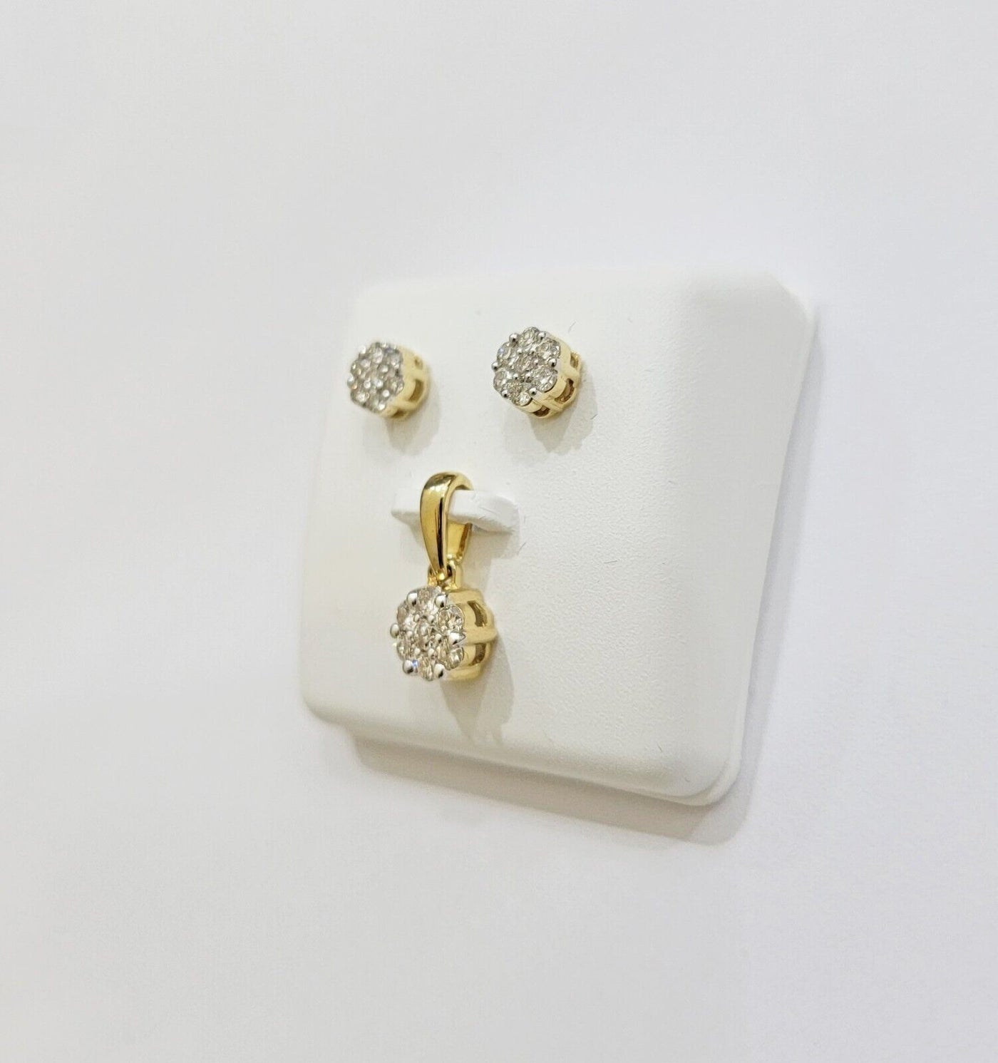 Genuine 10 k Yellow Gold 0.48 CT diamond Round Pendant, and earring Set. Genuine natural diamonds Pendant. The length of the chain is 18/20 Inches and the chain is complimentary. Please know that we do not exchange the length of the chain. The Diamonds are natural and has the diamond carat weight of 0.48 CT. If you are not happy with the way it looks or feels, we do offer 30 - Days FREE Return shipping. Contact us for more information.