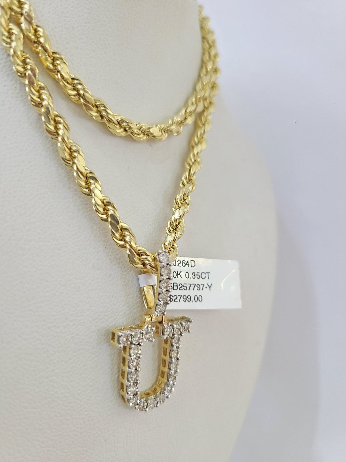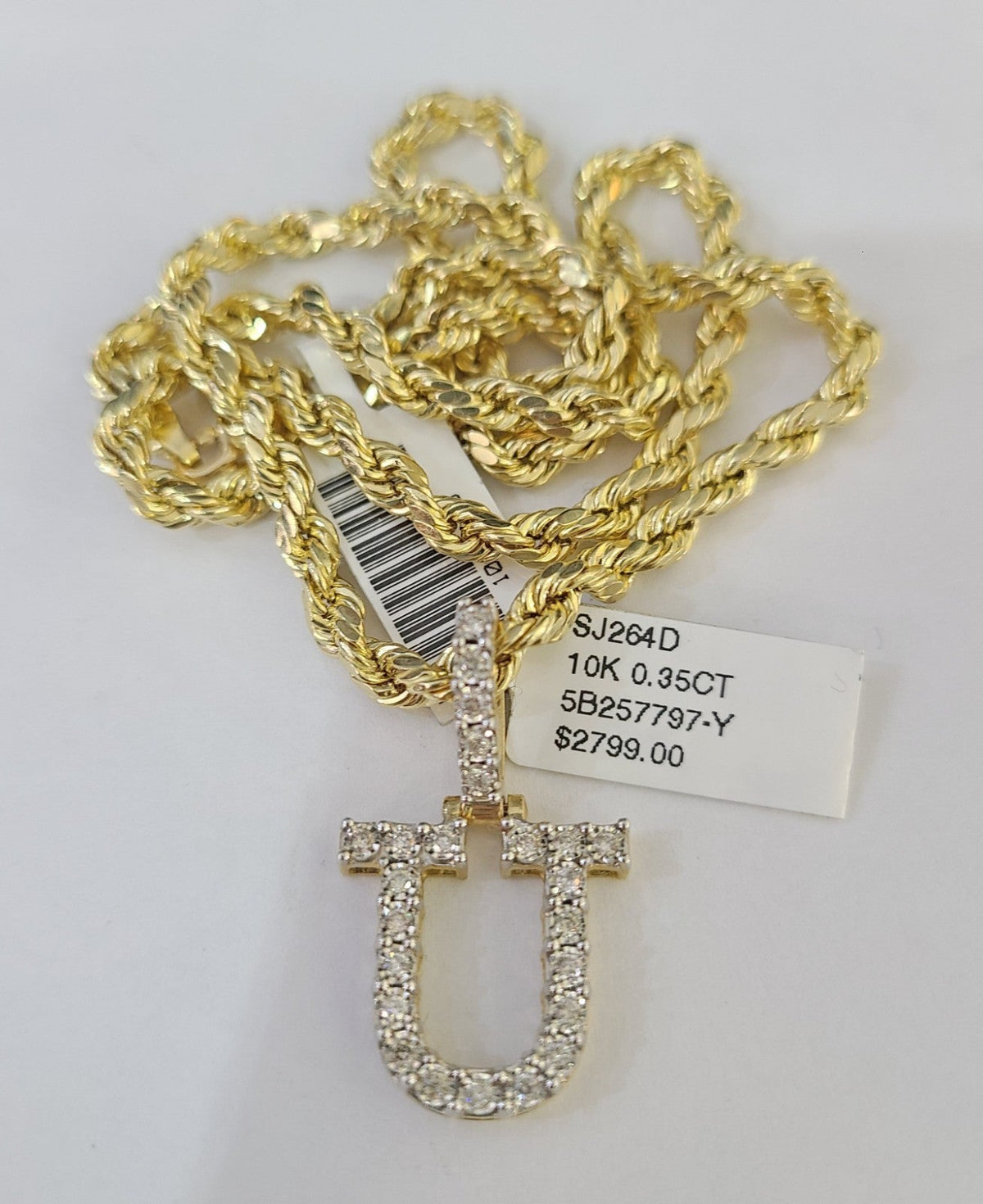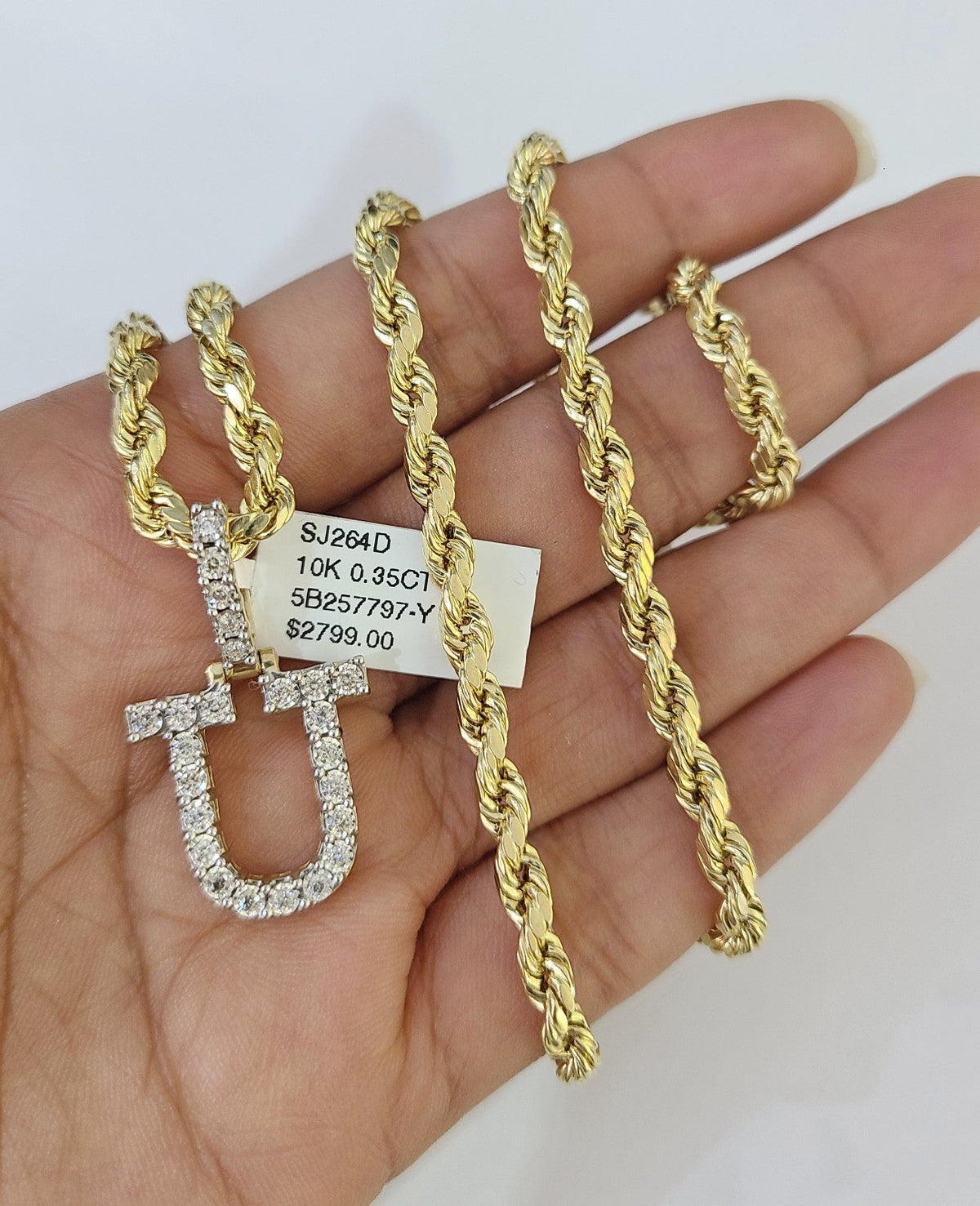 10k Rope Chain U Diamond Initial Charm Necklace Pendant Set 4mm 20"-30" Gold