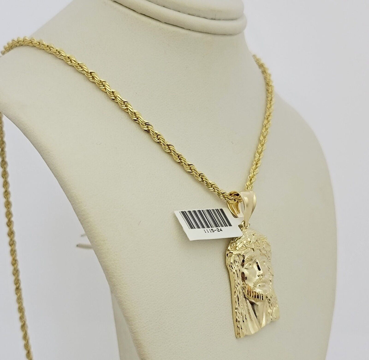Real 10k Gold Rope Chain Jesus Face Charm Pendant Set 3mm Necklace 24 Inch SOLID