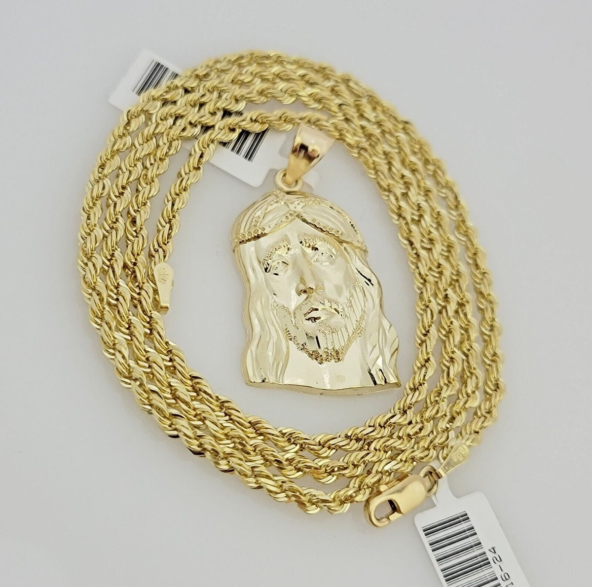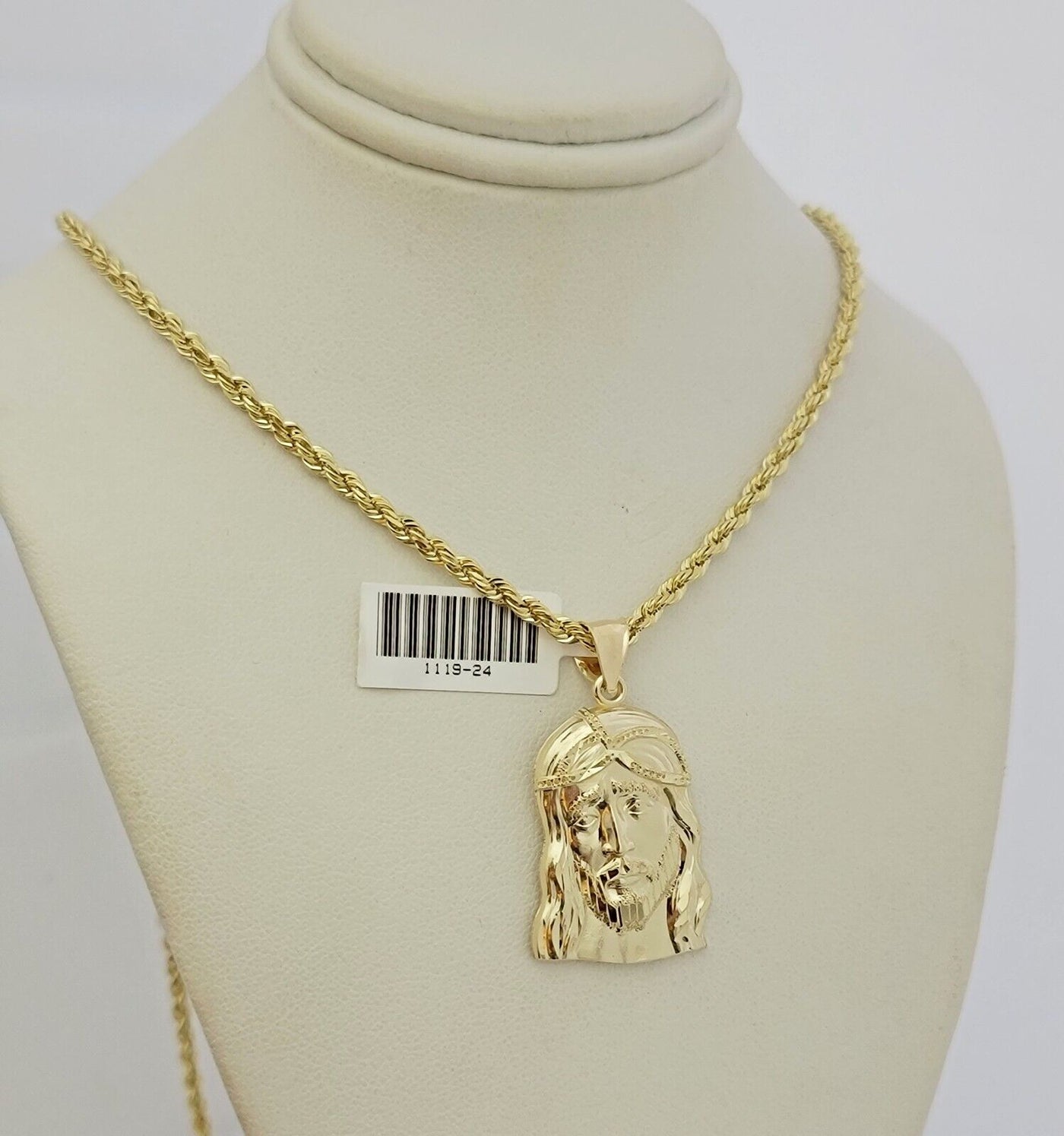Real 10k Gold Rope Chain Jesus Head Charm Pendant Set 3mm Necklace 18"-26" SOLID - 20 Inch