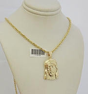 Real 10k Gold Rope Chain Jesus Head Charm Pendant Set 3mm Necklace 18"-26" SOLID