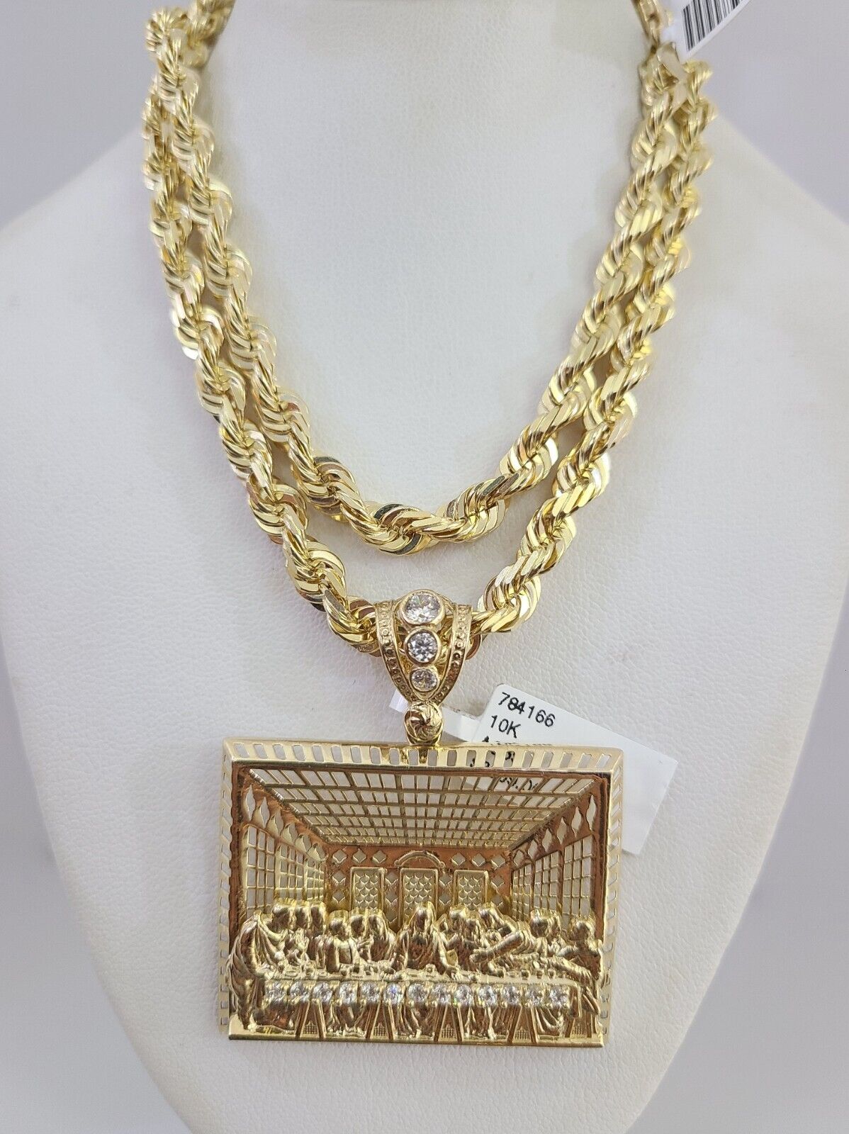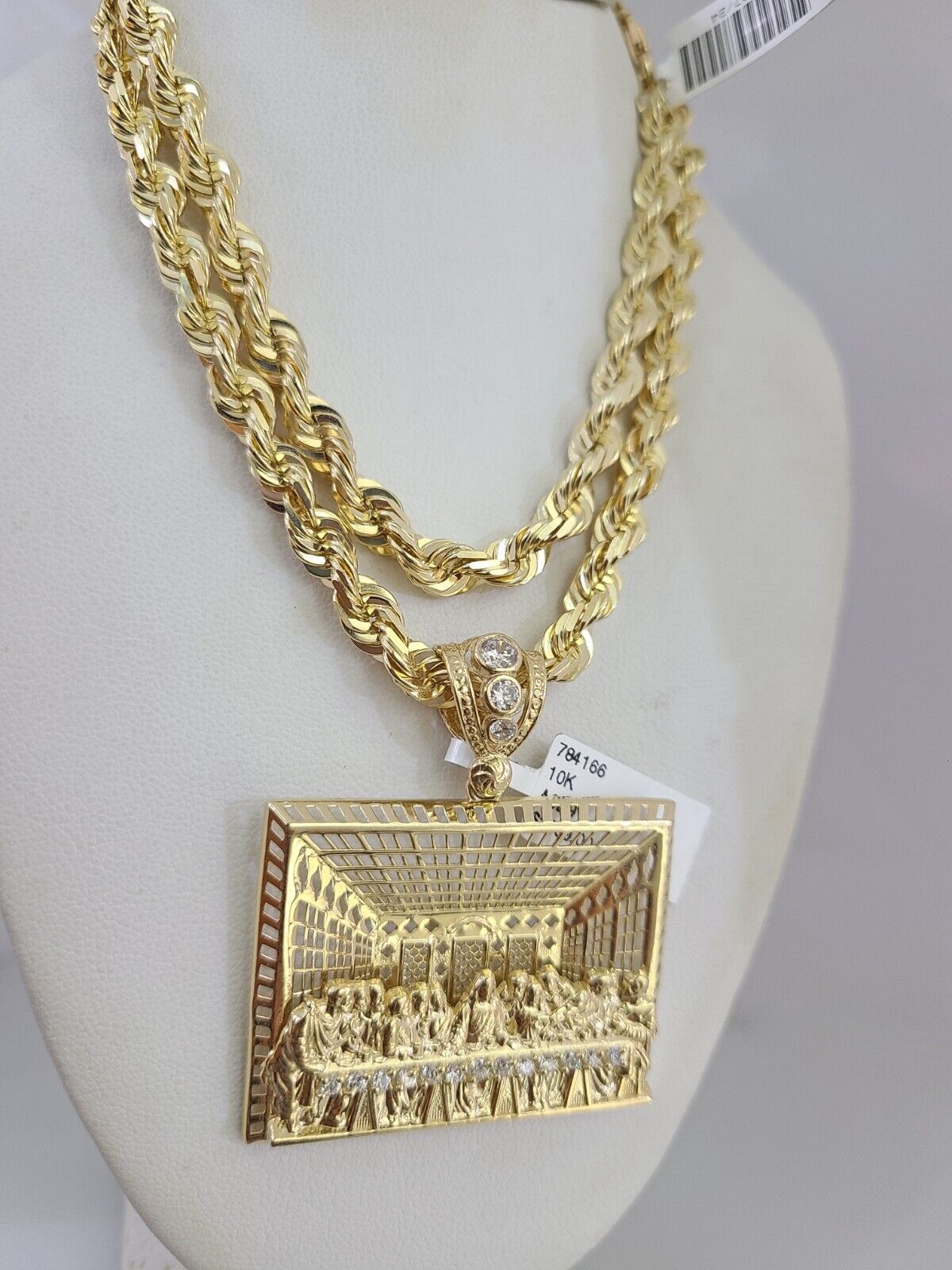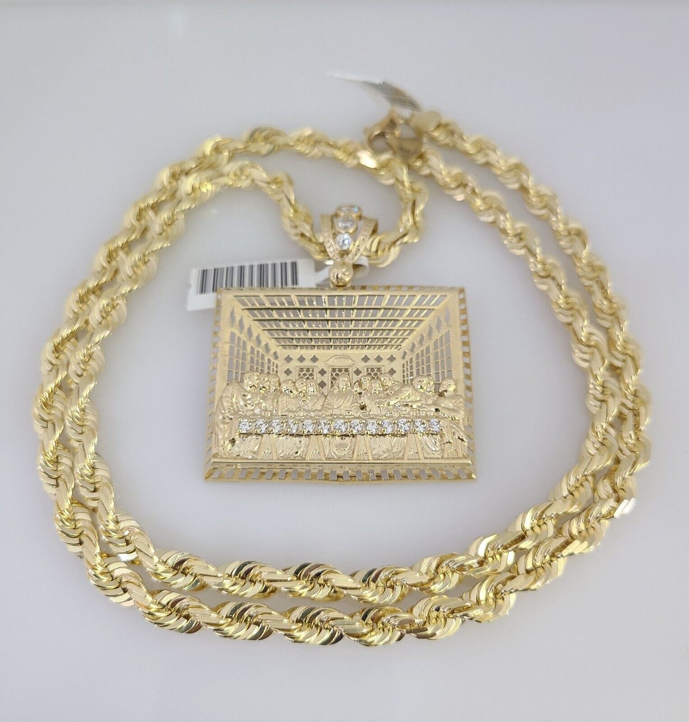 Genuine 10k Yellow Gold Solid Rope Chain 20-30 Inch 6mm Necklace With Last Supper Charm design as a SET. The Various lengths of the Chain are 20-30 Inch . If you are not happy with the way it looks or feels, we do offer 30 - Days FREE Return shipping. Contact us for more information.