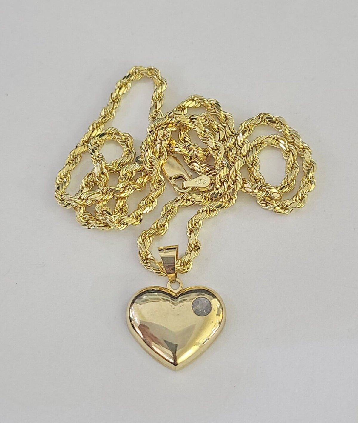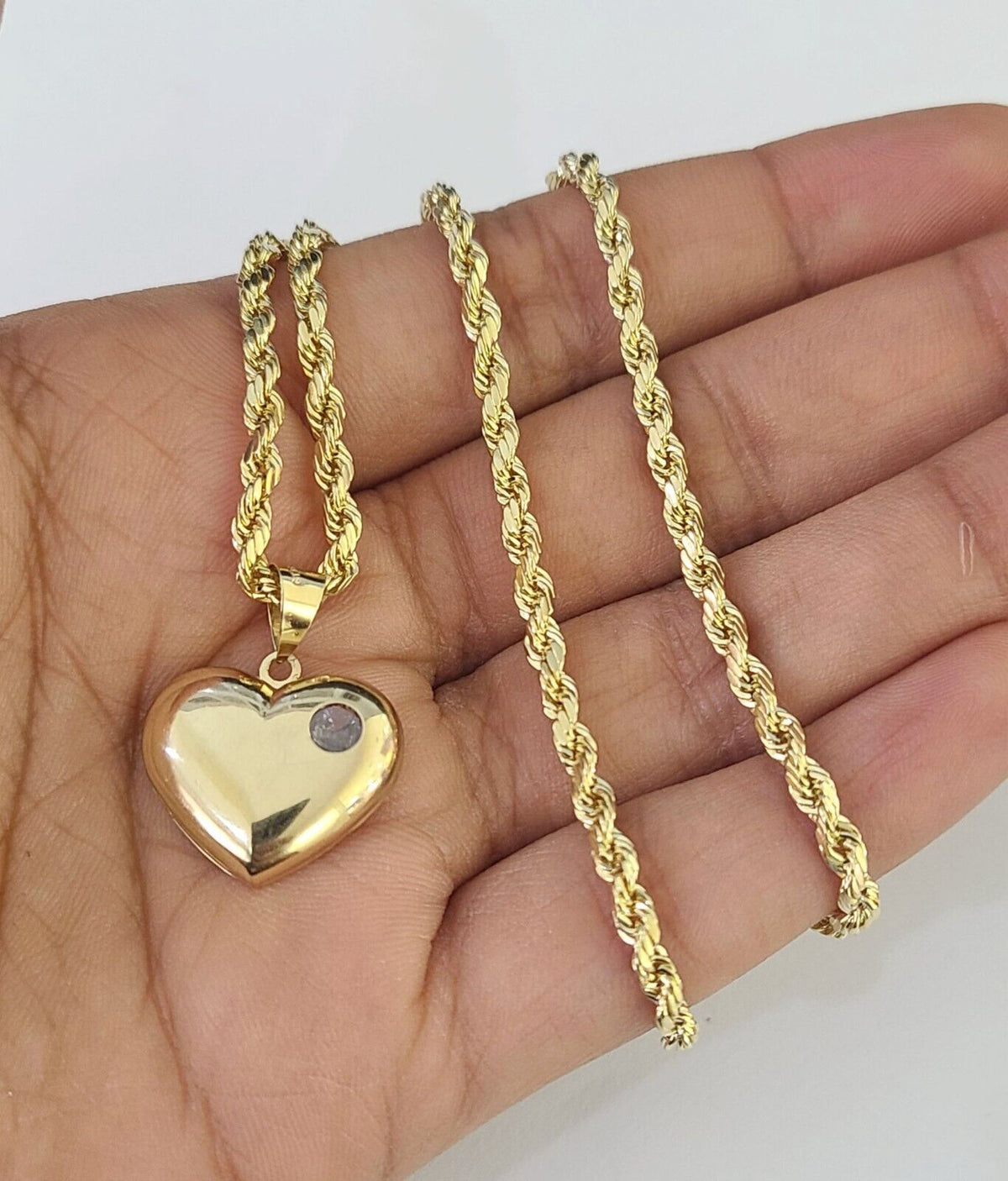 Real 10k Rope Chain Heart Charm Pendant SET Necklace 3mm 18"-24" Ladies
