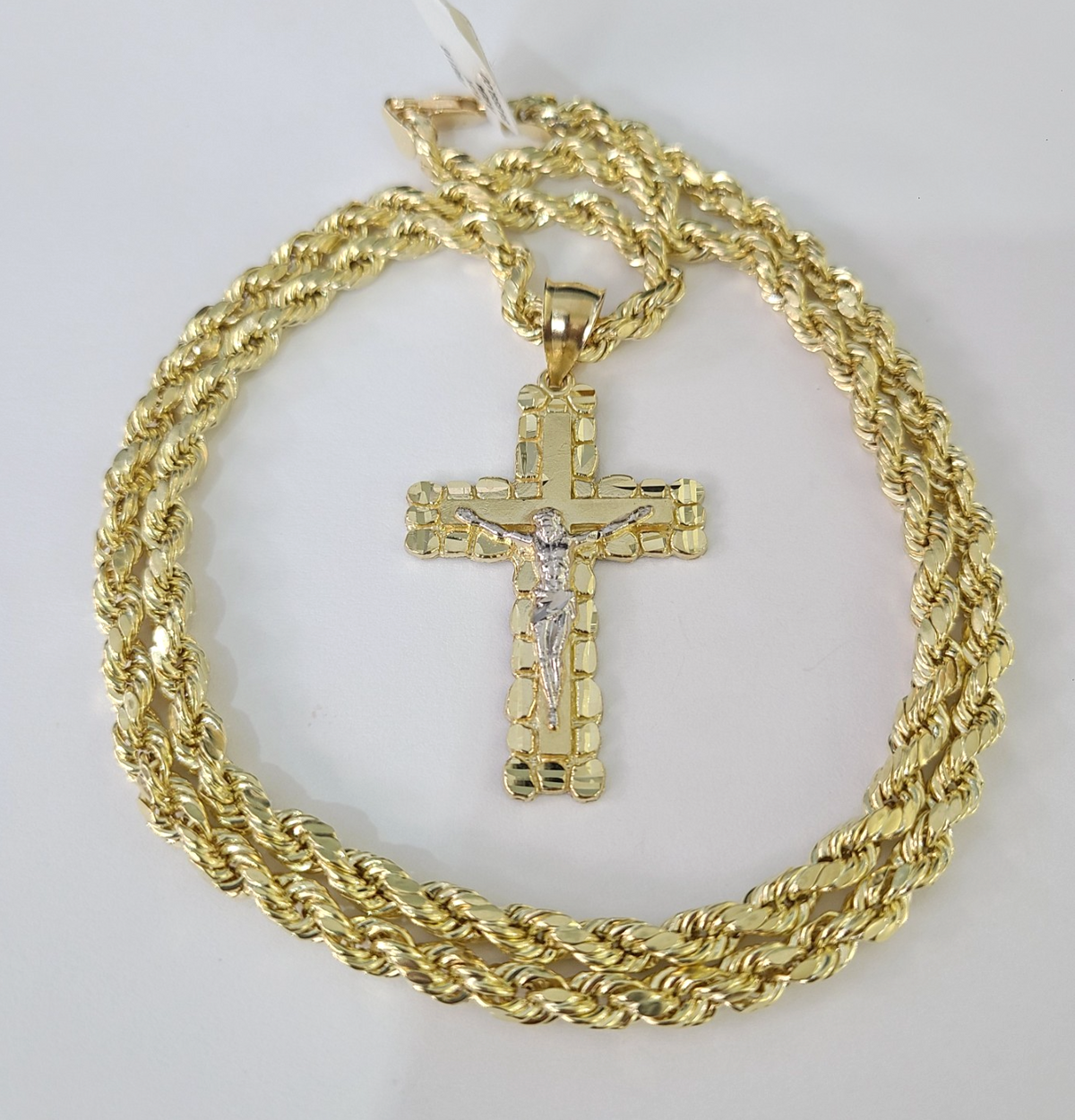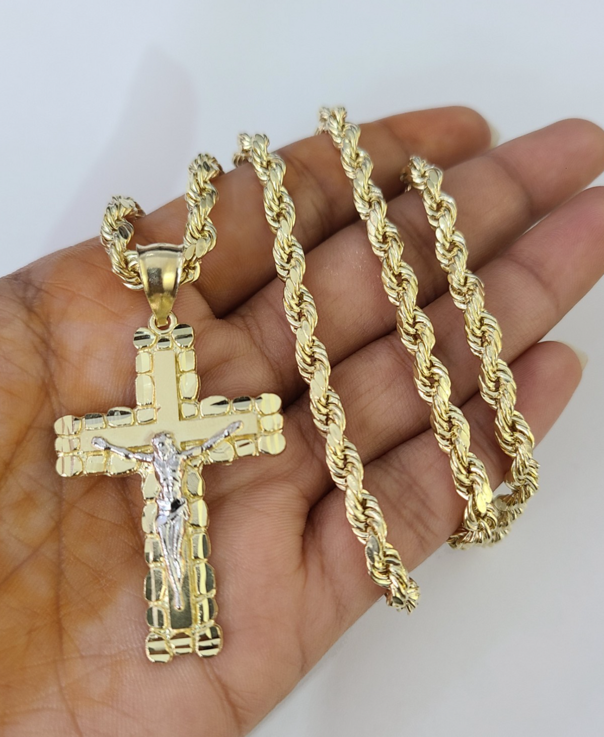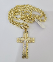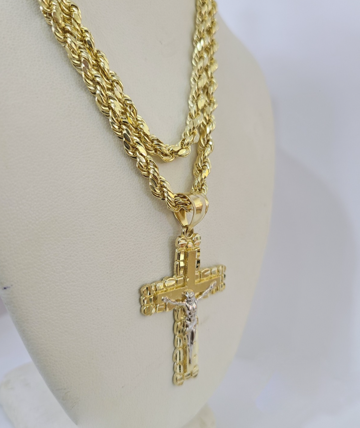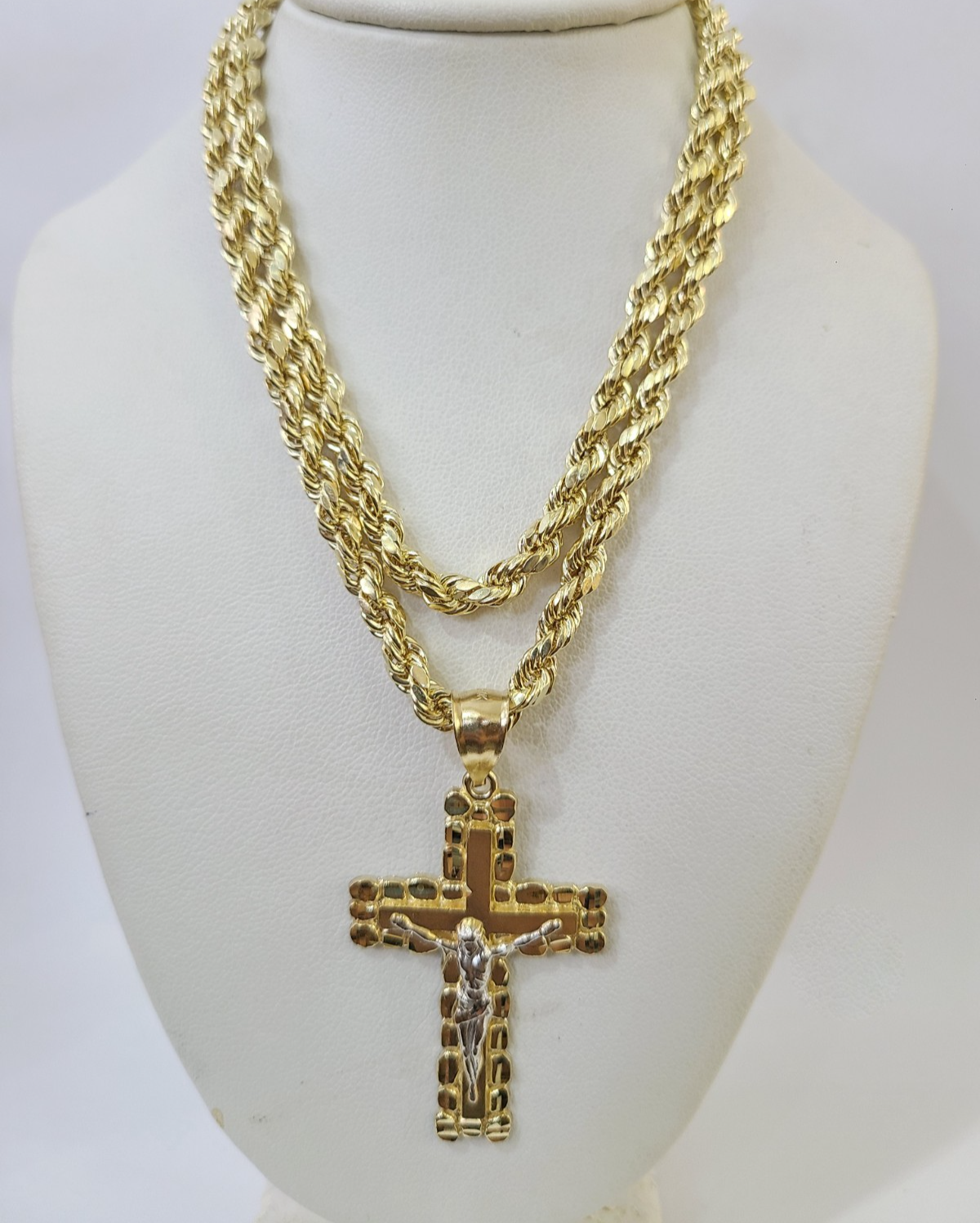 Genuine 10k Yellow Gold Rope Chain 18-28 inches 4mm Necklace with Jesus Cross design as a SET. The Various length of the Chain are 18-28 inches. If you are not happy with the way it looks or feels, we do offer 30 - Days FREE Return shipping. Contact us for more information.