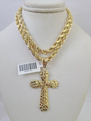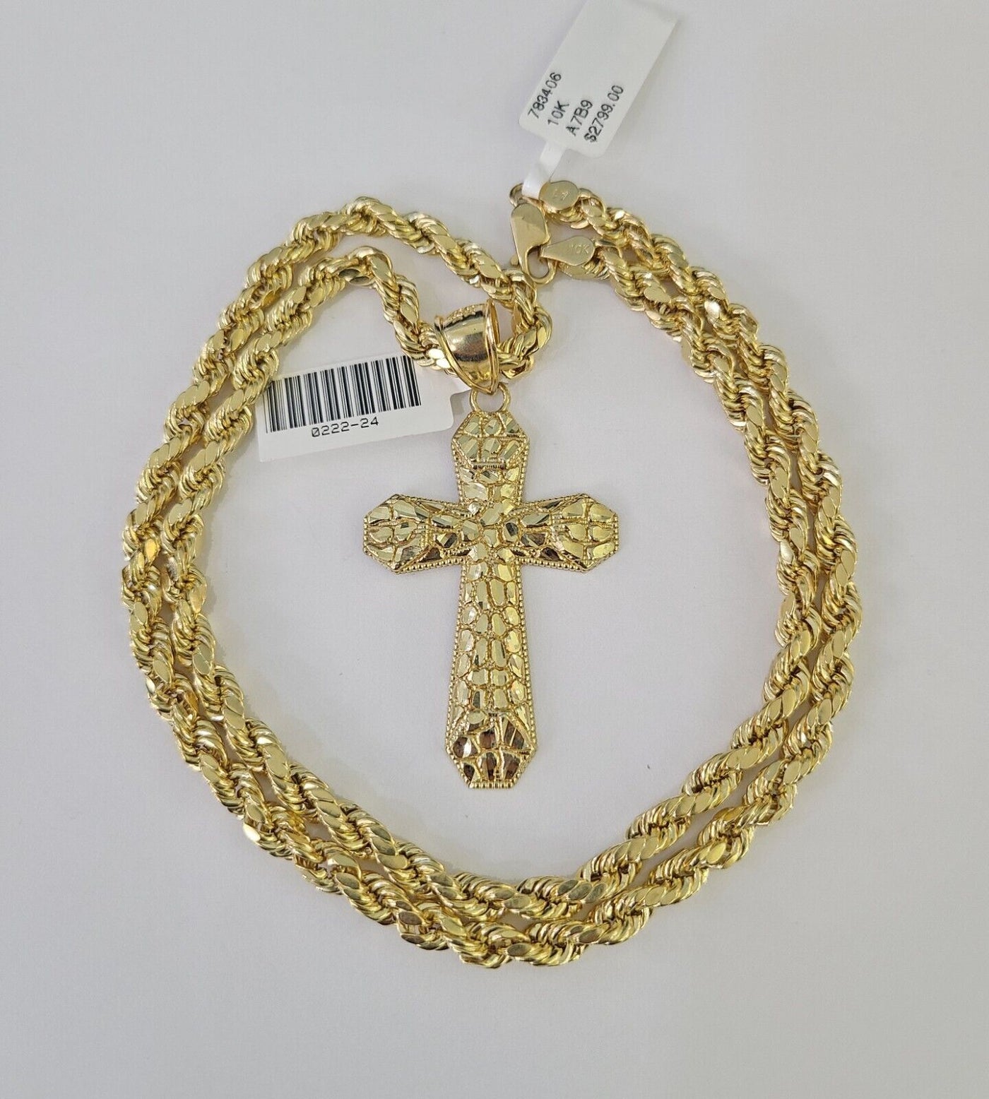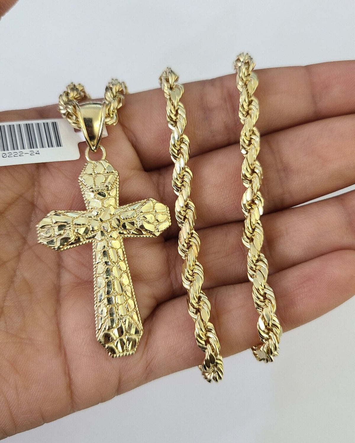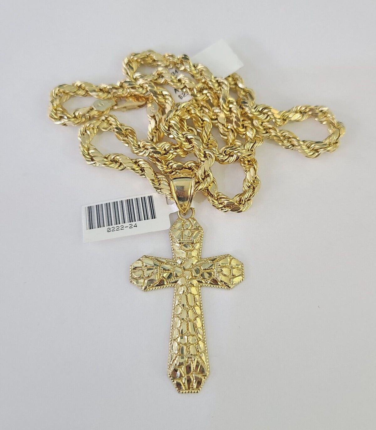 Is Presenting You with This Absolutely Stunning Real 10k Yellow Gold Rope Chain 5mm, 20 inch- 30 inches, Lobster Lock with a 10k Jesus Cross Charm . These Beautiful chains and Pendant will not tarnish, discolor, or fade because they are Pure 10K Gold. We also have them in various another length and sizes. 20"-A7B9 Ask A4B5