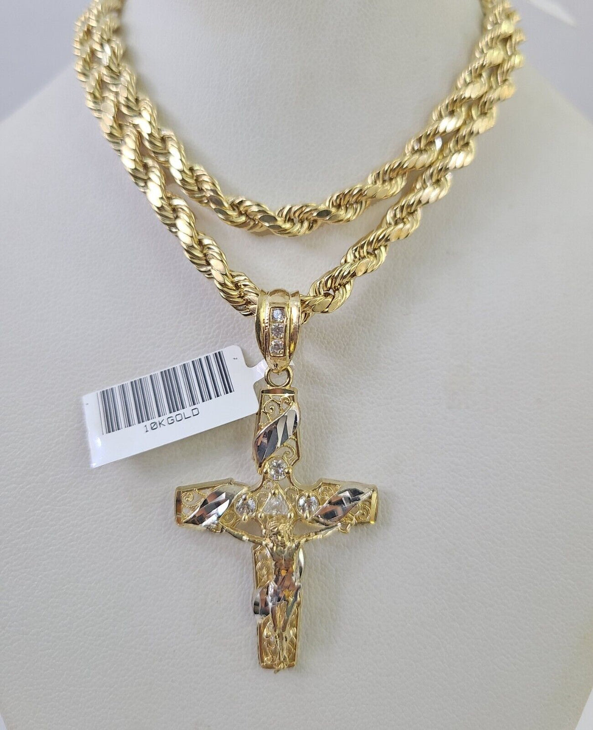 Is Presenting You with This Absolutely Stunning Real 10k Yellow Gold Rope Chain 5mm, 20 inch- 30 inches, Lobster Lock with a 10k Jesus Cross Charm . These Beautiful chains and Pendant will not tarnish, discolor, or fade because they are Pure 10K Gold. We also have them in various another length and sizes. 20"-A7B9 A3B2