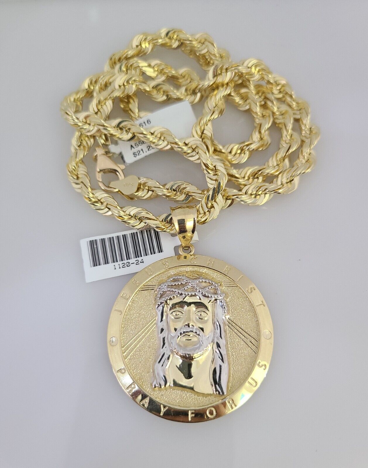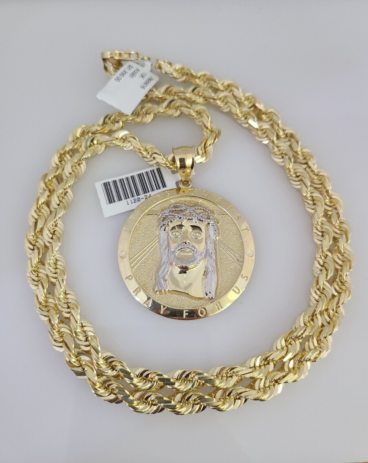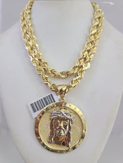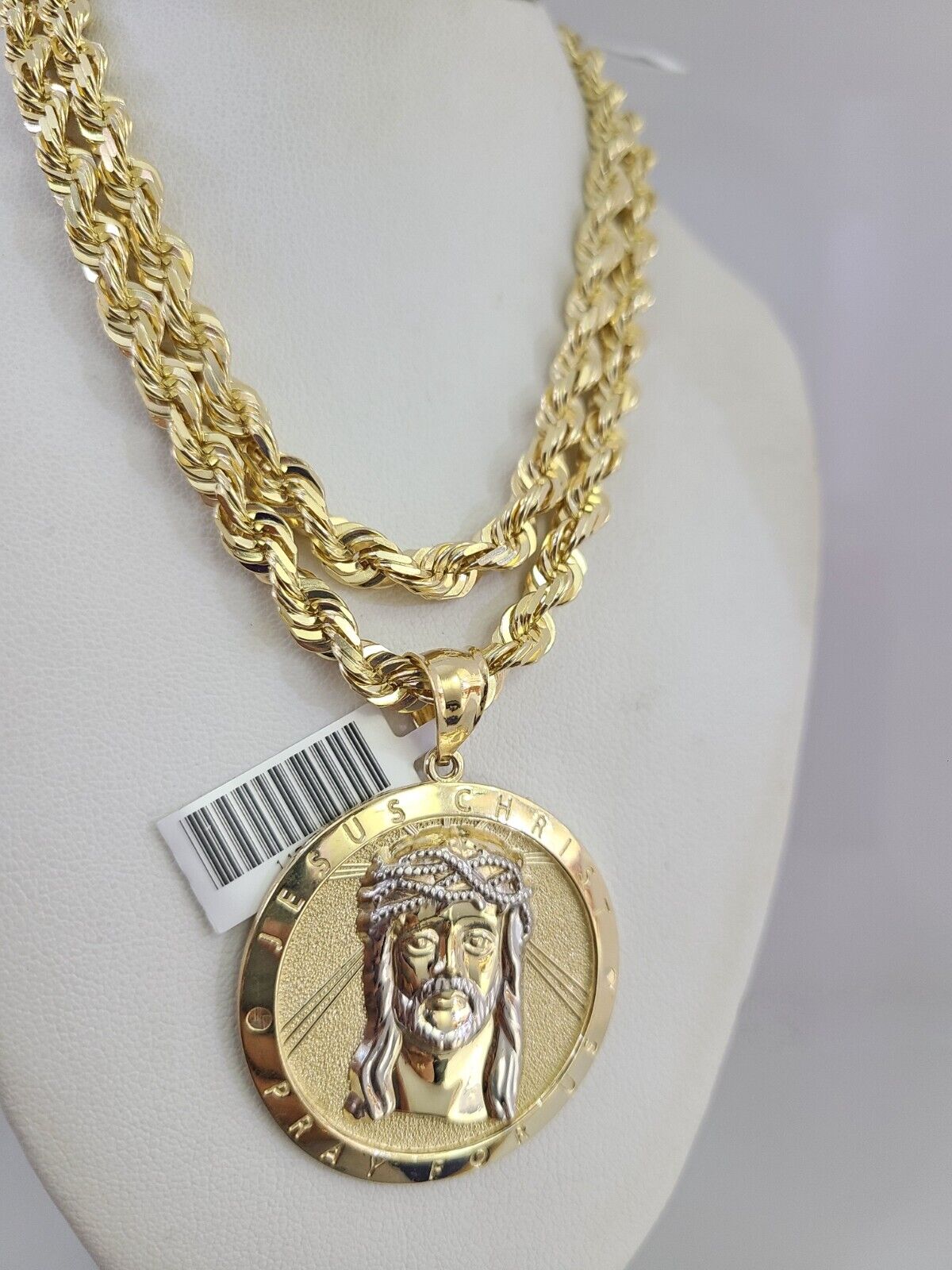 Genuine 10k Yellow Gold Solid Rope Chain 20-30 Inch 6mm Necklace With Jesus Christ Charm design as a SET. The Various lengths of the Chain are 20-30 Inch . If you are not happy with the way it looks or feels, we do offer 30 - Days FREE Return shipping. Contact us for more information.
