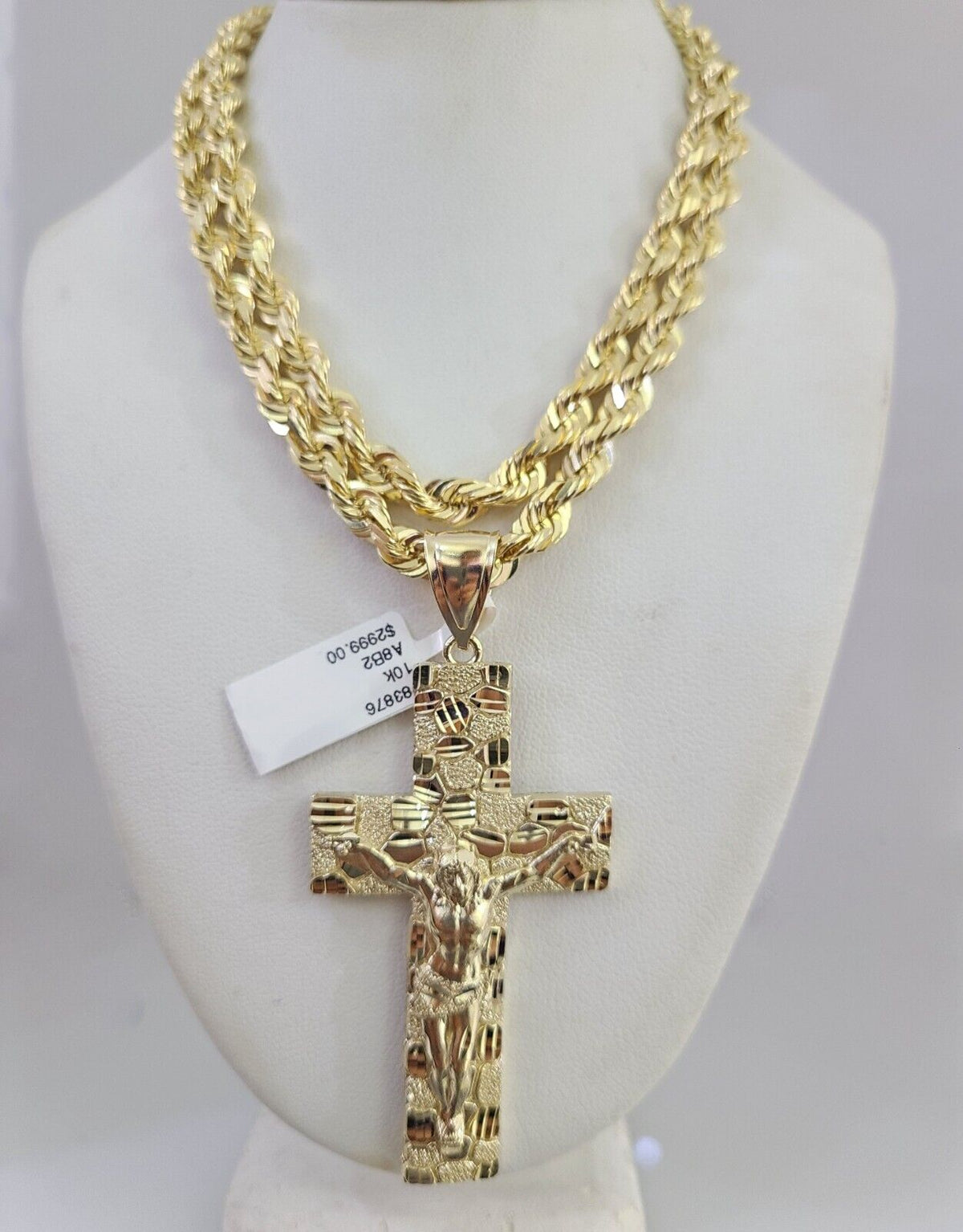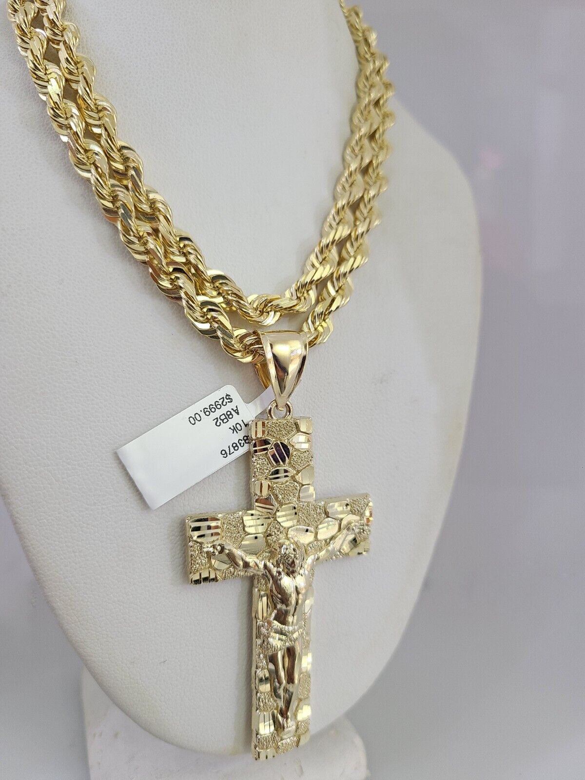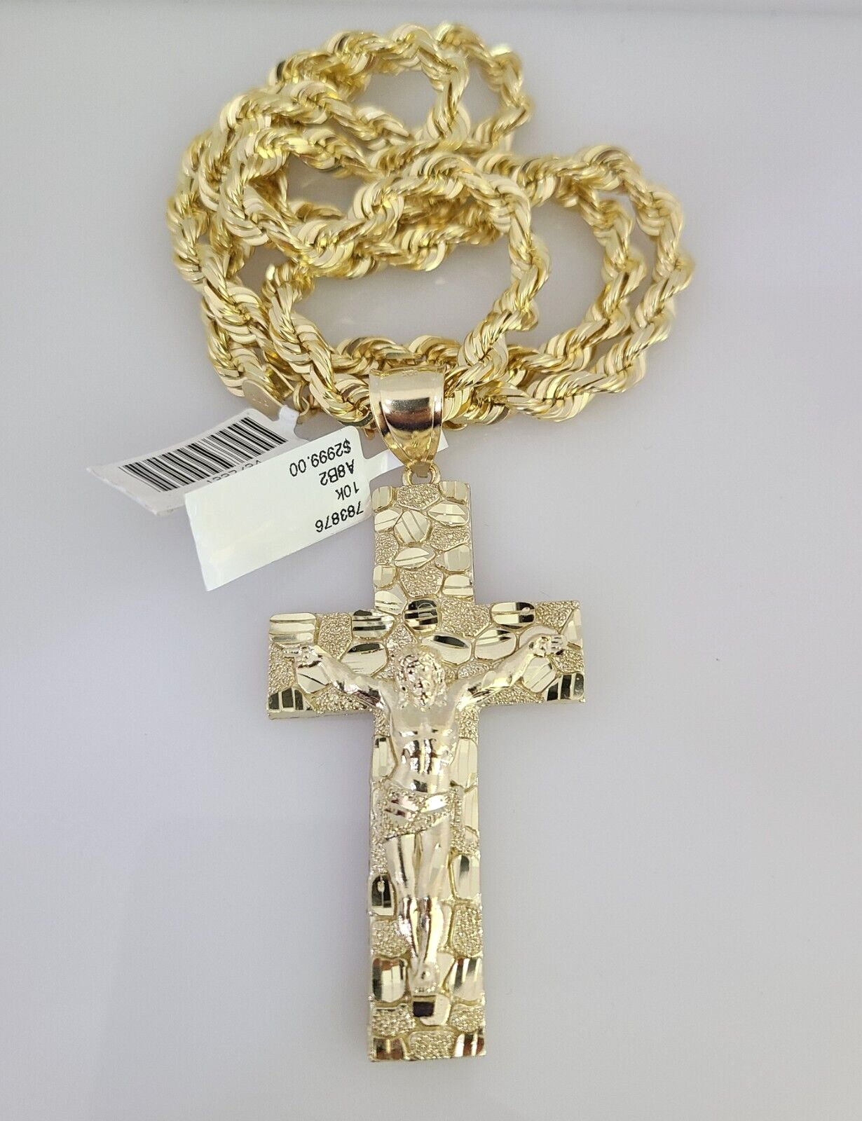 REAL 10k Solid Rope Necklace Nugget Cross Pendant SET Chain 20"-30'' 6mm Gold - 22 inch with charm
