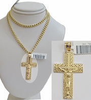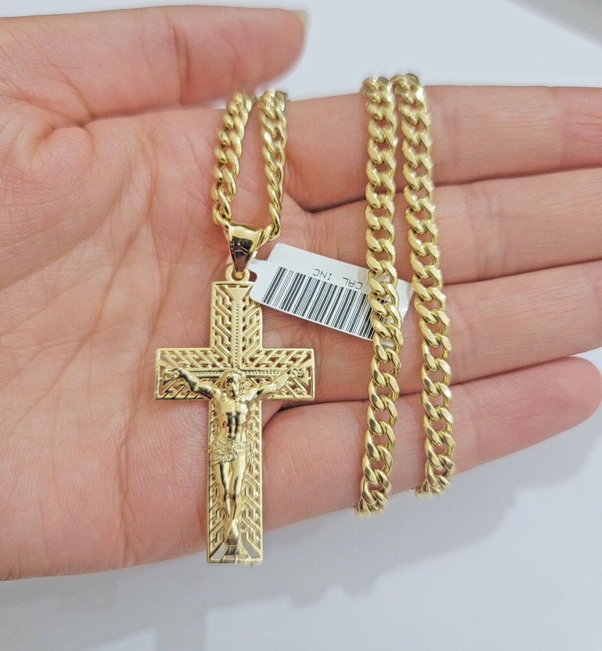REAL 10k Yellow Gold Chain Cross Pendant Set Miami Cuban link Necklace 5mm 18-28