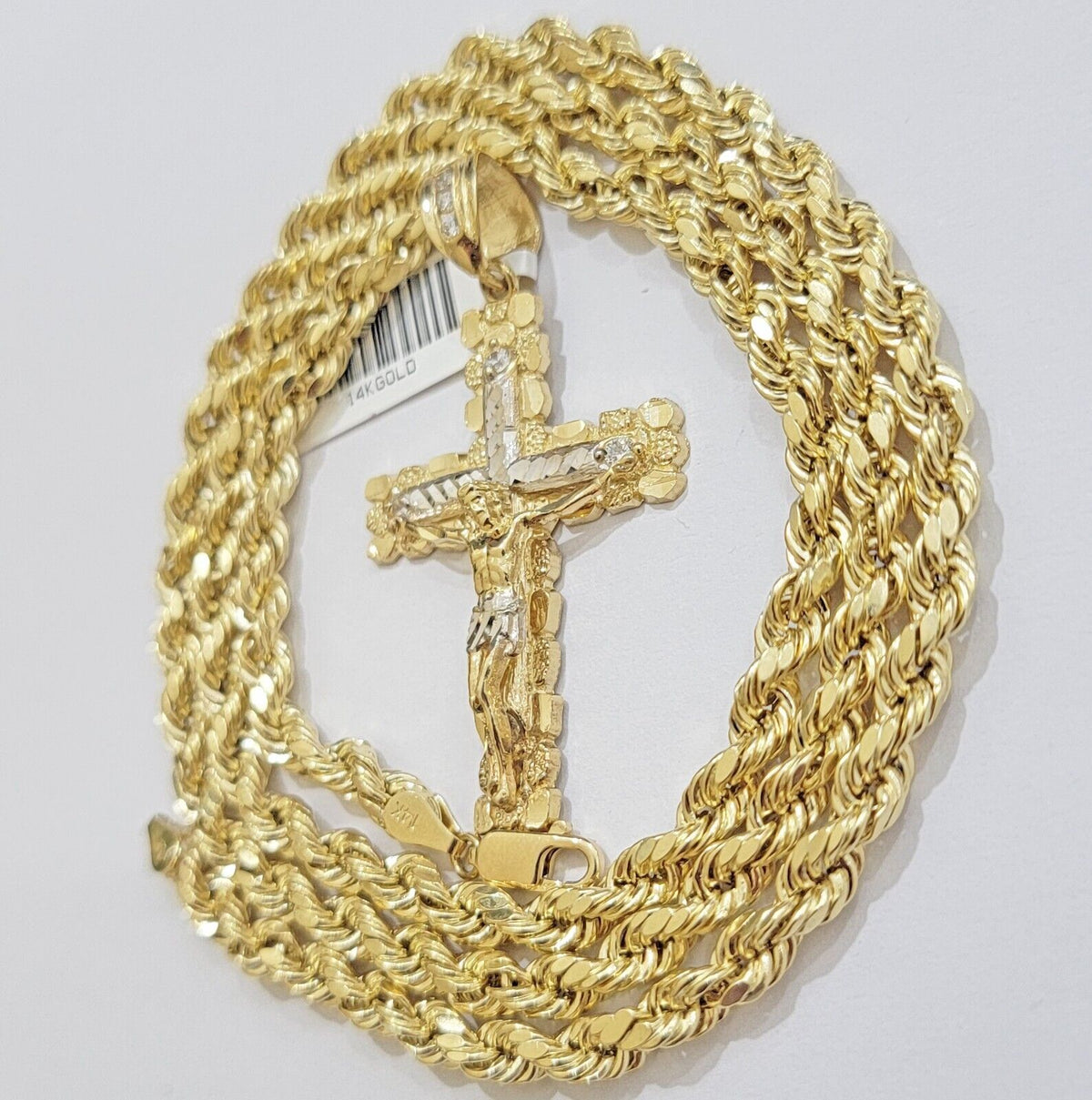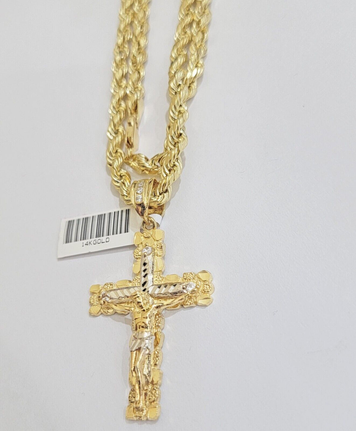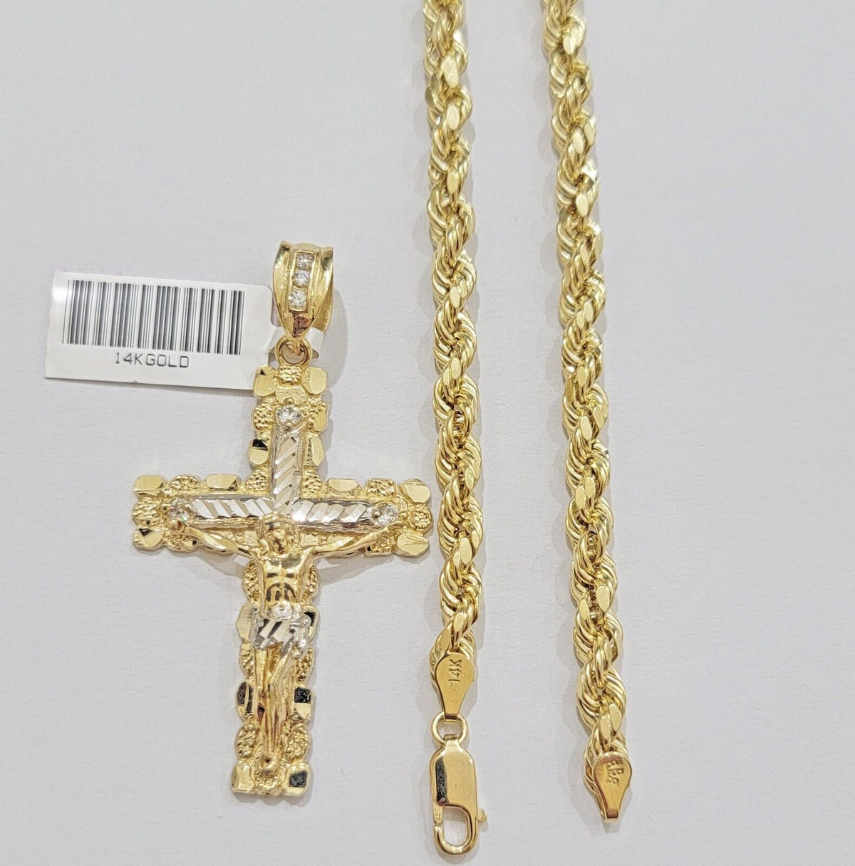 Genuine 14 k Yellow Gold Rope Chain 5mm With Jesus Crucifix Cross diamond cuts design. The Various length of the Chain are 20"-28" with Jesus Crucifix Cross 2 inches. The pendants are unique in design and considered durable too. The stones are cubic zirconia If you are not happy with the way it looks or feels, we do offer 30 - Days FREE Return shipping. Contact us for more information.