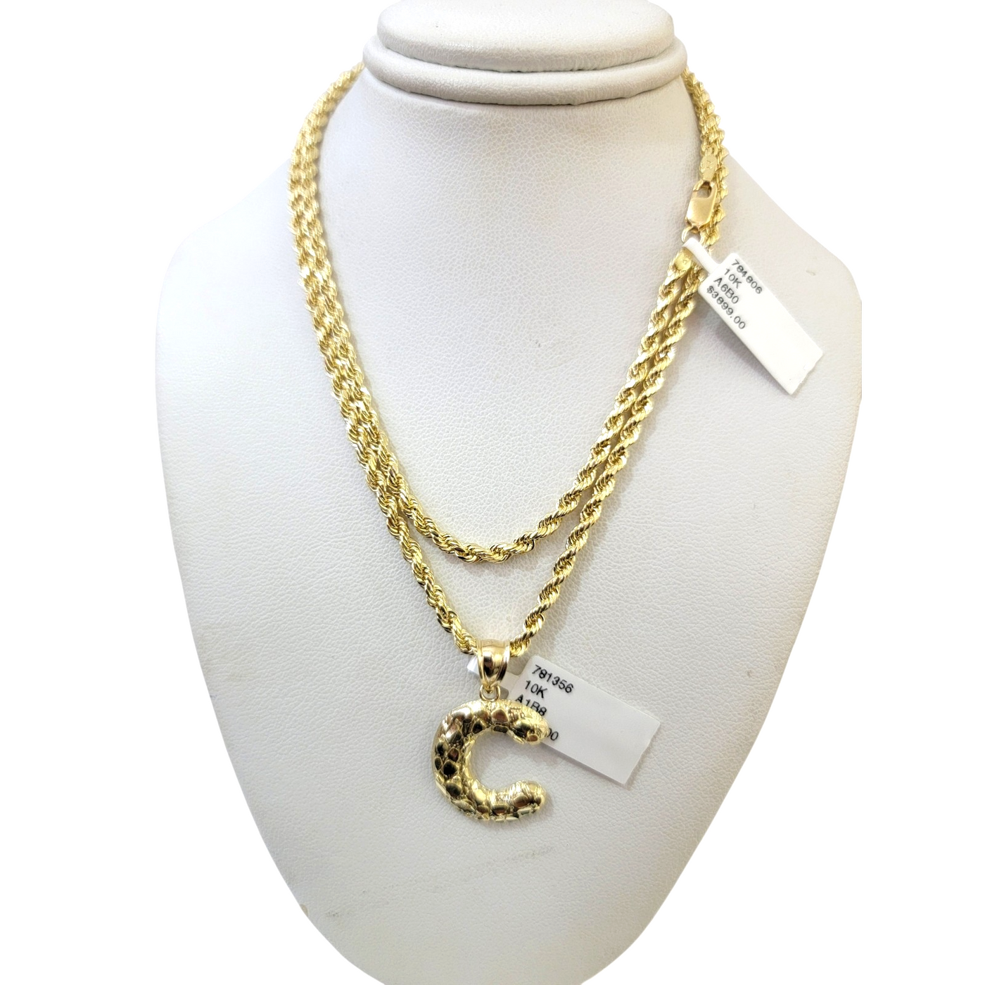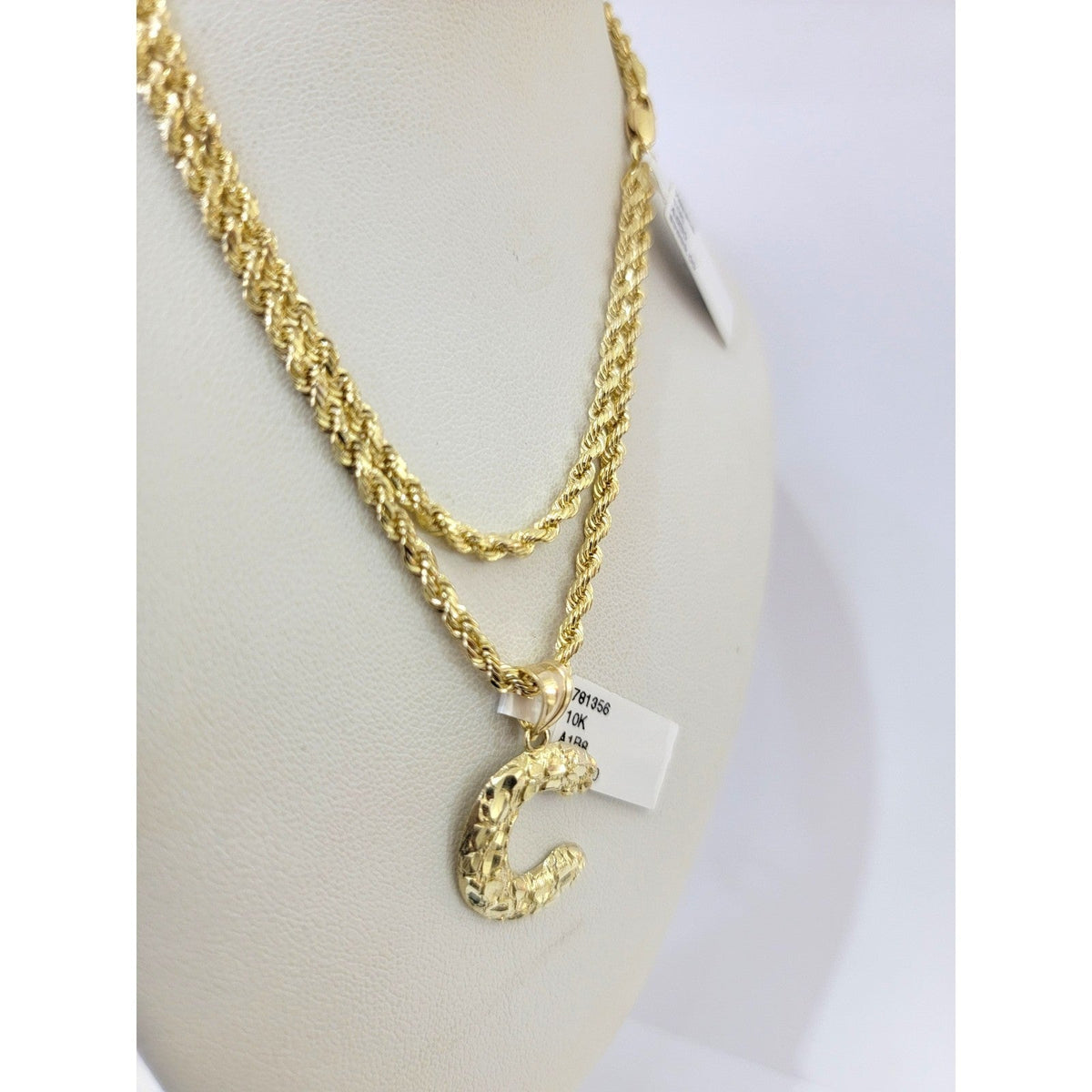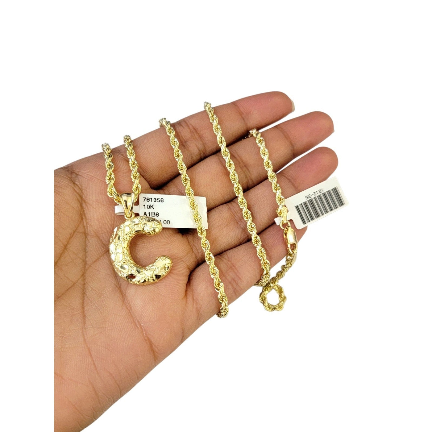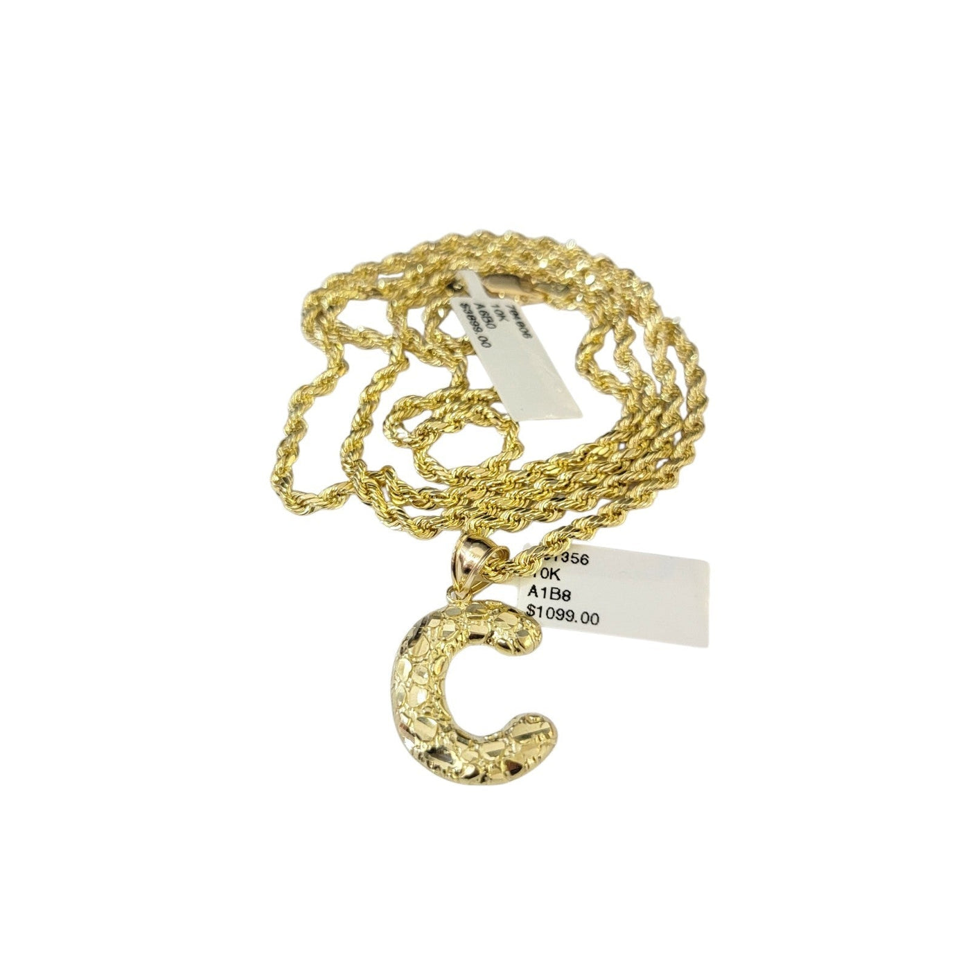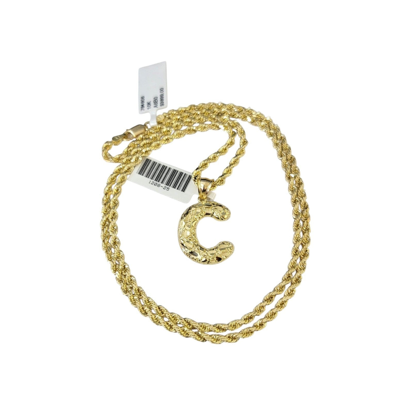 Real 10k Rope Chain Necklace Set 3mm 18"-28" Nugget C Initial Charm Pendant Gold - 20in Chain & Charm