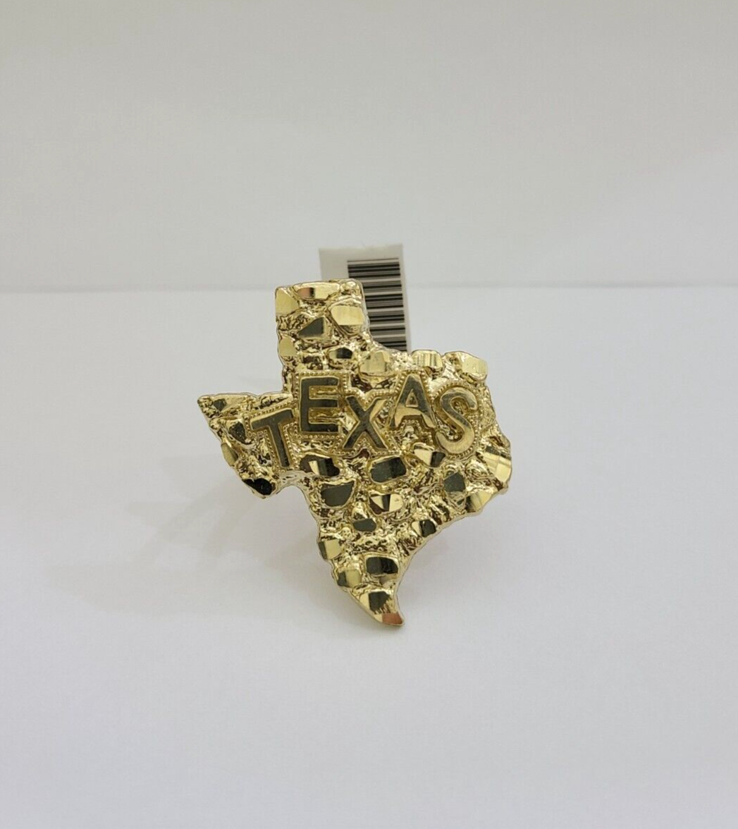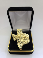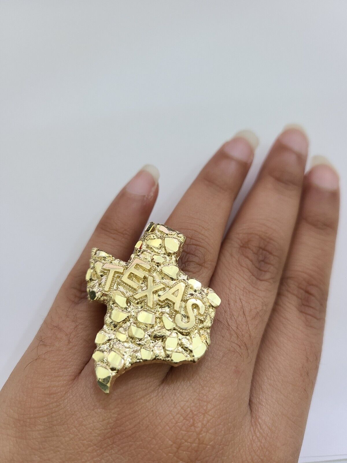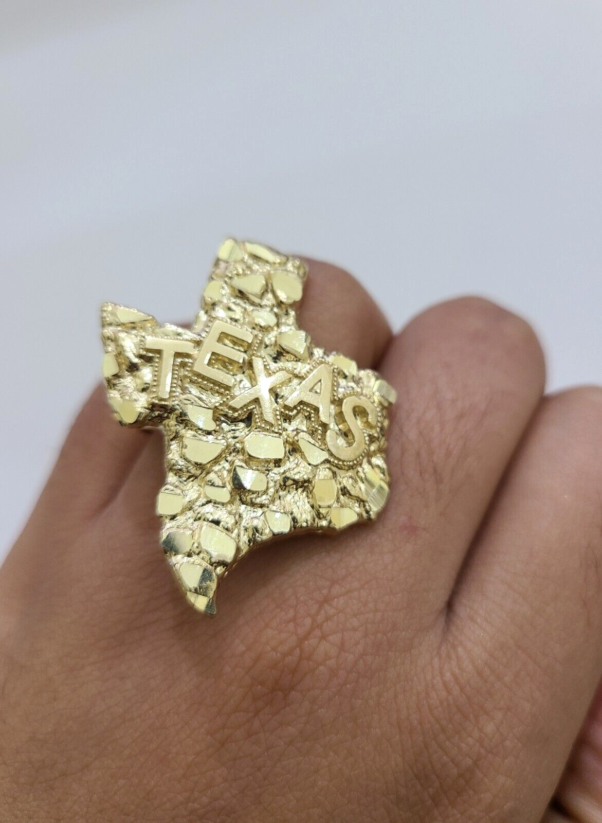 Real 10K Yellow Nugget Texas Map Gold Ring for Men's. It has Texas Map Shape Very Good Quality Gold. The Ring has a Excellent Cuts Which gives elegant look to the Big Ring . The shape is Square, Traditional and Classic & Timeless. It flaunts Extra ordinary Design ring. It comes with standard size 10, and the ring is sizable. Sizing the ring will cost you extra $29.99 on your demand..