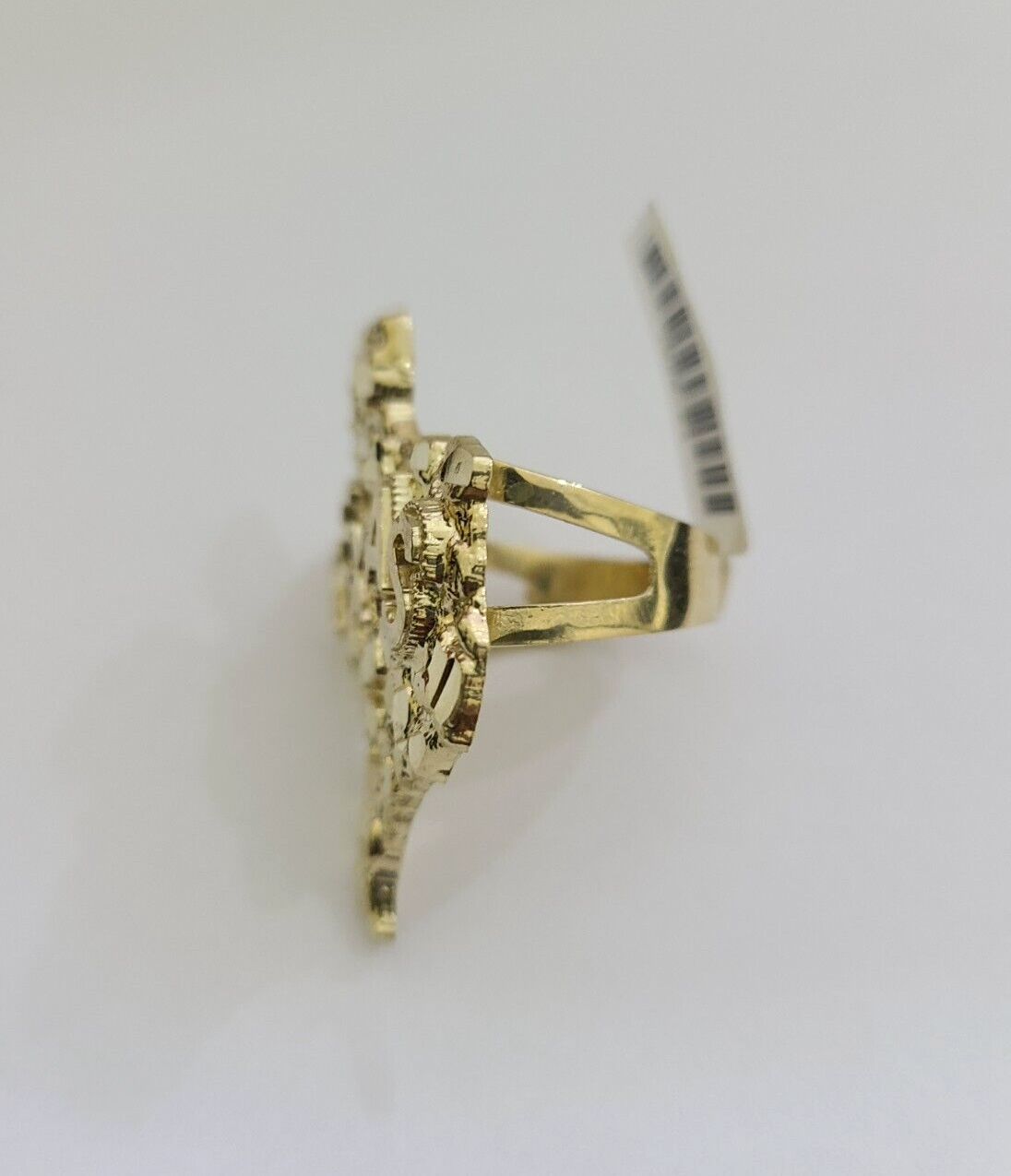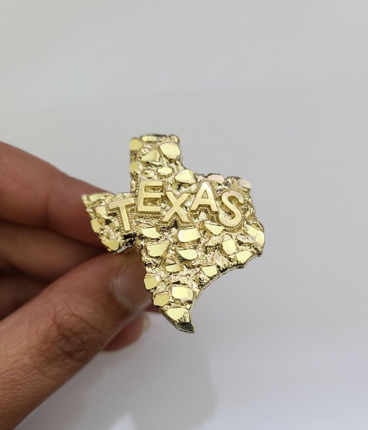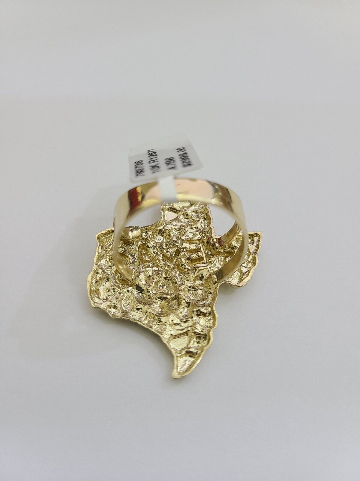 Real 10K Yellow Nugget Texas Map Gold Ring for Men's. It has Texas Map Shape Very Good Quality Gold. The Ring has a Excellent Cuts Which gives elegant look to the Big Ring . The shape is Square, Traditional and Classic & Timeless. It flaunts Extra ordinary Design ring. It comes with standard size 10, and the ring is sizable. Sizing the ring will cost you extra $29.99 on your demand..