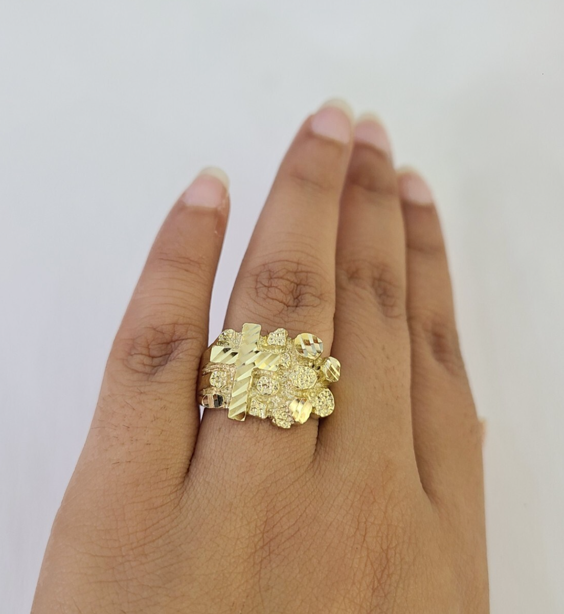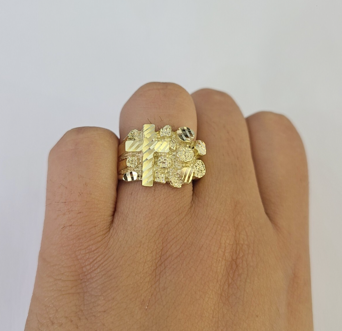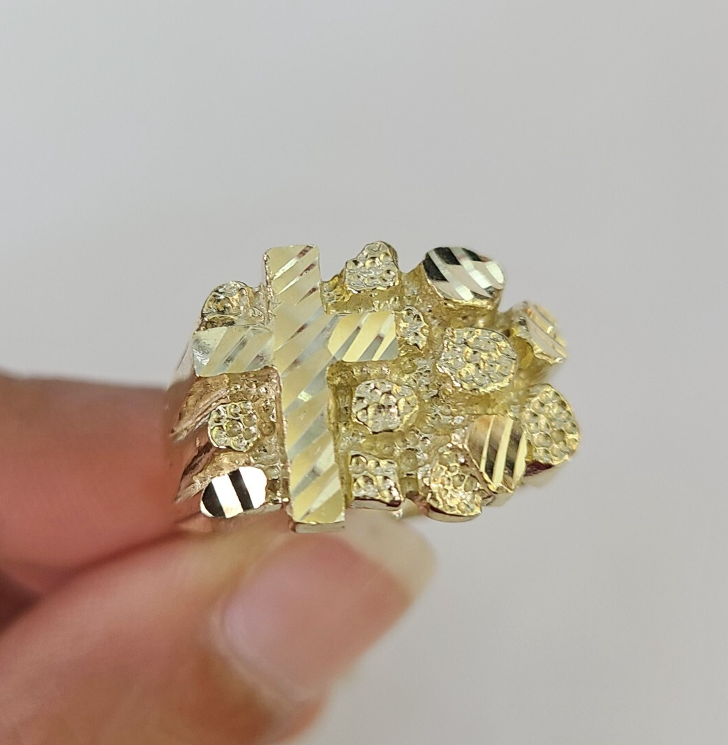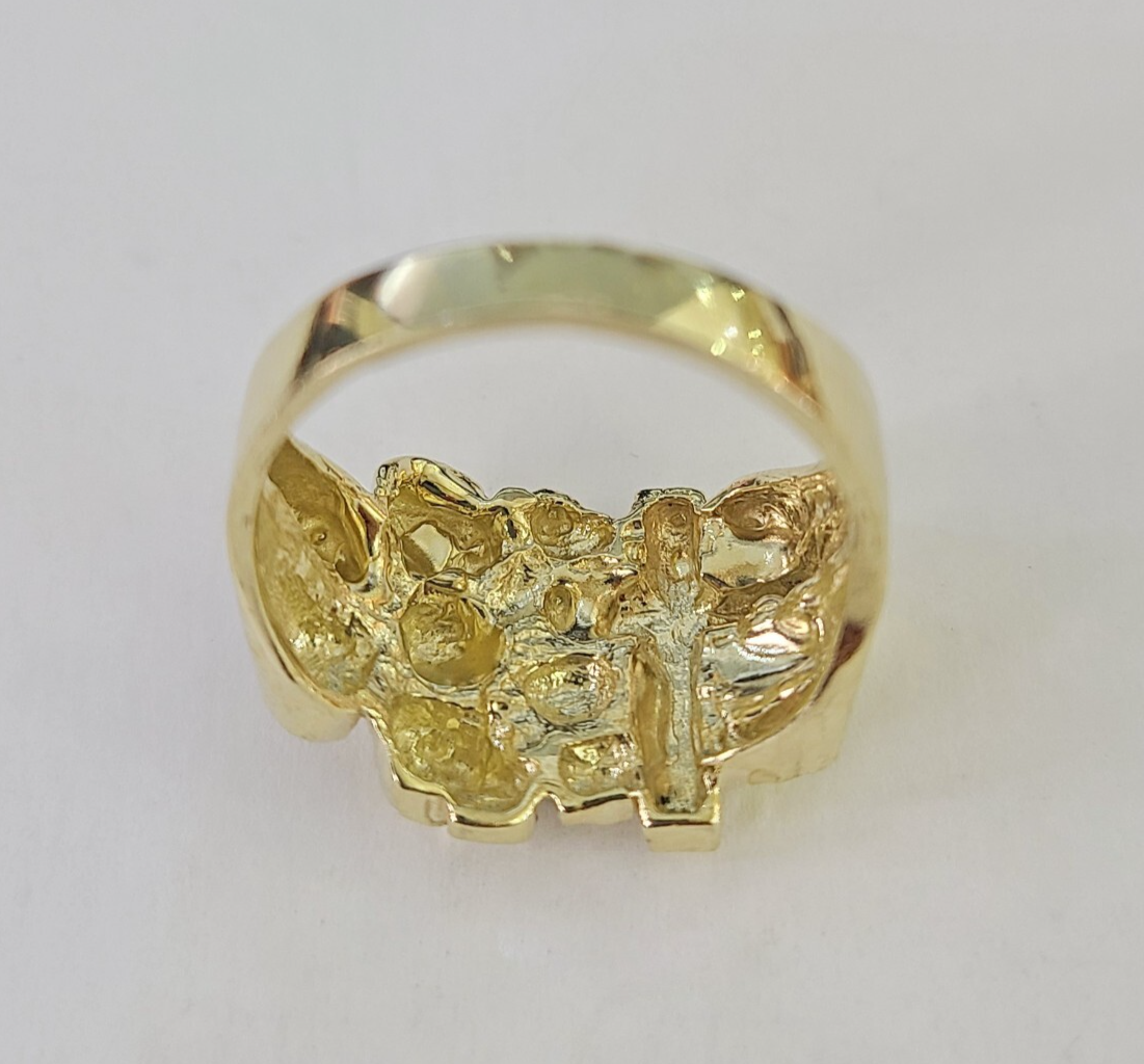 Real 10K Yellow Jesus Cross Nugget Gold Ring. The shape is Round, Traditional and Classic & Timeless. It flaunts Extra ordinary Design ring. It comes with standard size 9, and the ring is sizable. Sizing the ring will cost you extra $19.99 on your demand.
