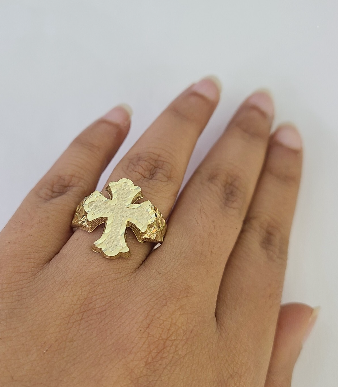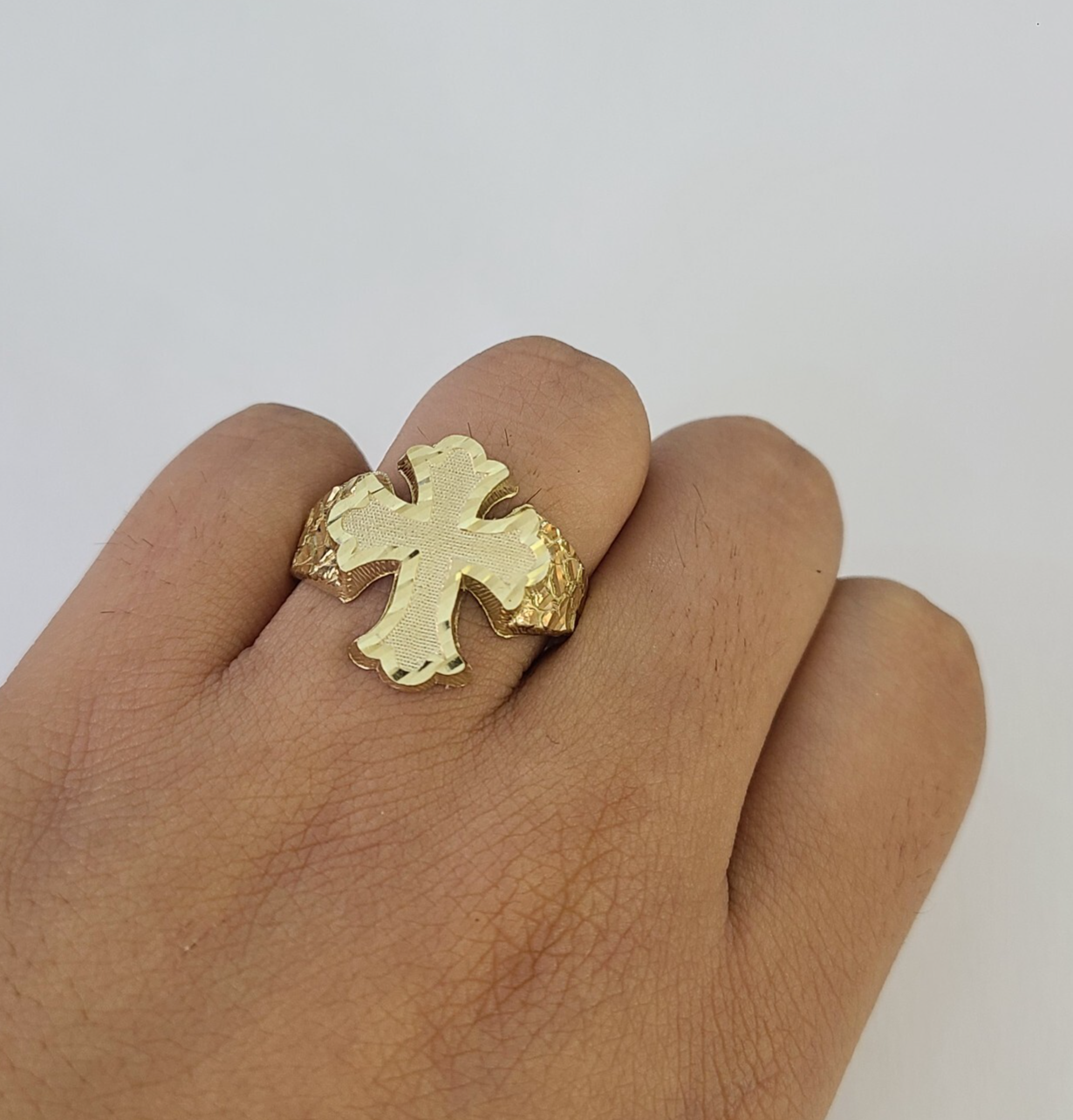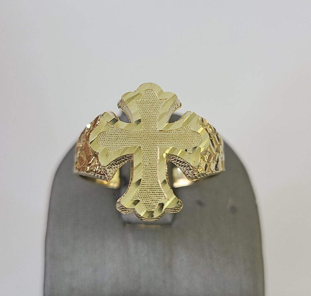 Real 10K Yellow Jesus Cross Nugget Gold Ring. The shape is Round, Traditional and Classic & Timeless. It flaunts Extra ordinary Design ring. It comes with standard size 12, and the ring is sizable. Sizing the ring will cost you extra $19.99 on your demand.