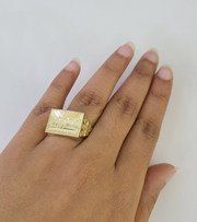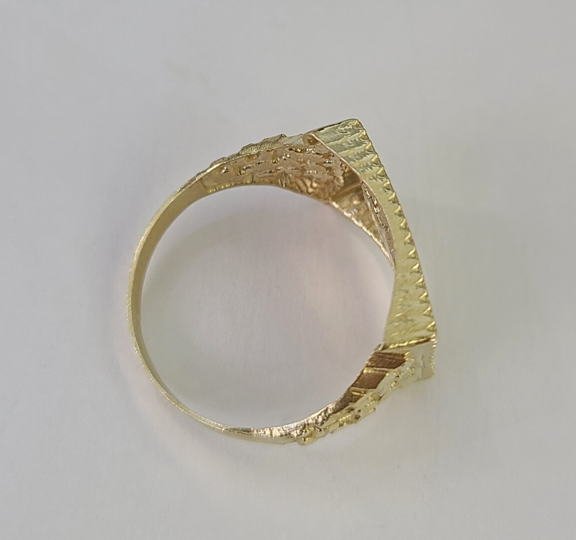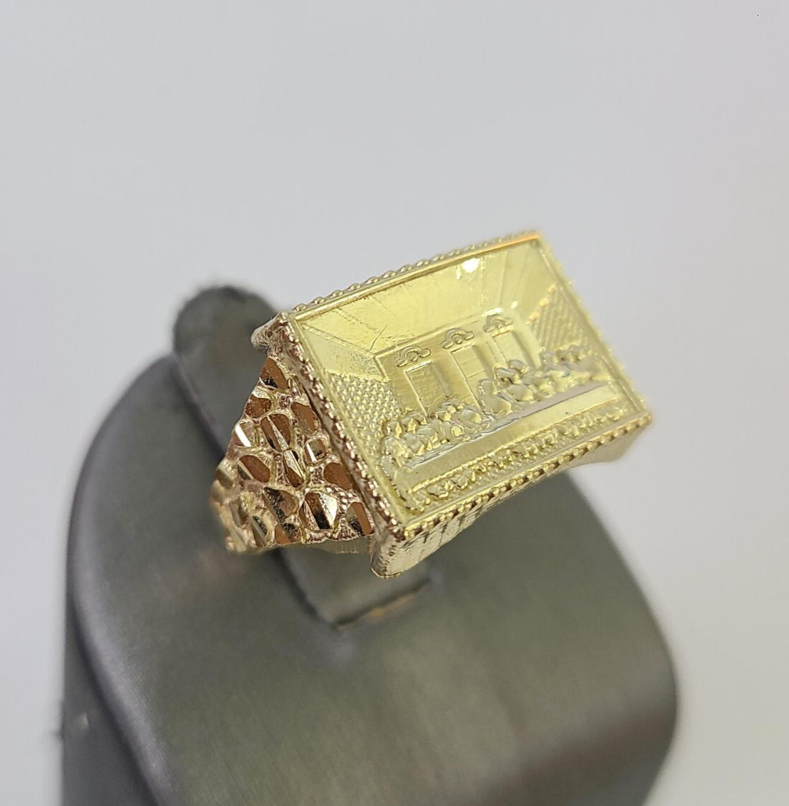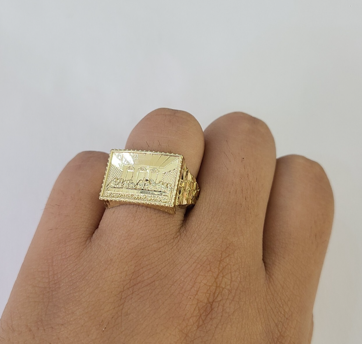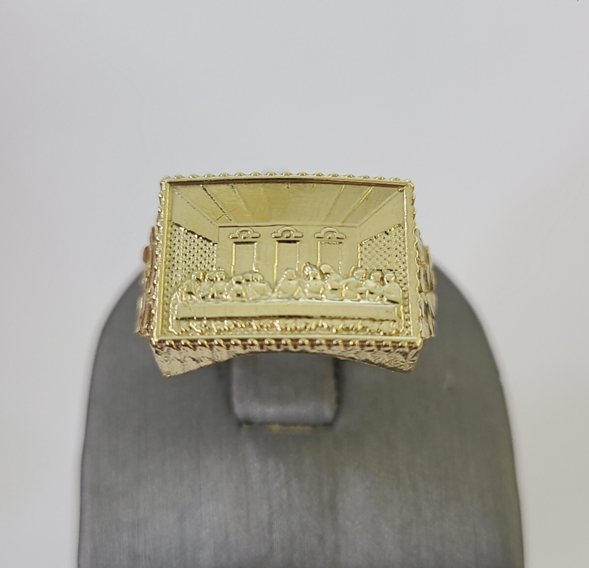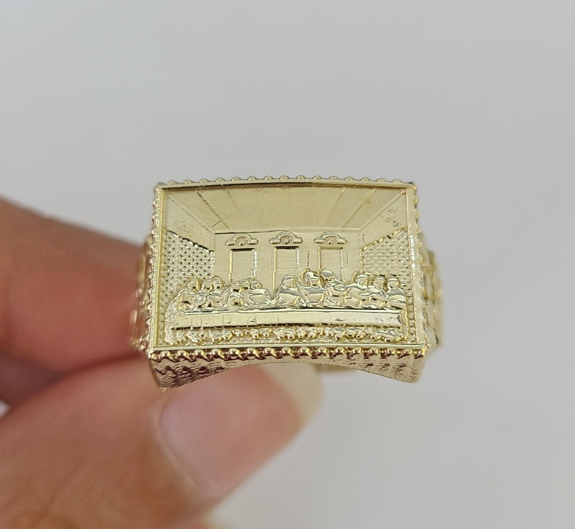 Real 10K Yellow Last Supper Gold Ring. The shape is Round, Traditional and Classic & Timeless. It flaunts Extra ordinary Design ring. It comes with standard size 11, and the ring is sizable. Sizing the ring will cost you extra $19.99 on your demand.