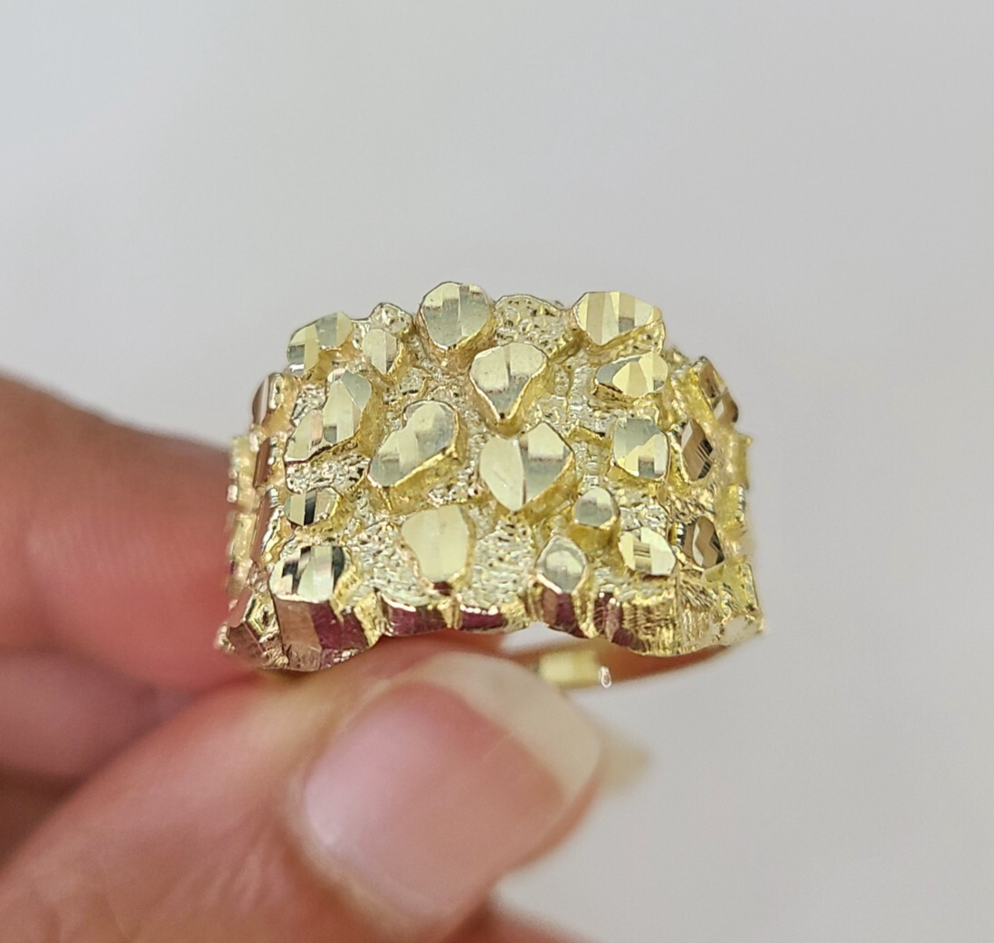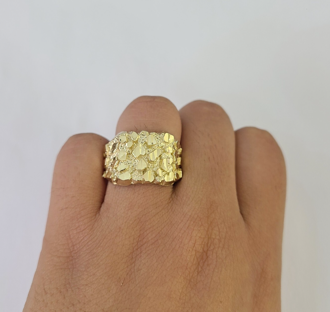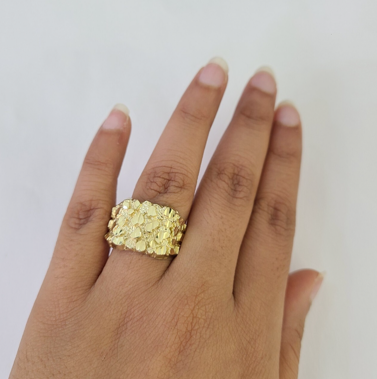Real 10K Yellow Nugget Gold Ring. The shape is Round, Traditional and Classic & Timeless. It flaunts Extra ordinary Design ring. It comes with standard size 11, and the ring is sizable. Sizing the ring will cost you extra $19.99 on your demand.