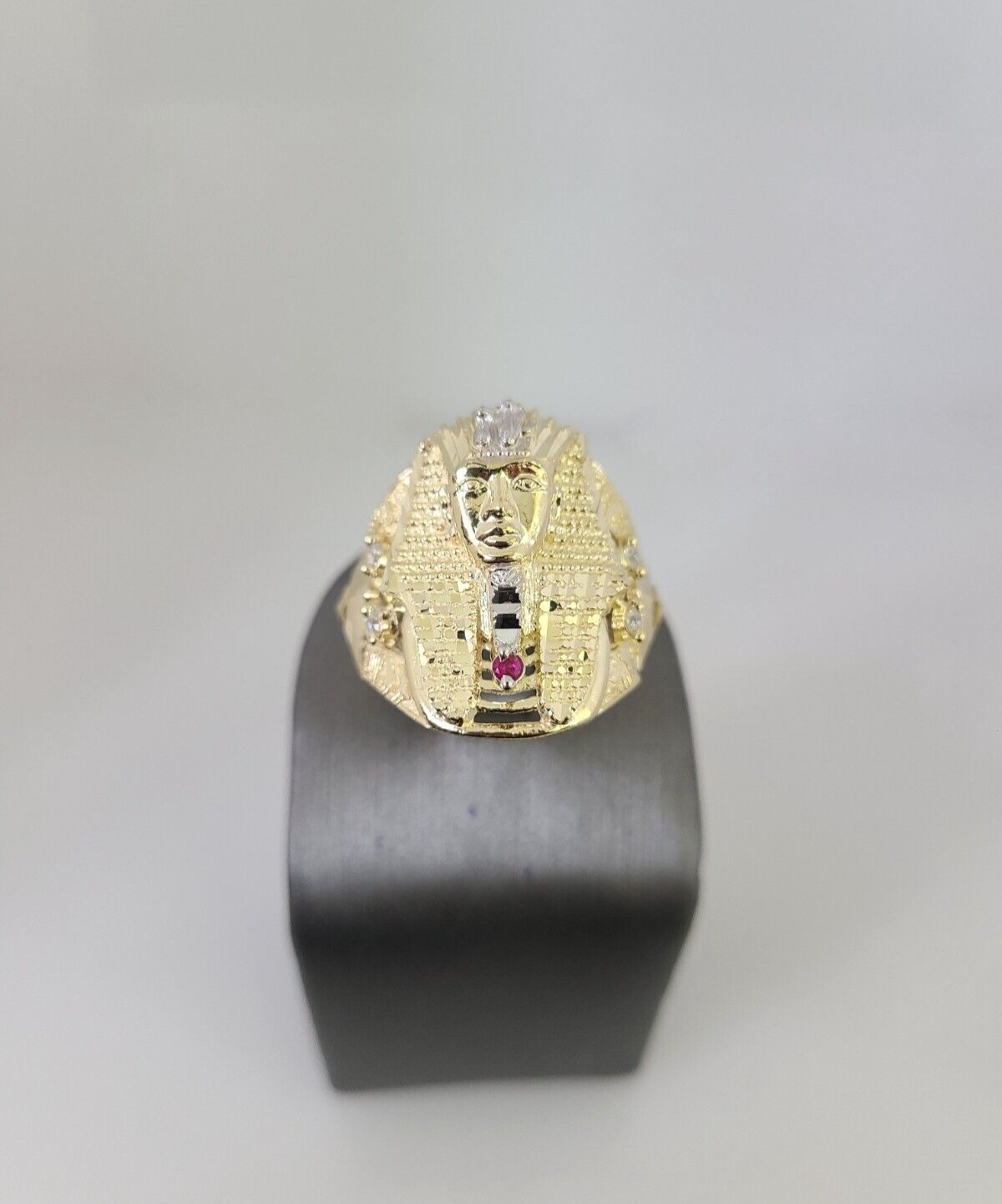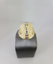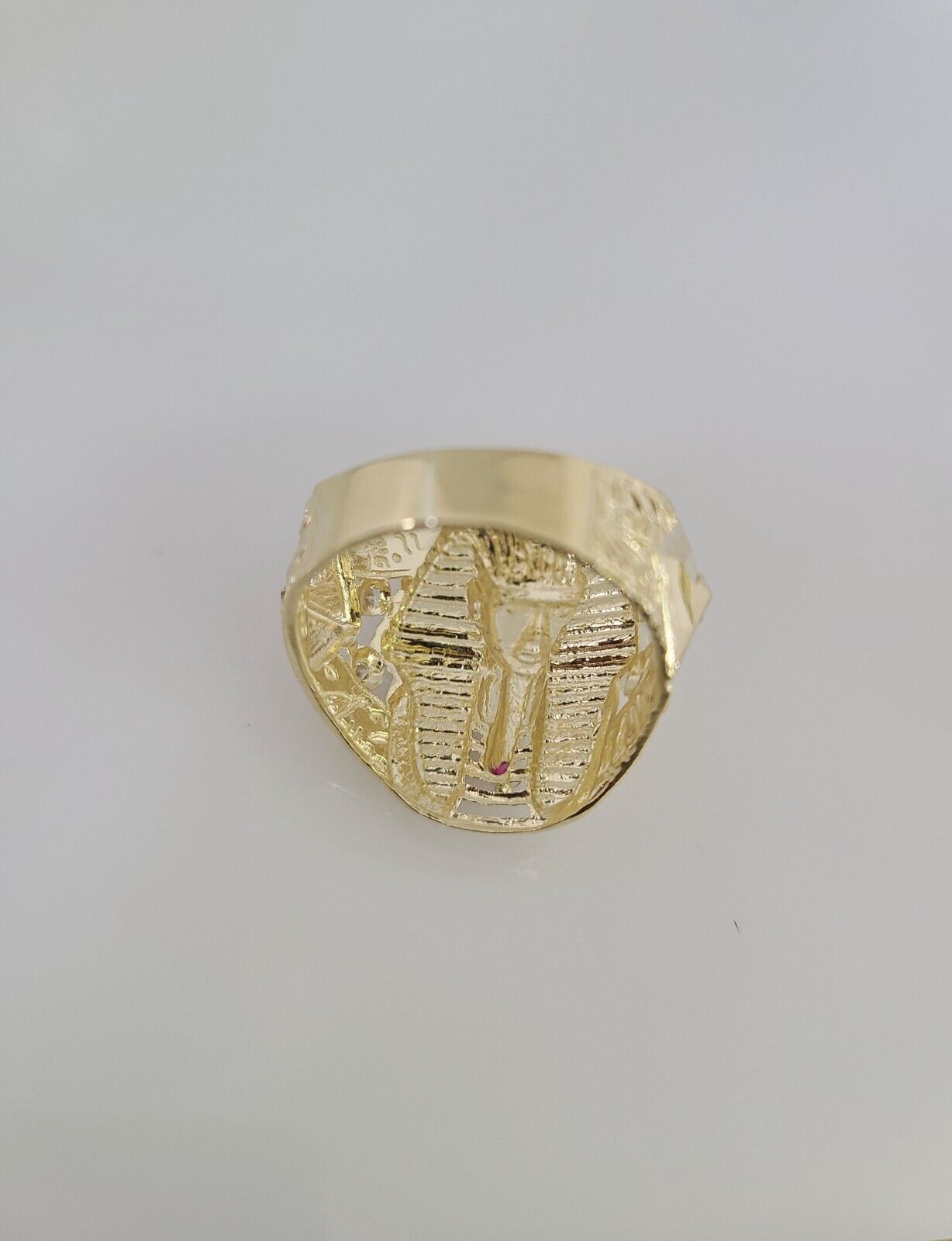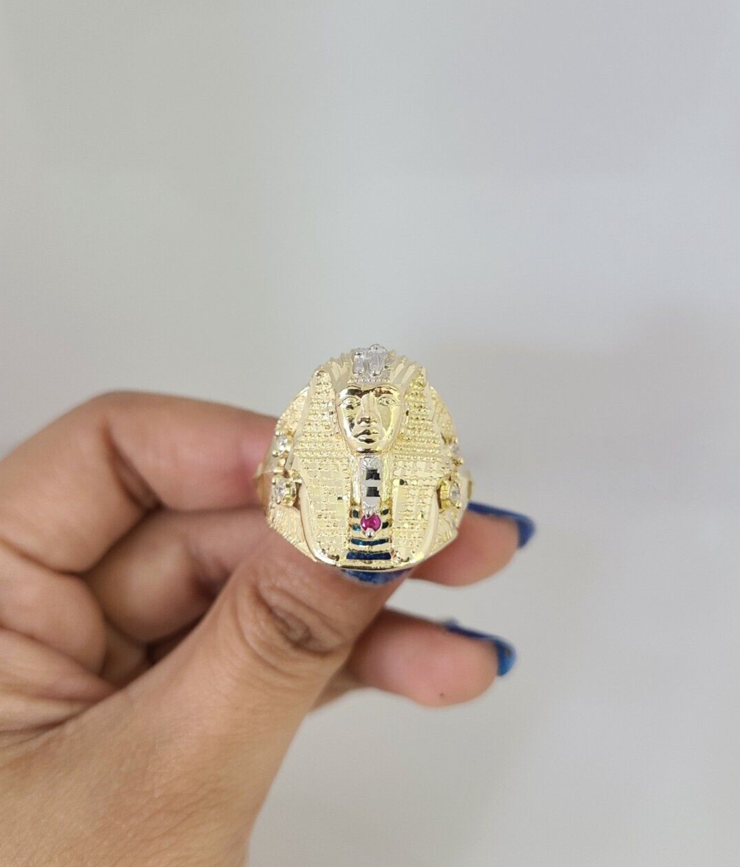 Real 10K Yellow Pharaoh Head Gold Ring for Men's. The Ring has a Excellent Cuts Which gives elegant look to the Big Ring . It comes with standard size 11.5, and the ring is sizable. Sizing the ring will cost you extra $29.99 on your demand.