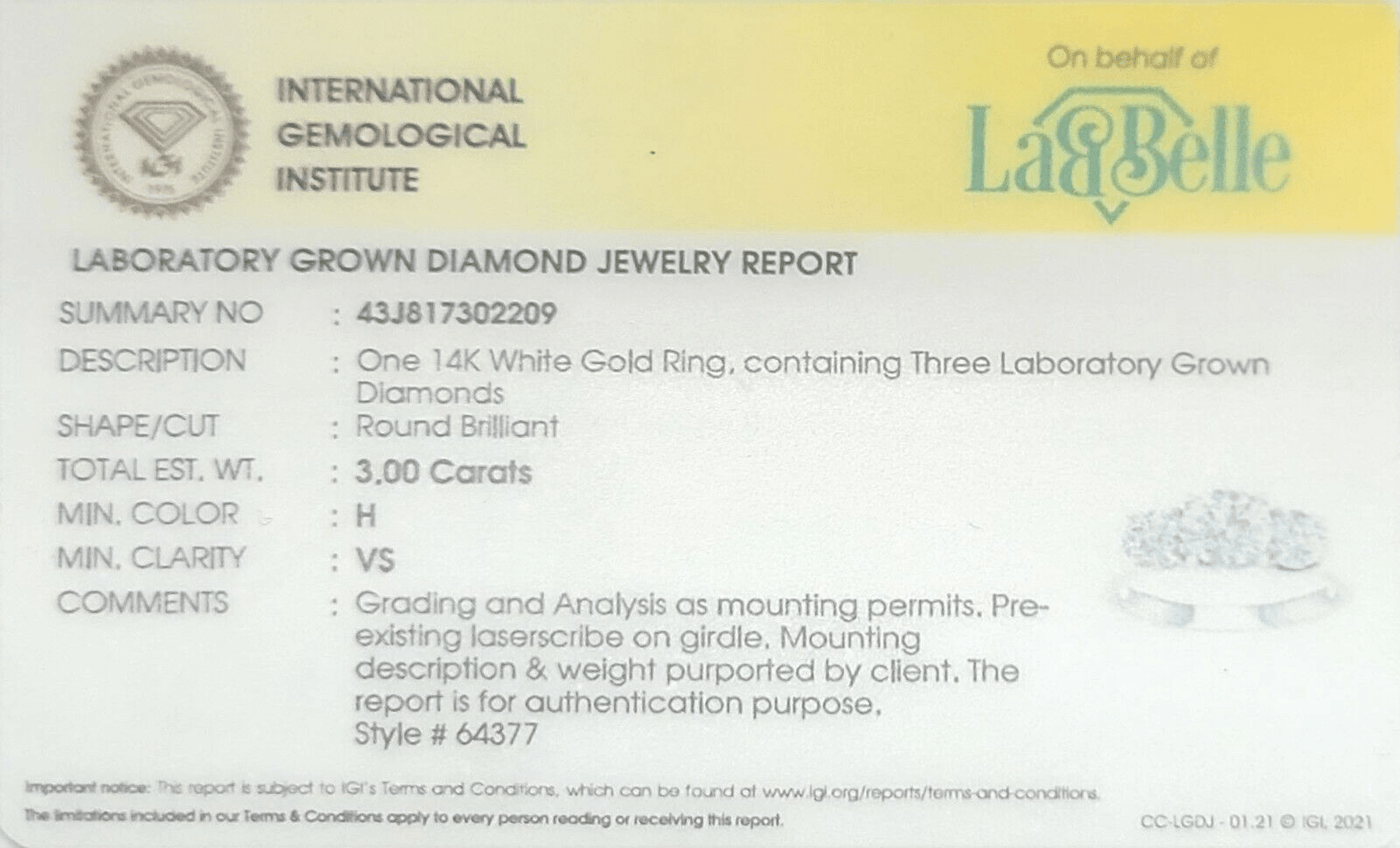 Real 14k White Gold IGI Certified 3 Diamond Ring 3CT Lab Grown Round VS Clarity