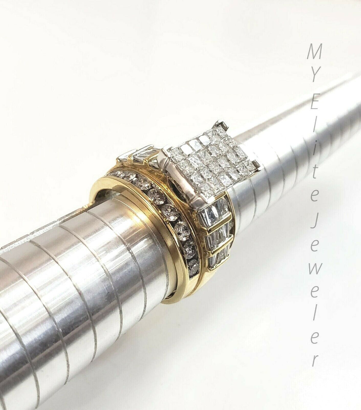 Real 14 K Yellow Gold and Real 2 CT Princess Cuts diamond Ring for Ladies. It has Round, Very Good Quality Diamonds SI2-SI1. The main Prong has princess cut Diamonds on the very top. The Ring's Side stone are round cut diamonds and Baguette diamonds runs through the upper sank. The ring comes with unique combination of all three different diamonds cut. The Diamonds are Well Cut. The shape of the diamond Ring is Round, Traditional and Classic & Timeless, it also comes with extra band ring. It flaunts Extra ordinary Bridal design ring. It comes with standard size 7, and the ring is sizable. Sizing the ring will cost you extra $29.99 on your demand.