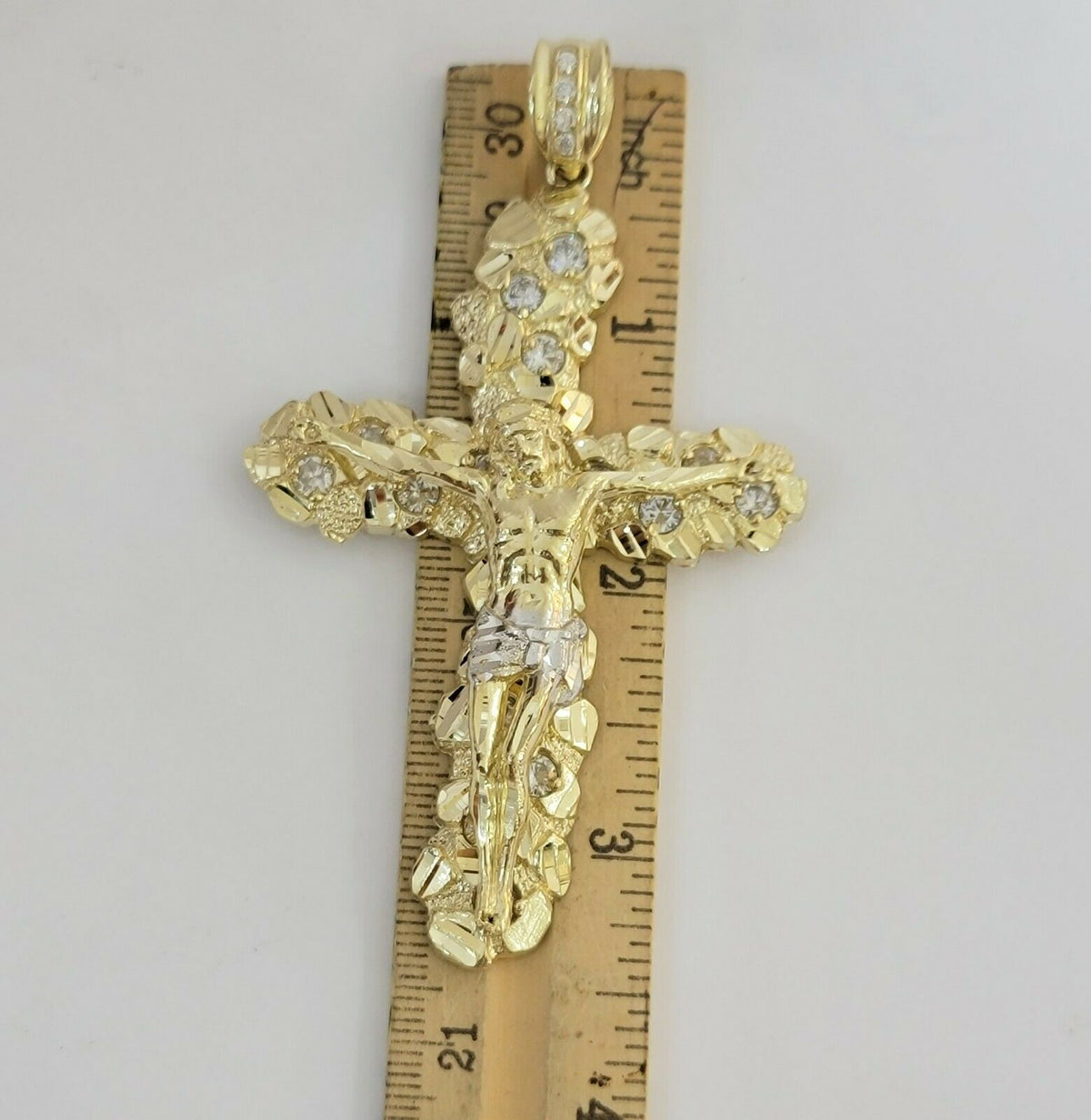 10 k Yellow Gold Real (Not plated , Not filled ) Jesus Crucifix Pendant For men's . The Length of the Pendant is 3.5 inches (approx. ) Long and 15-17 grams of approximate weight. The pendant can be worn with any chain. The pendant is considered durable. If you are not happy with the way it looks or feels, we do offer 30 - Days FREE Return shipping. Please note that this listing does not include a Necklace.