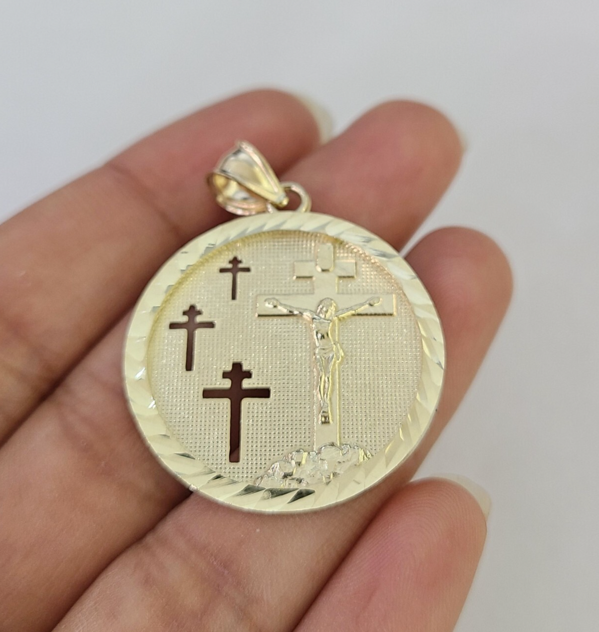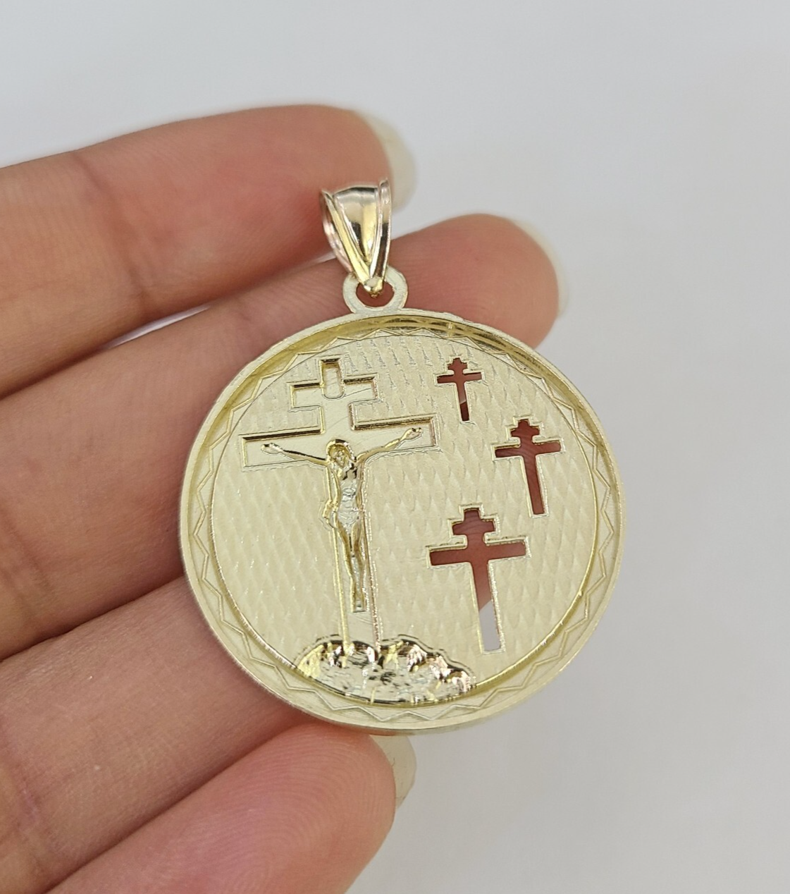 10k Yellow Gold Real (Not plated, Not filled) Jesus Crucifix Medallion Pendant. The pendant can be worn with any chain. The pendant is considered durable. If you are not happy with the way it looks or feels, we do offer 30 - Days FREE Return shipping. Please note that this listing does not include a Necklace.