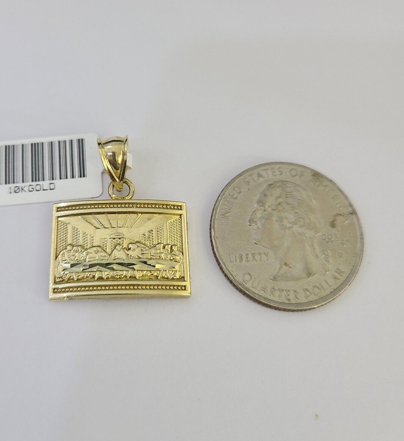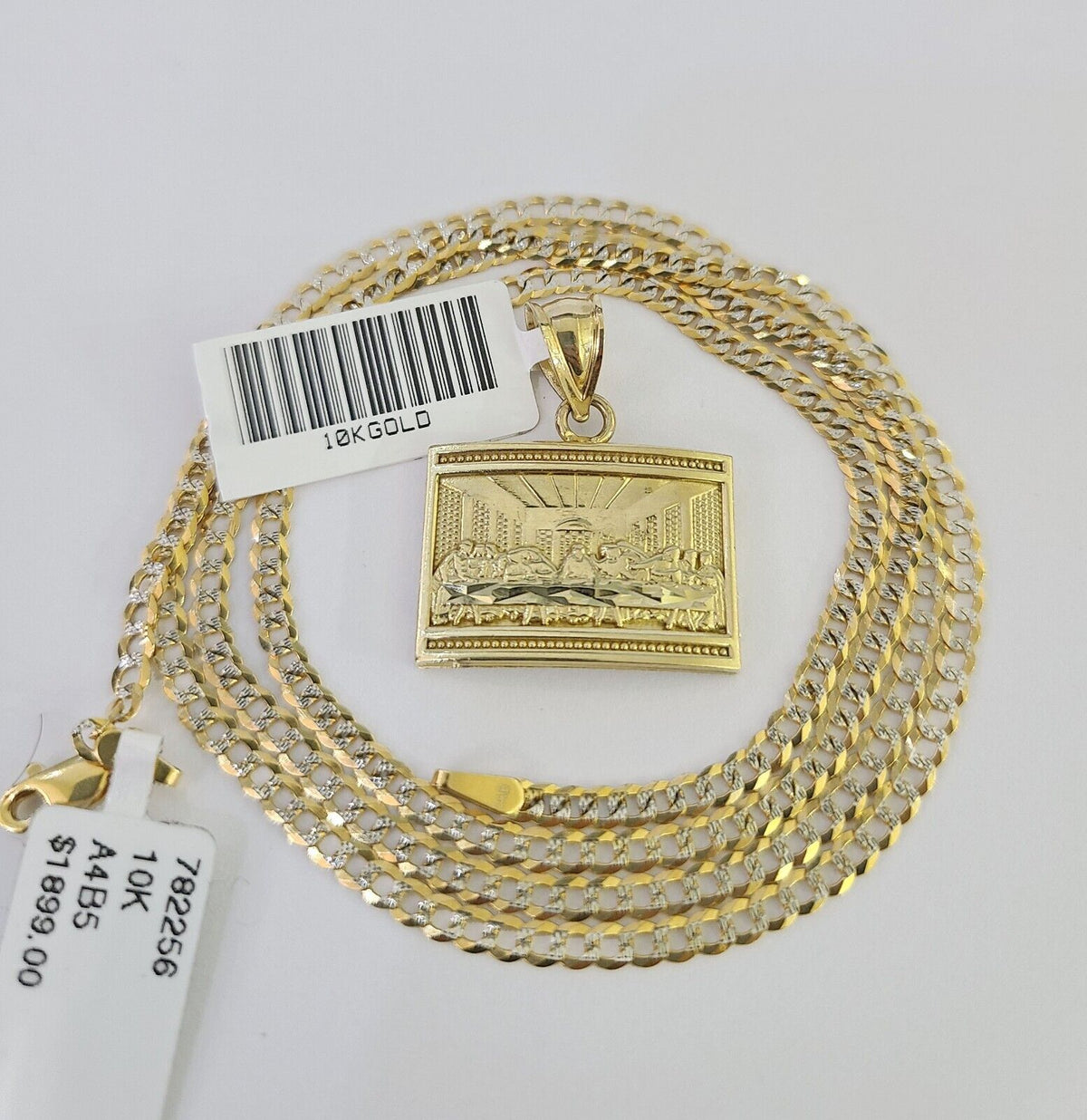We present You with This Absolutely Stunning Real 10k Yellow Gold SOLID Cuban Curb link Chain Diamond Cuts with Last Supper Charm. It has a detailed cut with a very good finish. These Beautiful Chains will not tarnish, discolor, or fade because they are Pure 10K Gold. Please feel free to contact us if you have any queries regarding the item. 24"-A4B5 A2B8 Ask