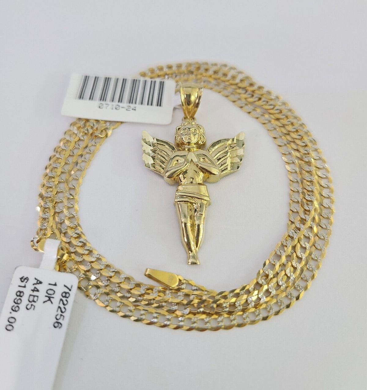 10k Solid Gold Cuban Curb Chain Praying Angel Pendant 2mm 18"-24" SET Necklace