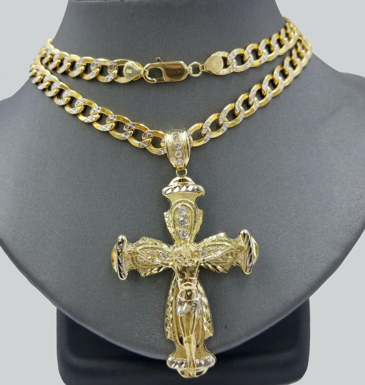 We present You with This Absolutely Stunning Real 10k Yellow Gold Cuban Link Chain with Jesus Cross Charm Pendant. It has a detailed cut with a very good finish.��These Beautiful Chain and Pendant will not tarnish, discolor, or fade because they are Pure 10K Gold. Please feel free to contact us if you have any queries regarding the item.��