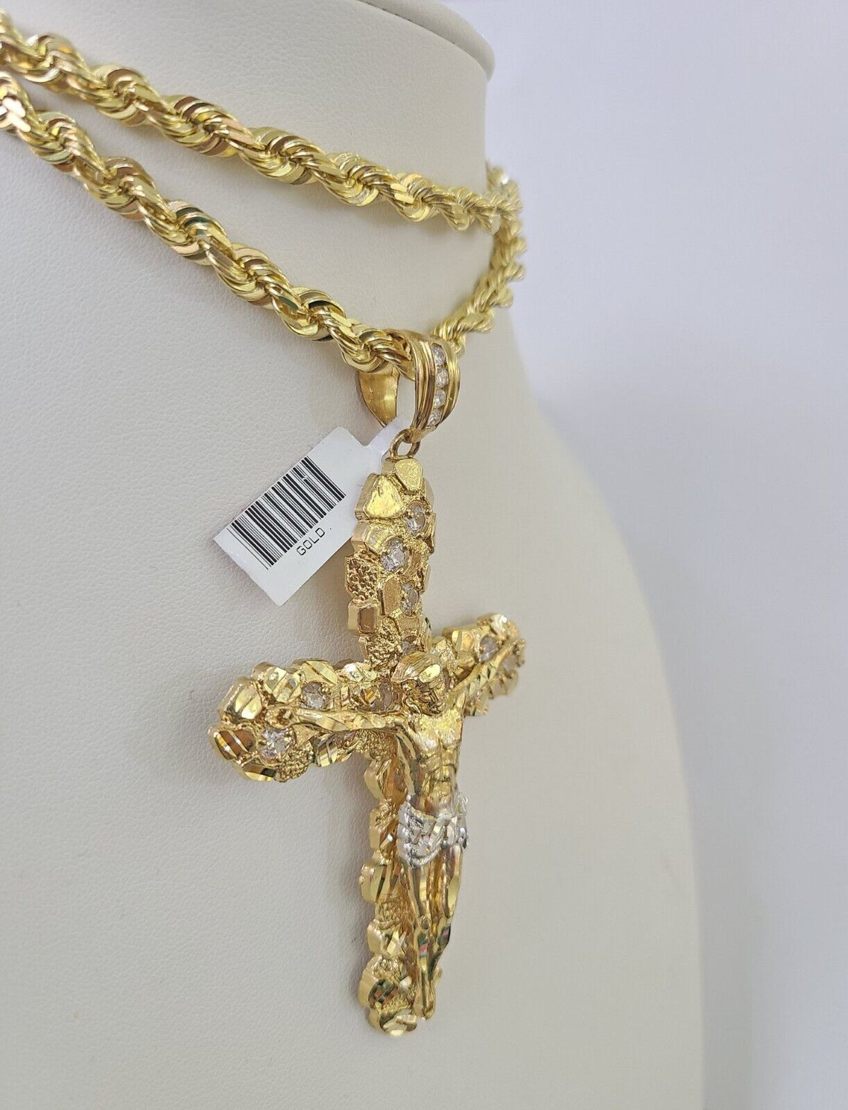 Is Presenting You with This Absolutely Stunning Real 14k Yellow Gold Solid Rope Chain 6mm, 18 inch-30 inches, Lobster Lock with a 14k Jesus Cross Pendant. These Beautiful chains and Pendant will not tarnish, discolor, or fade because they are Pure 14K Gold. We also have them in various another length and sizes. 22"-A57B7 A17B7