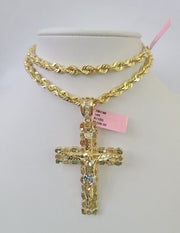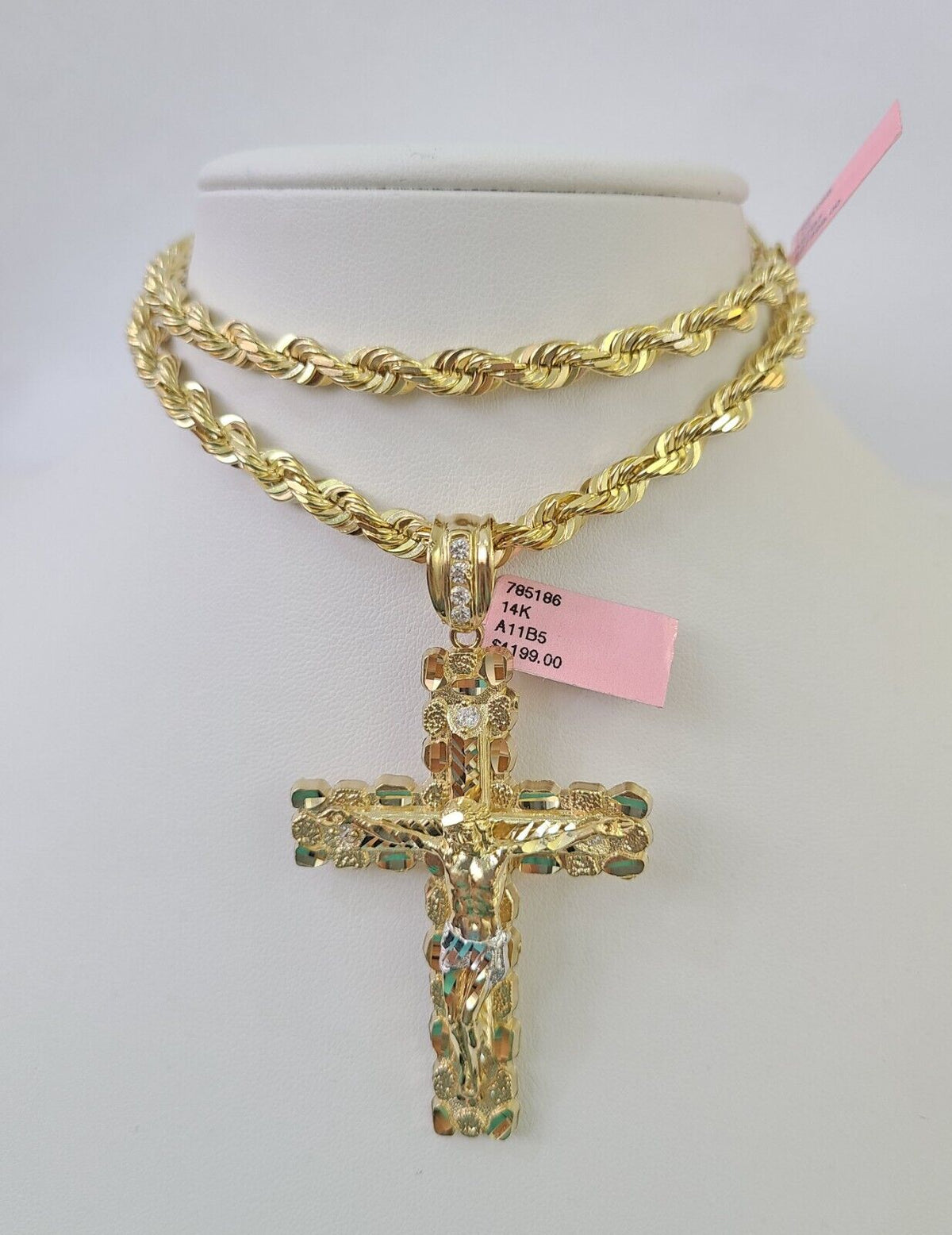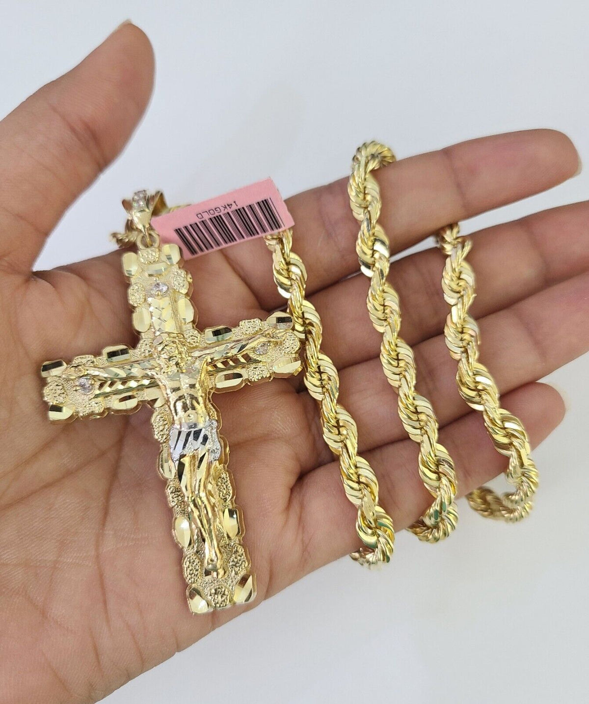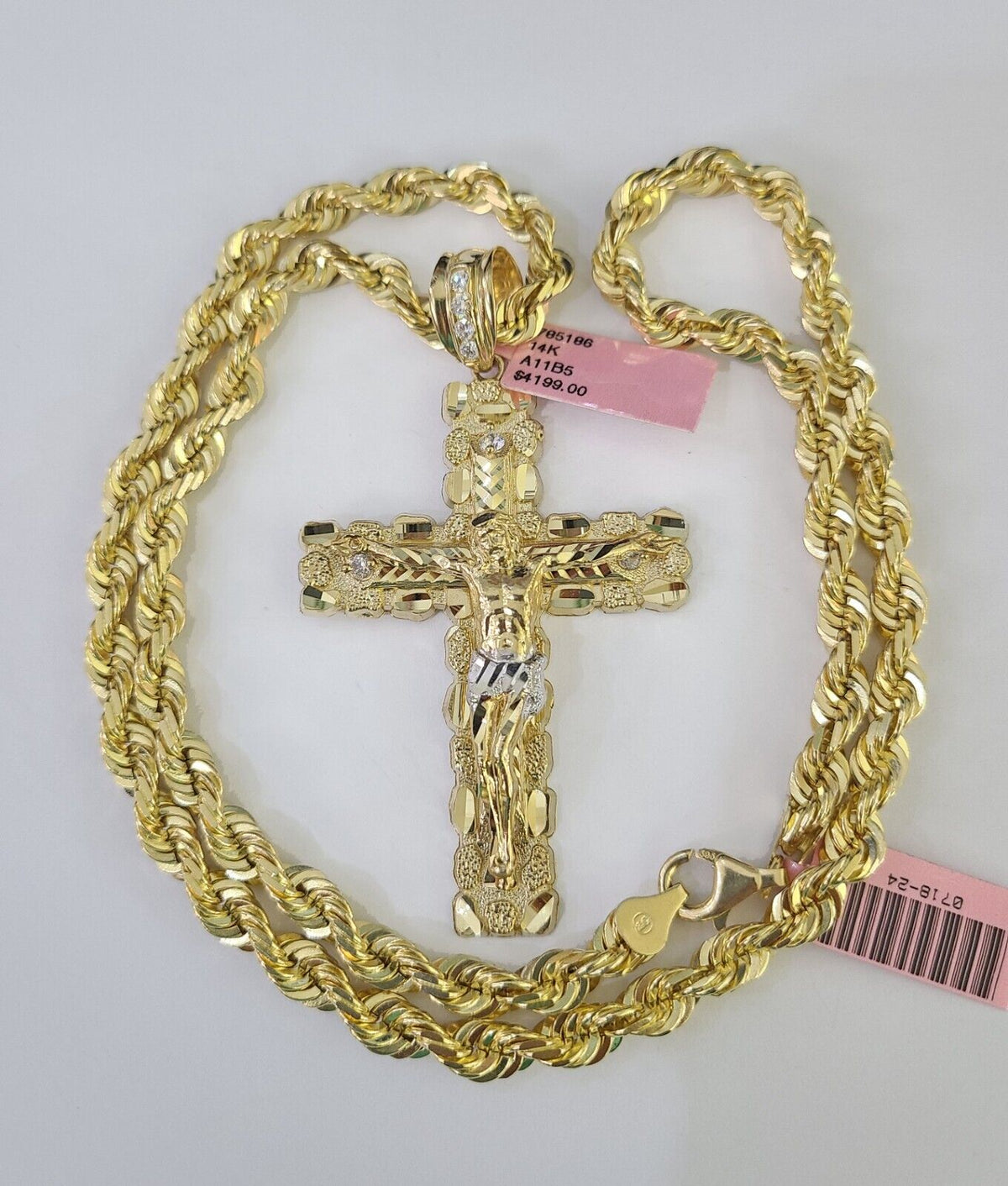 Is Presenting You with This Absolutely Stunning Real 14k Yellow Gold Solid Rope Chain 6mm, 18 inch-30 inches, Lobster Lock with a 14k Jesus Cross Pendant. These Beautiful chains and Pendant will not tarnish, discolor, or fade because they are Pure 14K Gold. We also have them in various another length and sizes. 22"-A57B7 A11B5